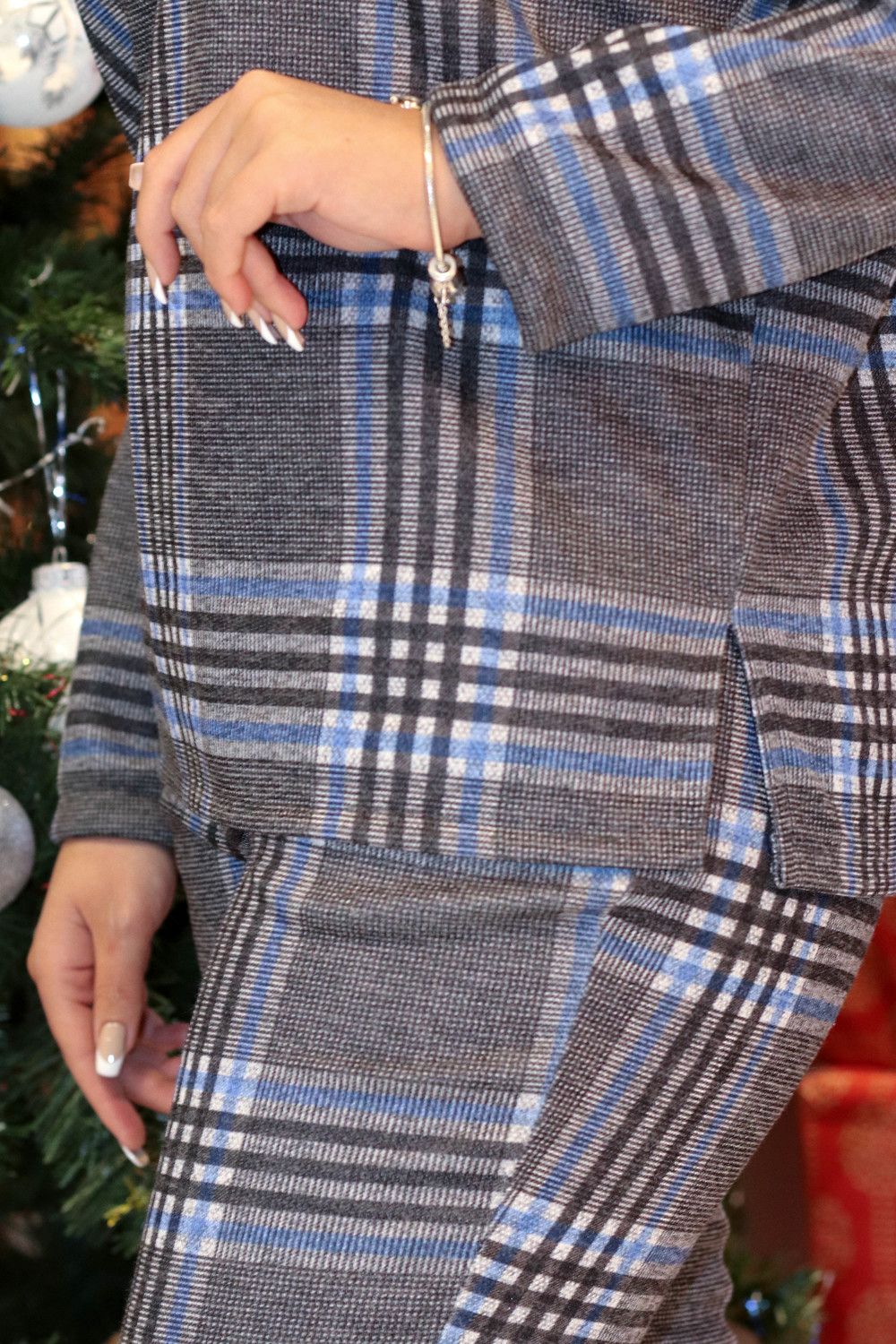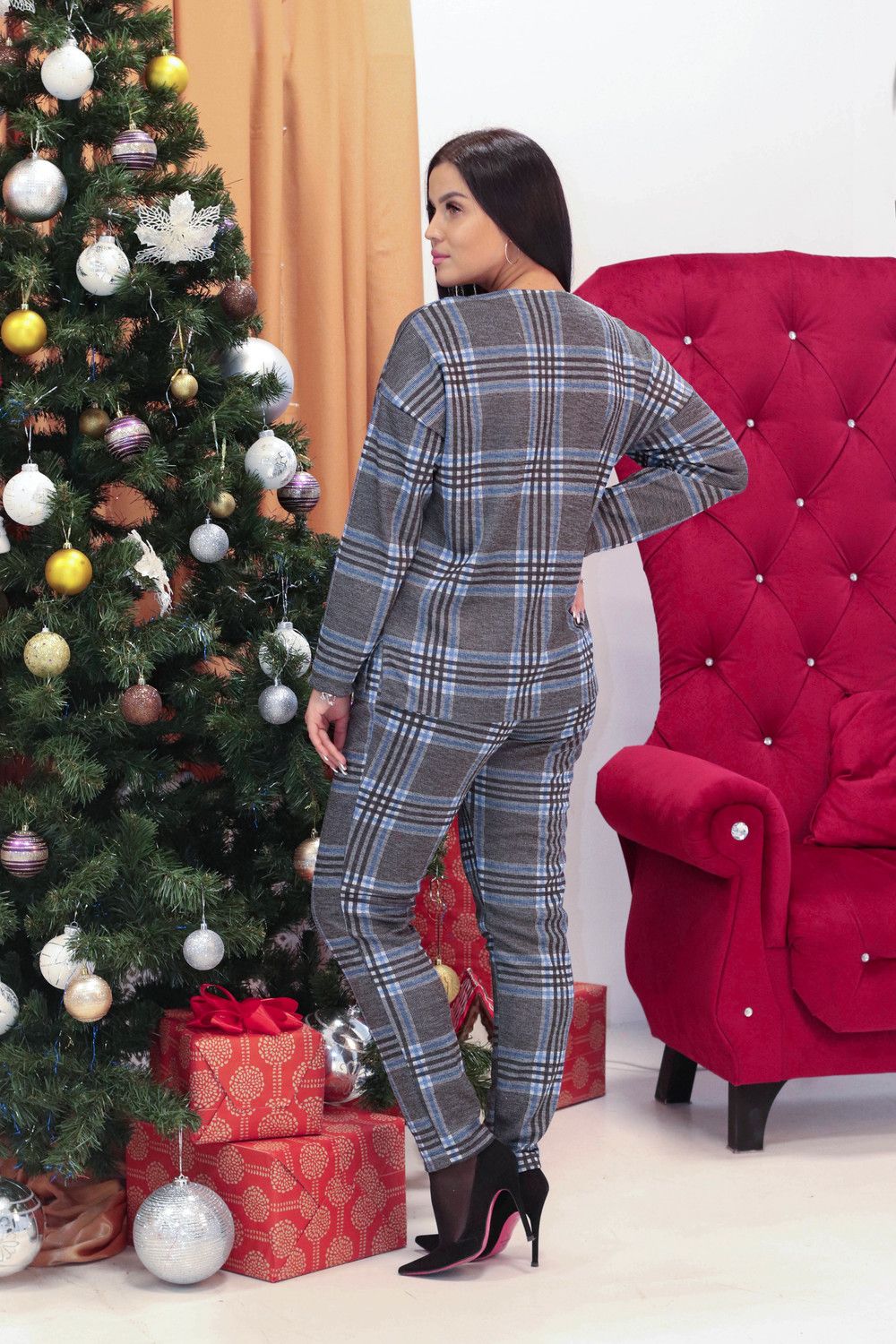 Костюм-двойка, состоящий из свободного жакета и брюк. Жакет прямого кроя с разрезами по бокам, без пуговиц и застежек, с длинным рукавом. Ткань теплая, плотная, мягкая, смесовая. Костюм удобный, легкий, теплый, комфортный, совершенно не сковывающий движений.