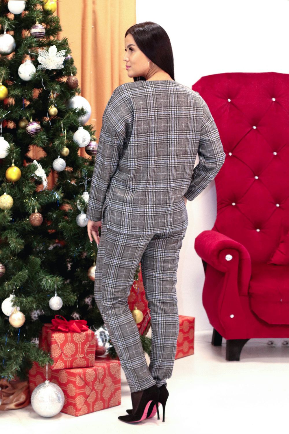 Костюм-двойка, состоящий из свободного жакета и брюк. Жакет прямого кроя с разрезами по бокам, без пуговиц и застежек, с длинным рукавом. Ткань теплая, плотная, мягкая, смесовая. Костюм удобный, легкий, теплый, комфортный, совершенно не сковывающий движений.