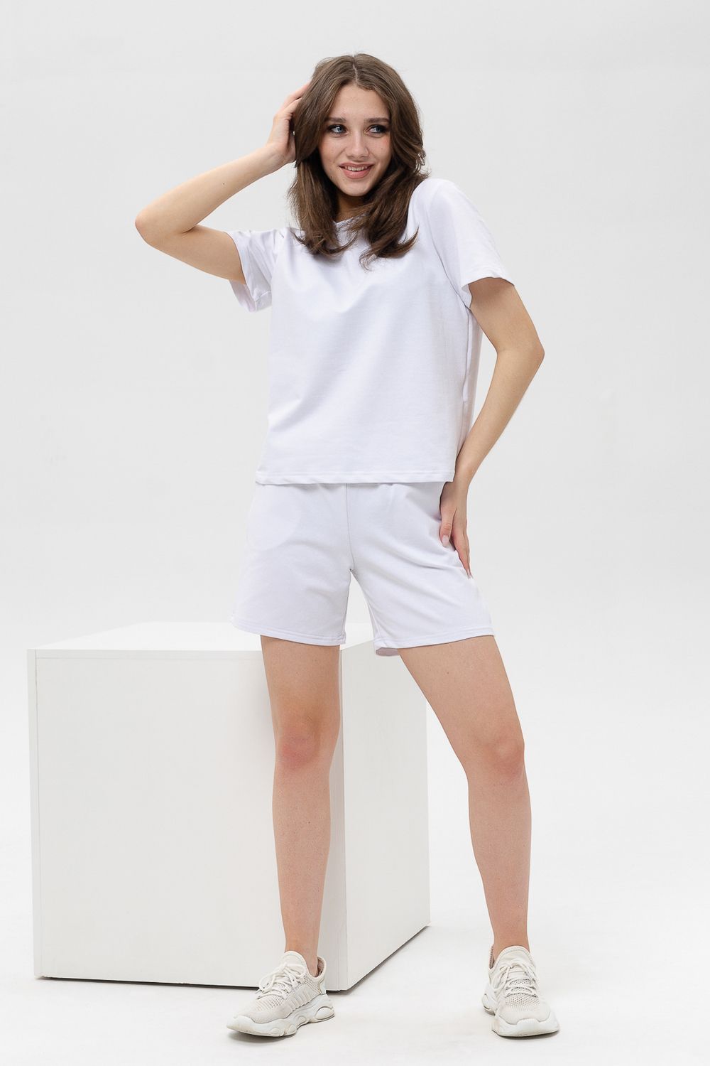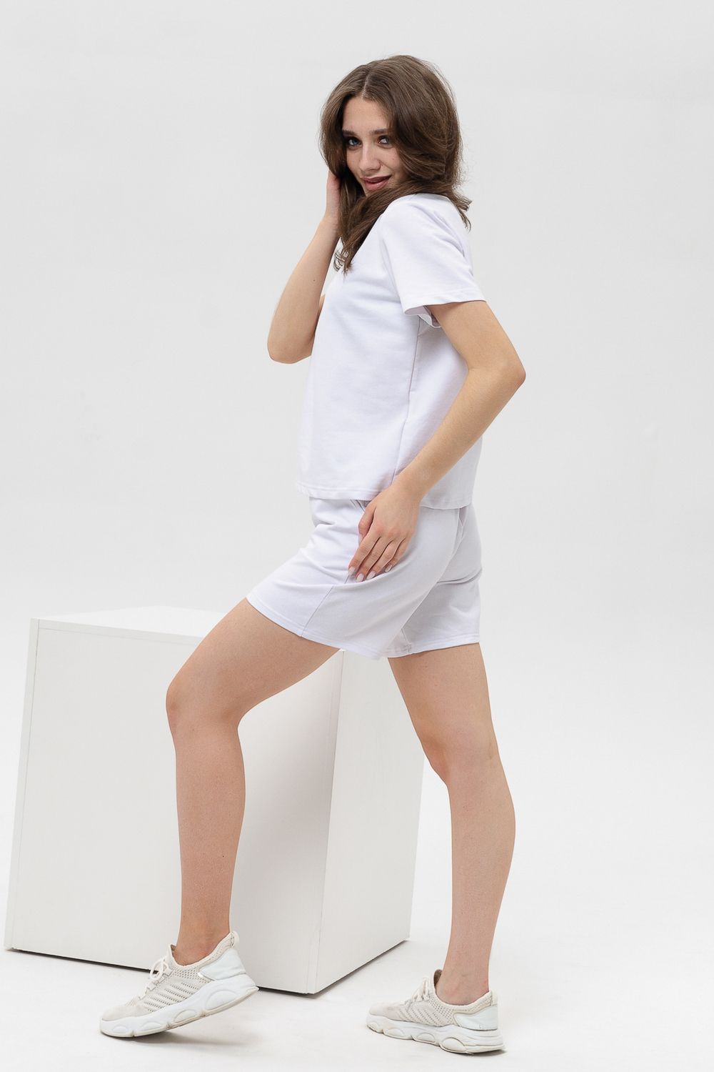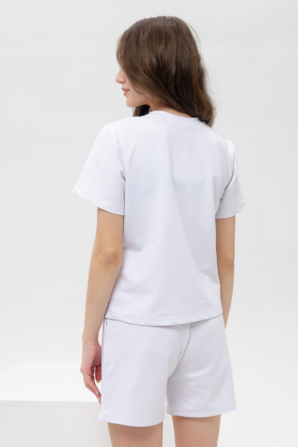 Женский костюм из футболки с шортами. Верх: однотонная футболка с коротким рукавом. Комфортная футболка для дома и занятий спортом. Актуальный крой и трендовые расцветки модели делают её универсальной для летнего гардероба. Низ: Шорты свободного покроя с карманами. Костюм спортивный в приятных модных расцветках. Комплект будет идеально смотреться как домашний и как спортивный на летний сезон. Костюм сшит из футера. Это износостойкая, приятная на ощупь, мягкая ткань из натурального хлопка. За ней легко ухаживать.