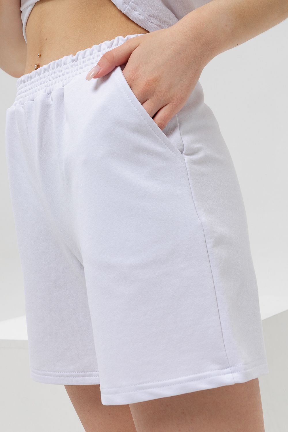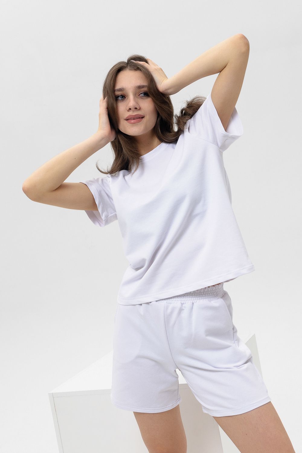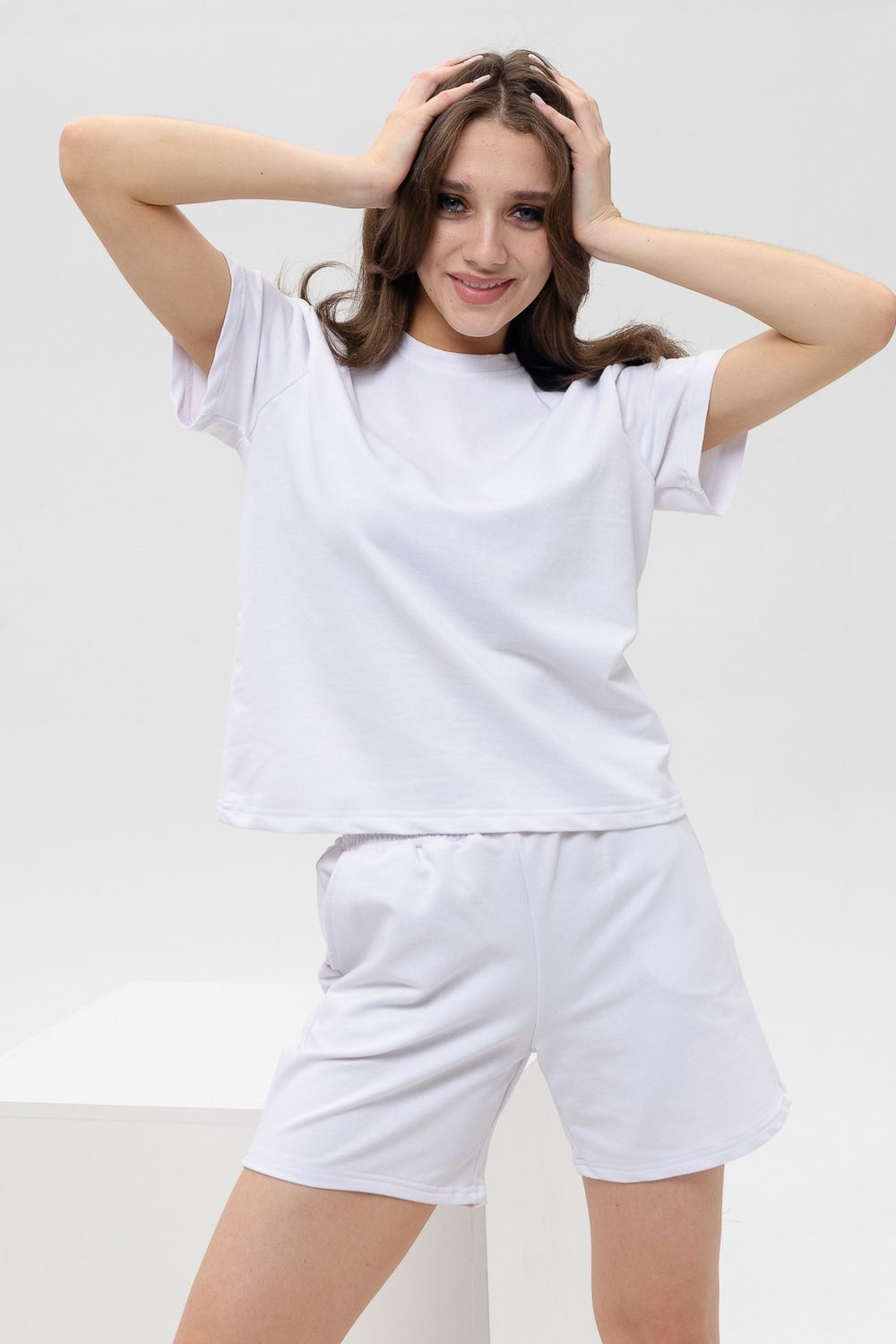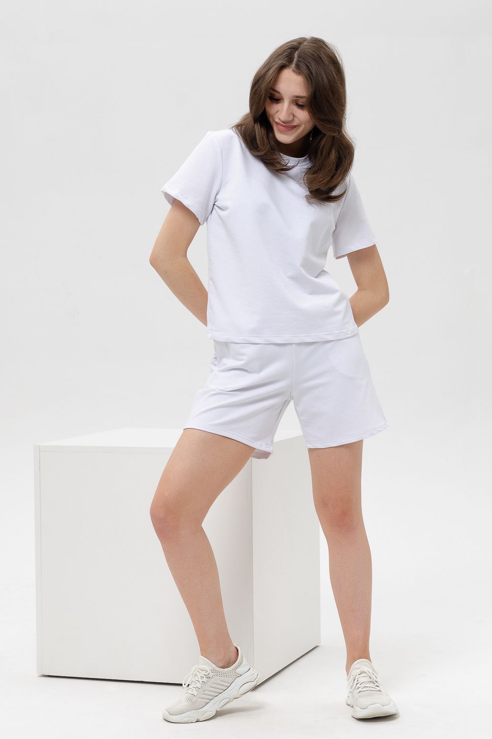 Женский костюм из футболки с шортами. Верх: однотонная футболка с коротким рукавом. Комфортная футболка для дома и занятий спортом. Актуальный крой и трендовые расцветки модели делают её универсальной для летнего гардероба. Низ: Шорты свободного покроя с карманами. Костюм спортивный в приятных модных расцветках. Комплект будет идеально смотреться как домашний и как спортивный на летний сезон. Костюм сшит из футера. Это износостойкая, приятная на ощупь, мягкая ткань из натурального хлопка. За ней легко ухаживать.