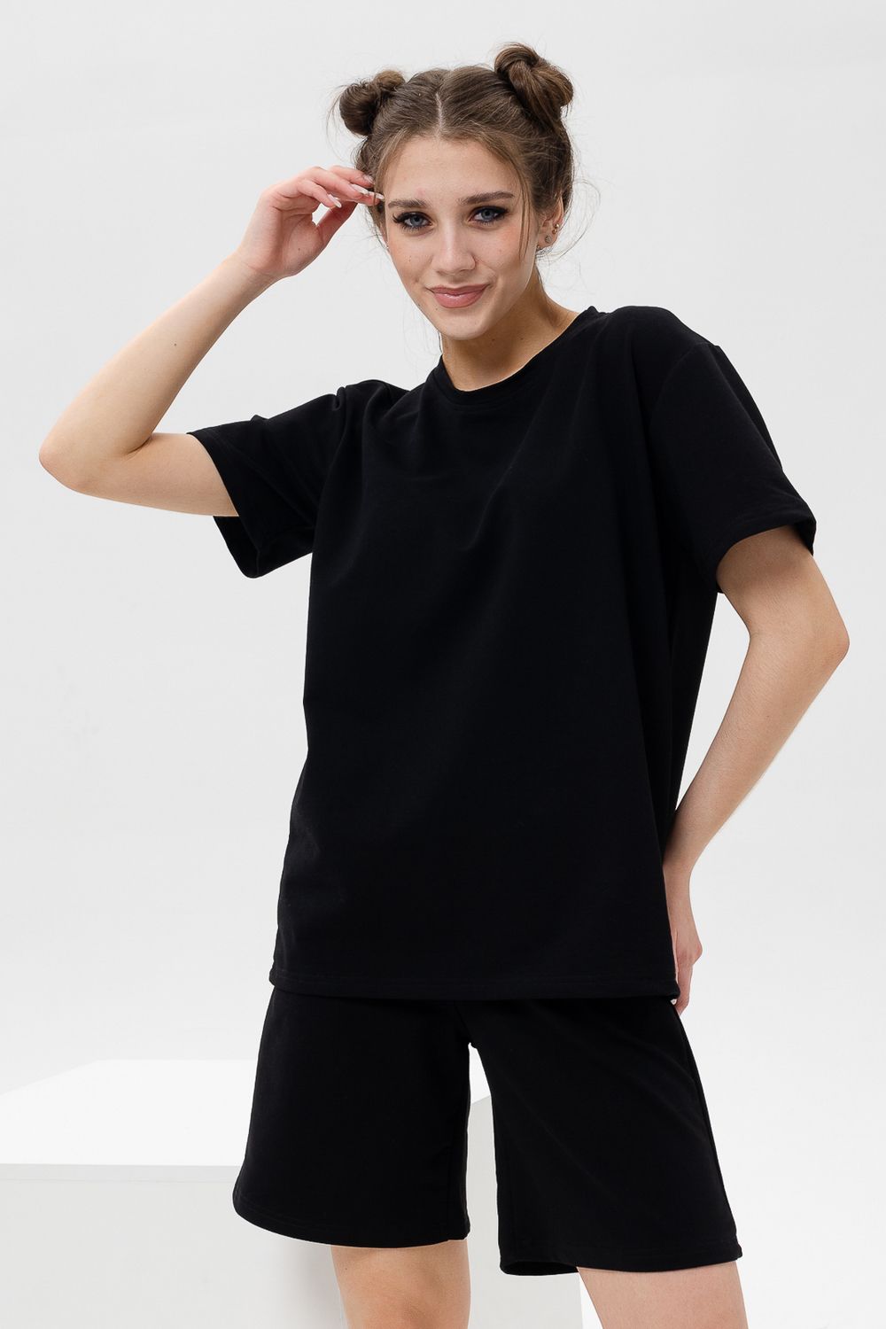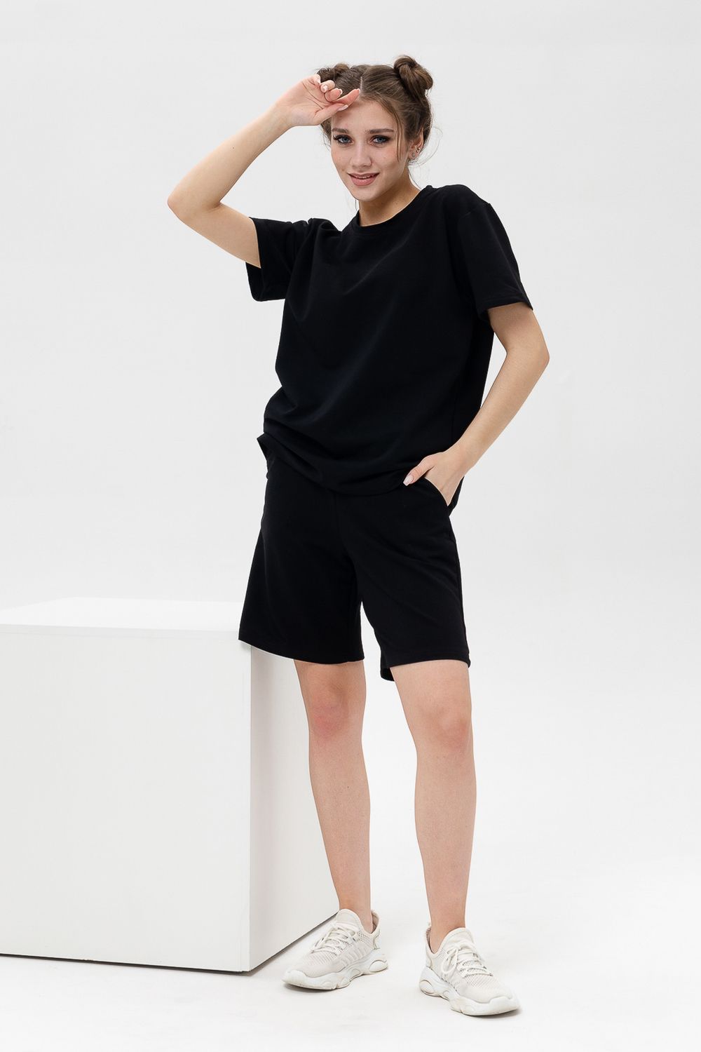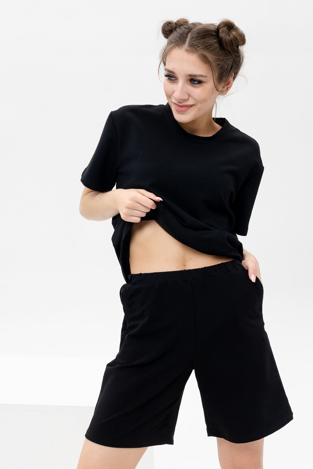 Женский костюм из футболки с шортами. Верх: однотонная футболка с коротким рукавом. Комфортная футболка для дома и занятий спортом. Актуальный крой и трендовые расцветки модели делают её универсальной для летнего гардероба. Низ: Шорты свободного покроя с карманами. Костюм спортивный в приятных модных расцветках. Комплект будет идеально смотреться как домашний и как спортивный на летний сезон. Костюм сшит из футера. Это износостойкая, приятная на ощупь, мягкая ткань из натурального хлопка. За ней легко ухаживать