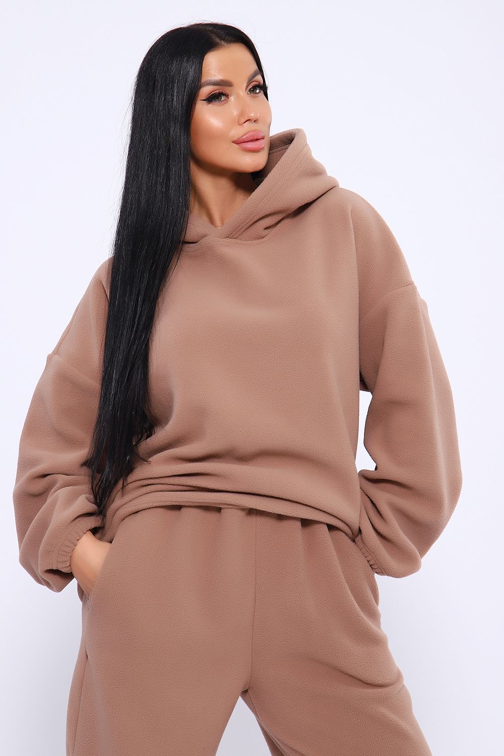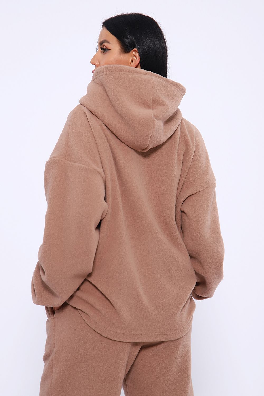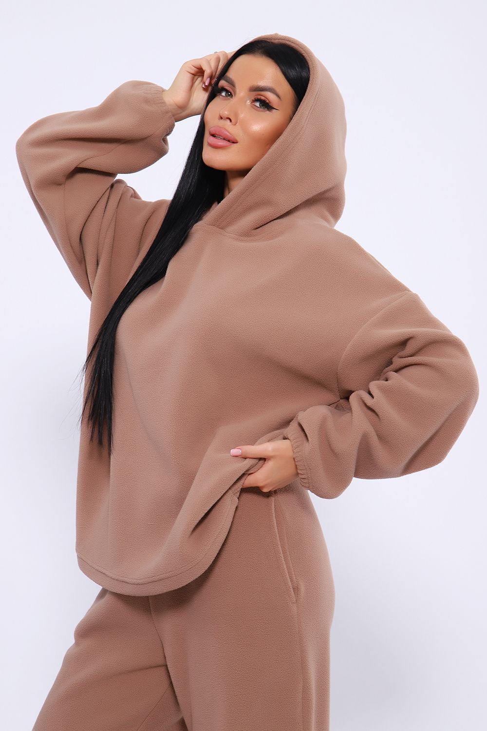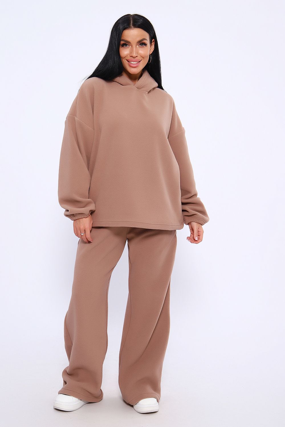 Флисовый костюм - решение для активных людей, которые проводят много времени на улице. Благодаря потрясающим теплоизоляционным свойствам, флисовый костюм отличный выбором зимнего сезона. Он защитит вас от мороза, обеспечивая вам ощущение тепла и уюта. Худи женское оверсайз с капюшоном и мягкой резинкой на рукавах, брюки женские с высокой посадкой на резинке прямого кроя с прорезными карманами. Костюм в плюс-сайз размерах, обеспечивая комфорт и свободу движений