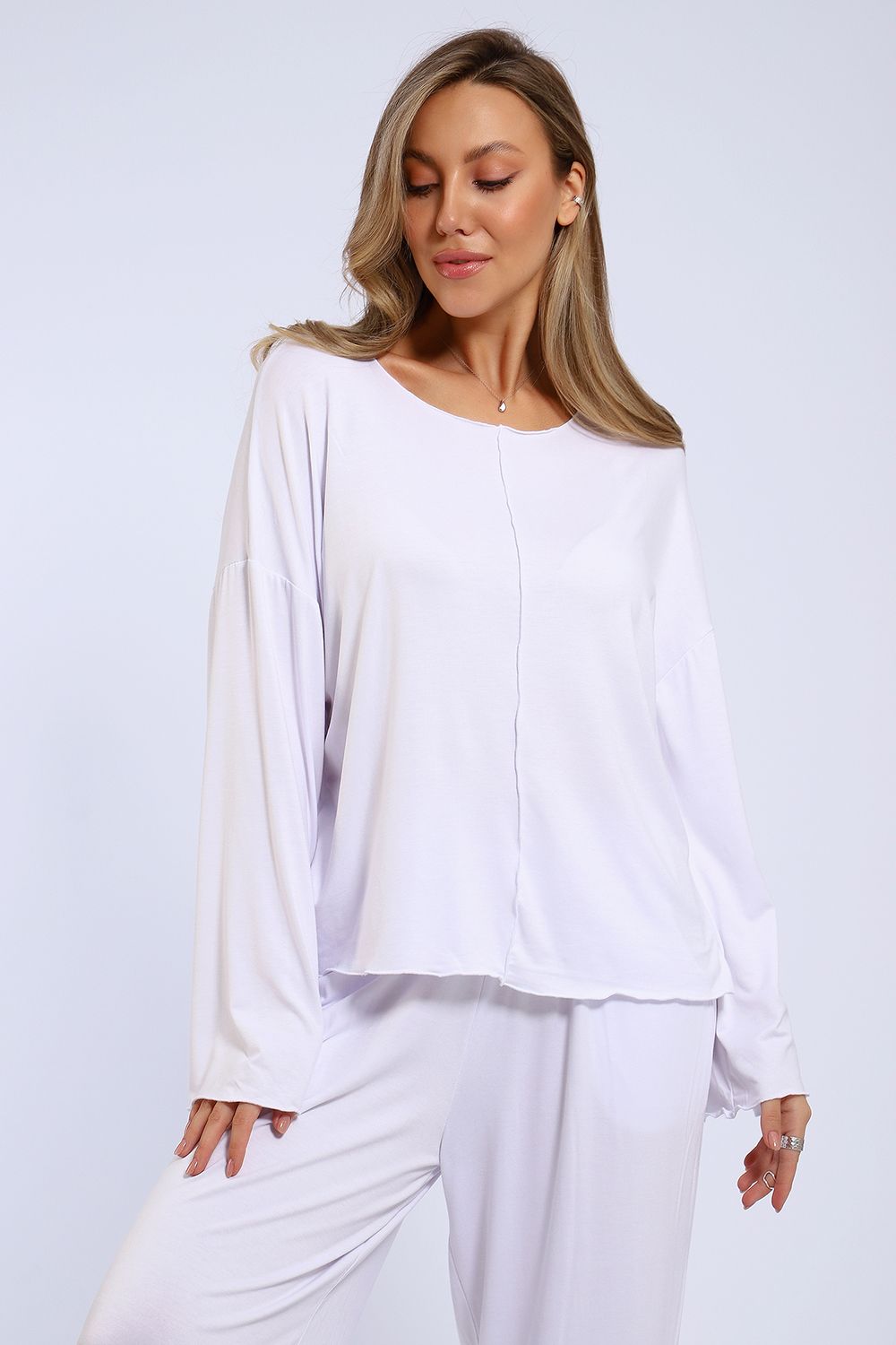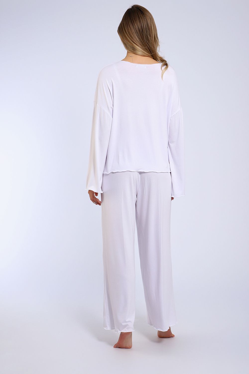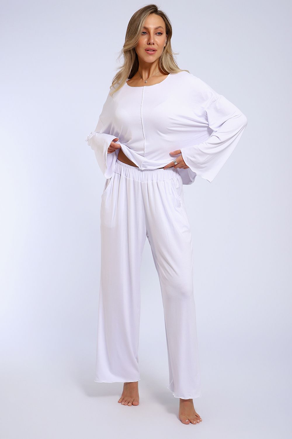 Костюм состоит из кофты и брюк. Кофта свободного кроя с длинными расклешенными рукавами. Брюки свободные прямые с карманами.