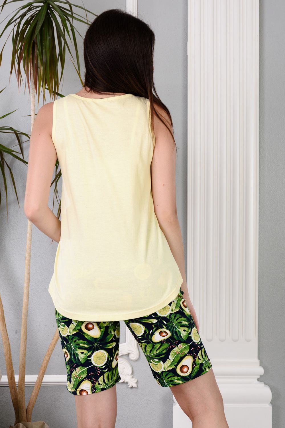 Нежный женский костюм из 100% хлопка - комплект из удлиненных шортиков и майки. Скругленная линия подола спереди и сзади. Разница в длине спинки и полочки в 19 см. На шортах глубокие удобные карманы. Принт - авокадо.