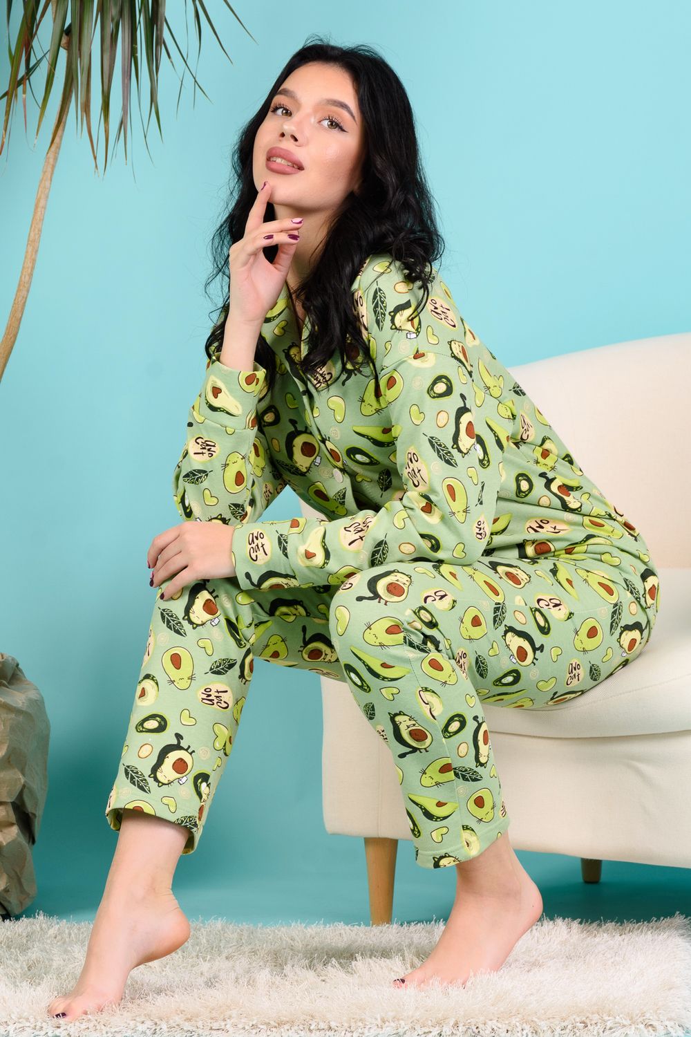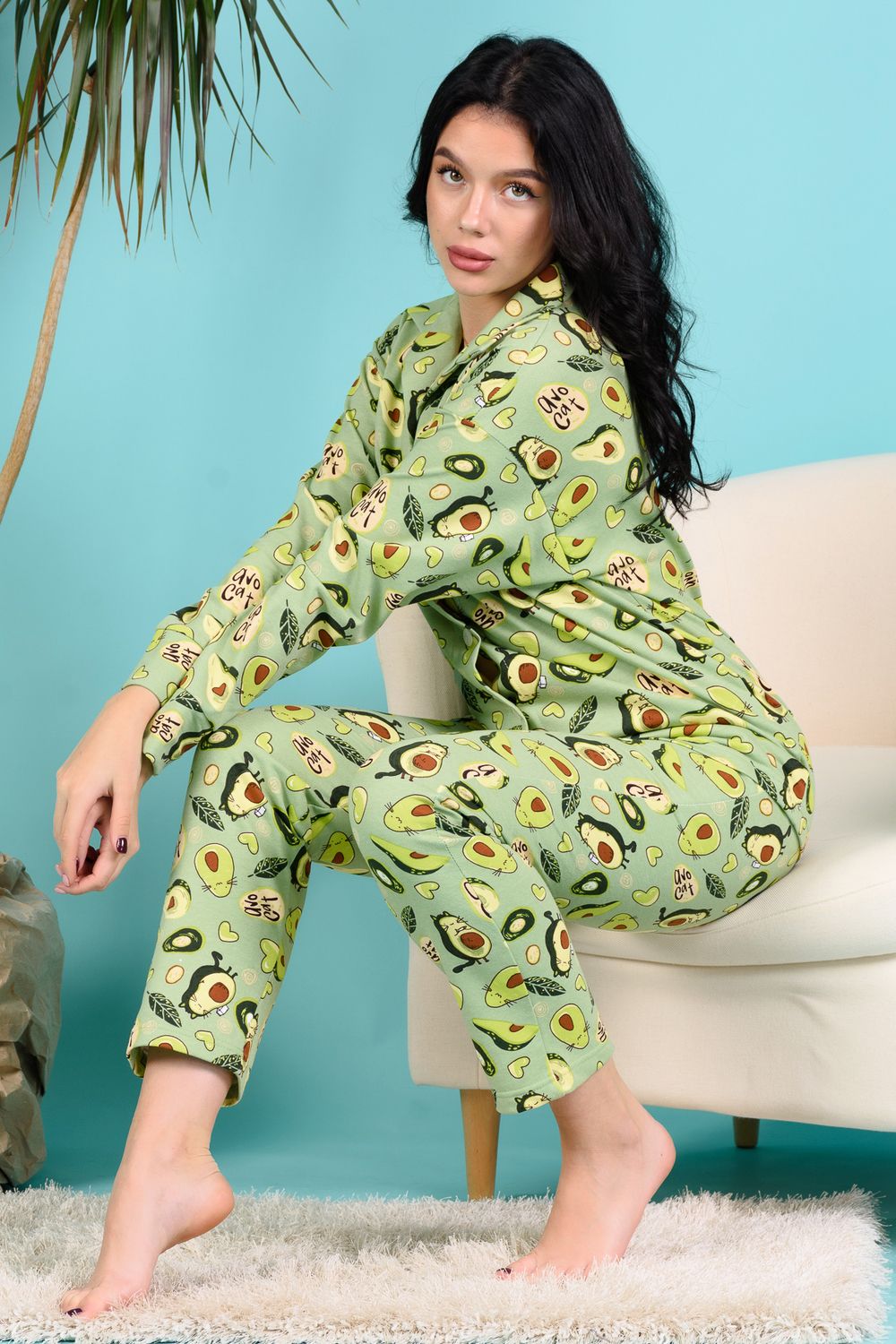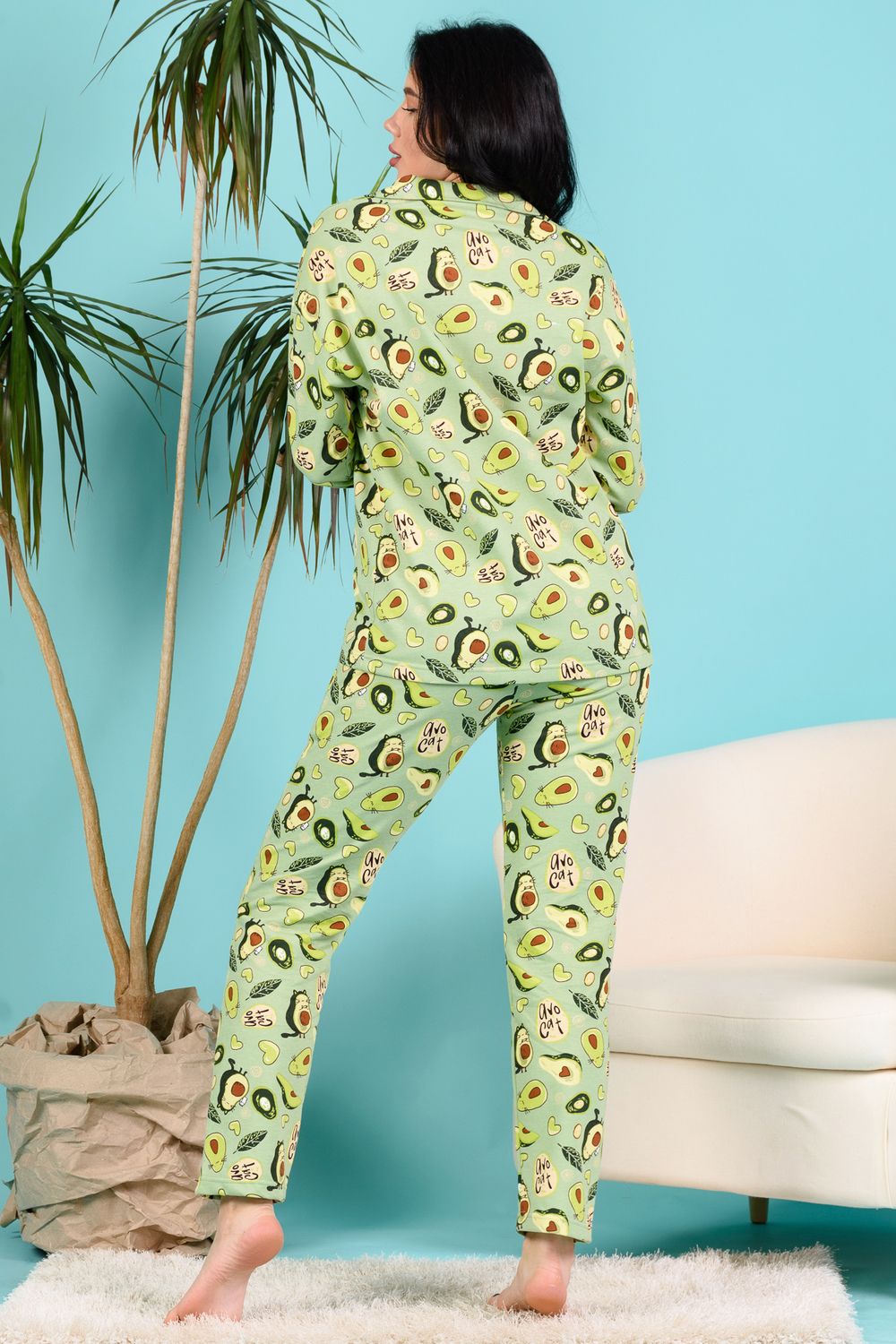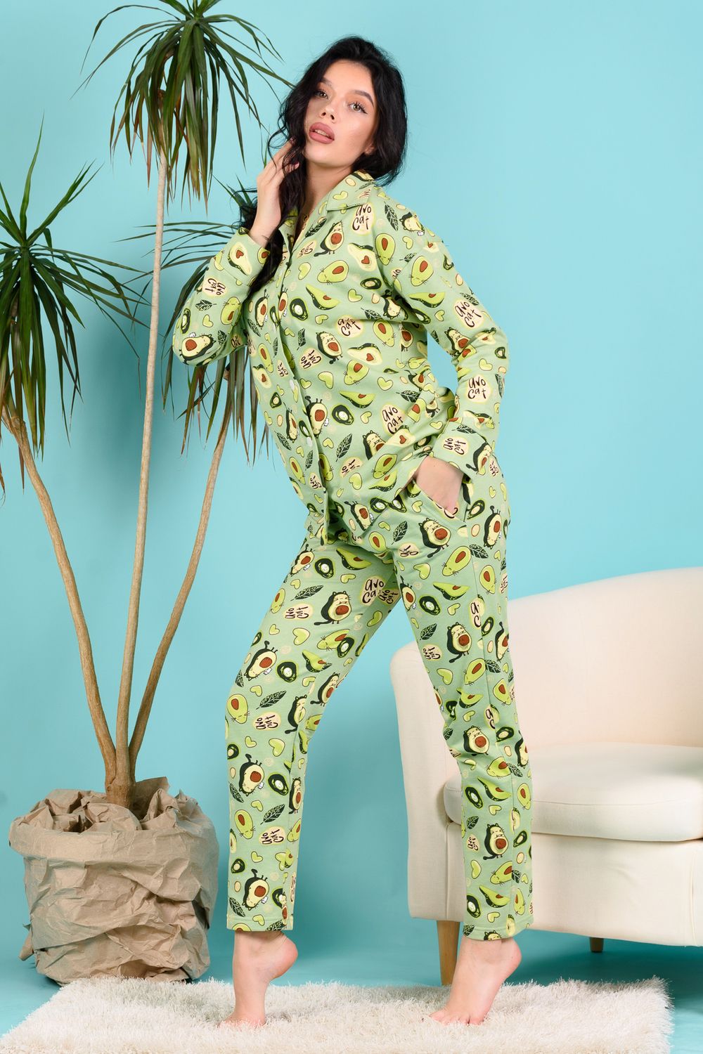 Домашний костюм из футера 2-х нитки с начёсом. Кофточка с отложным воротником с цельнокроенными подбортами, на пуговицах, с манжетами. Свободный крой, спущенная линия плеча. Брючки с боковыми карманами на плотной резинке 3 см. 100% содержание натурального хлопка в полотне делает изделие невероятно комфортным и дышащим. Длина рукава в характеристиках указана от основания шеи