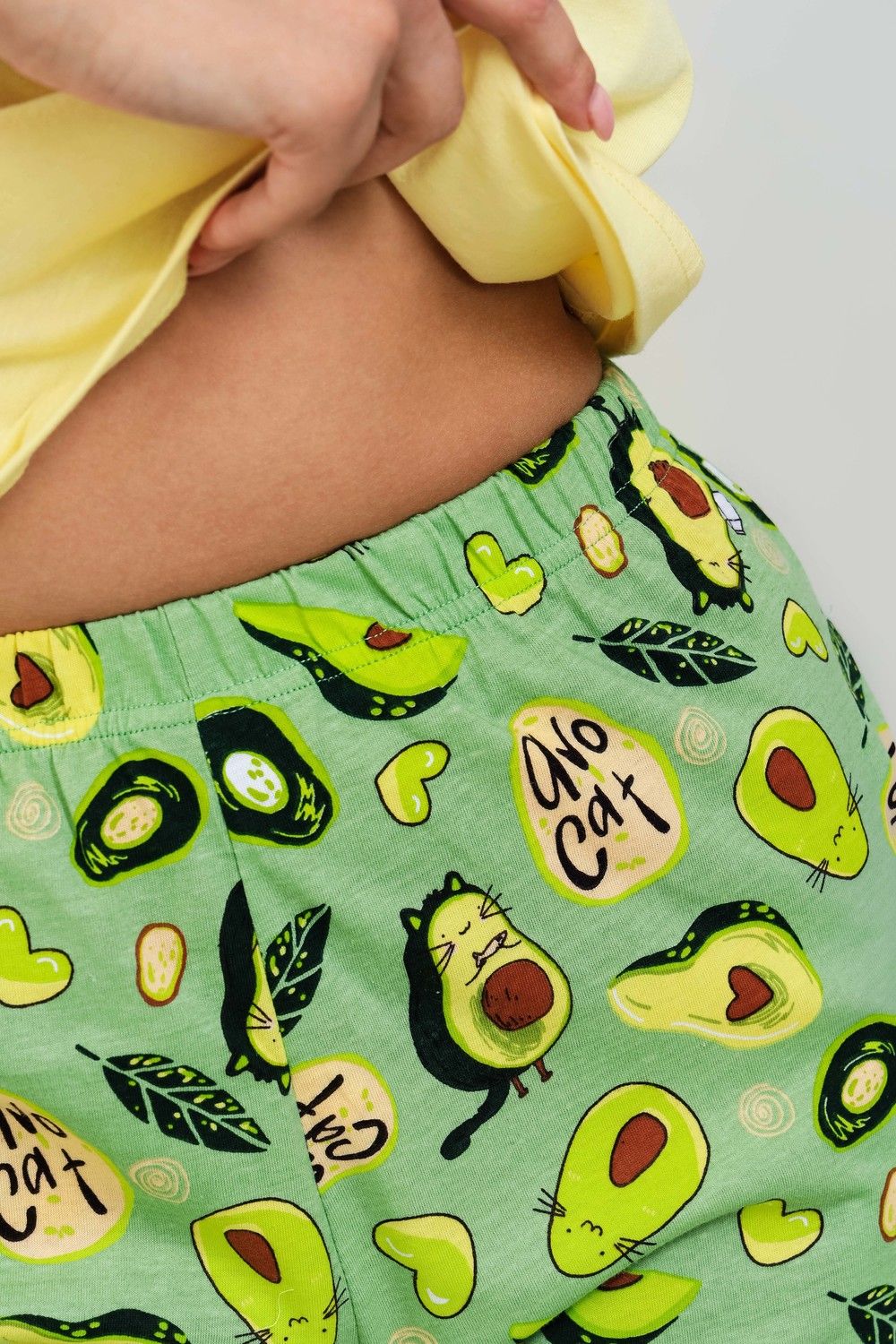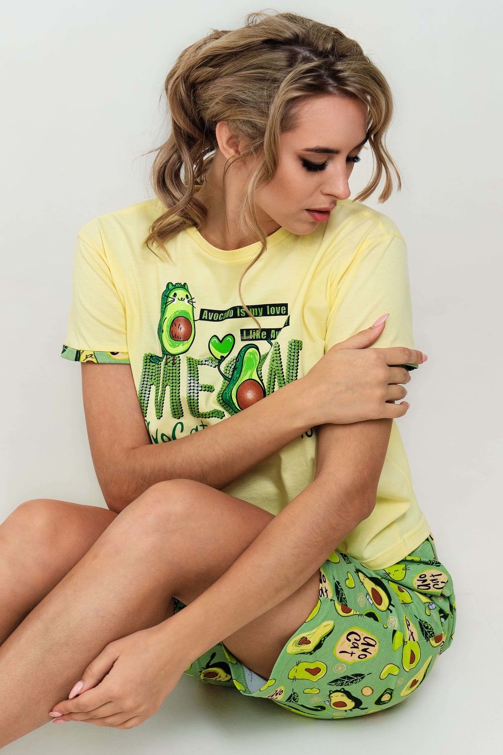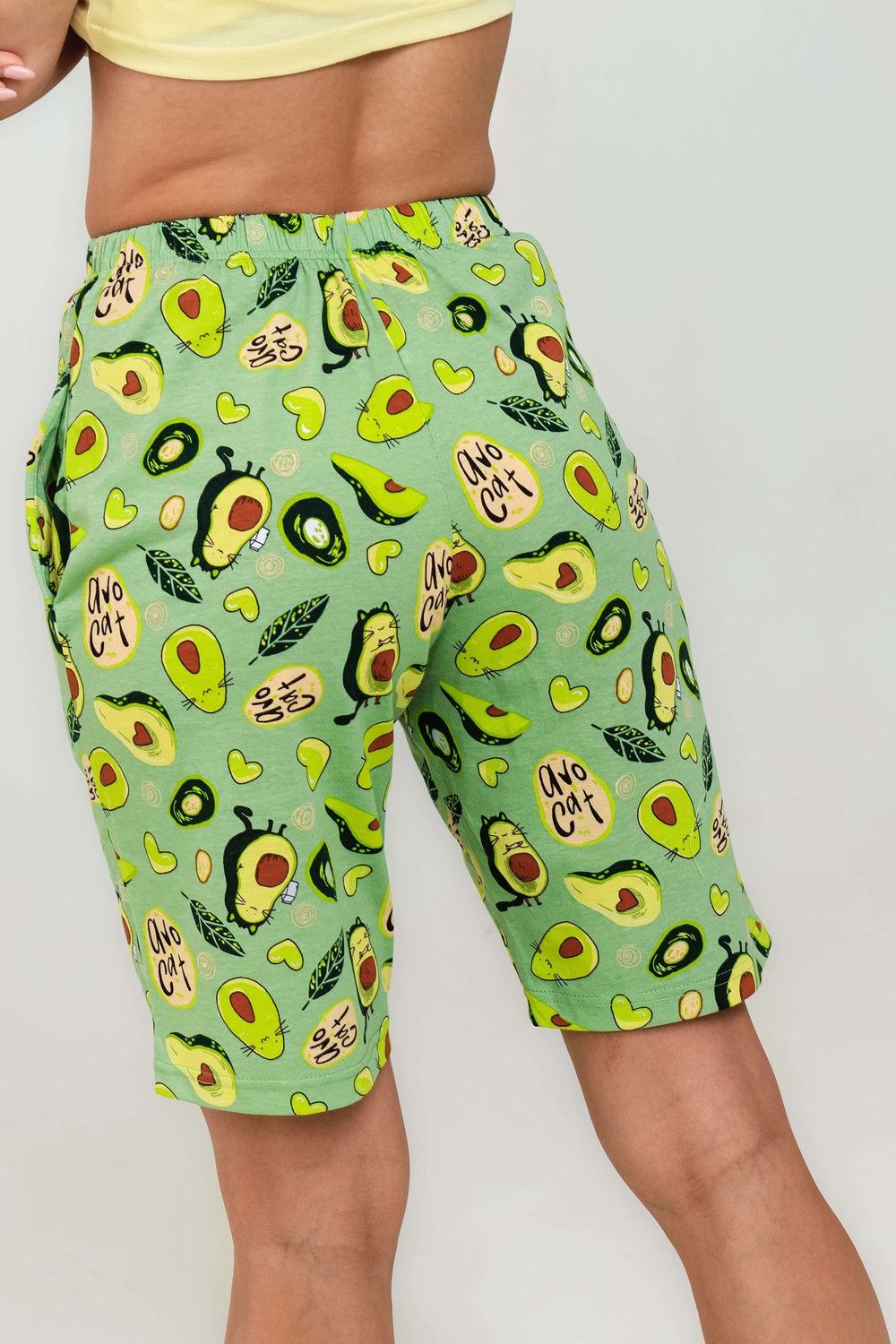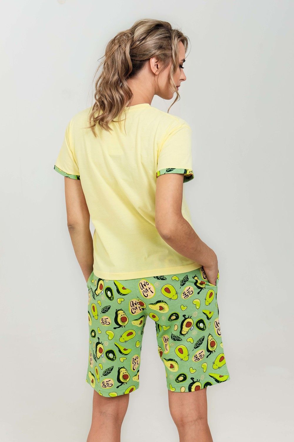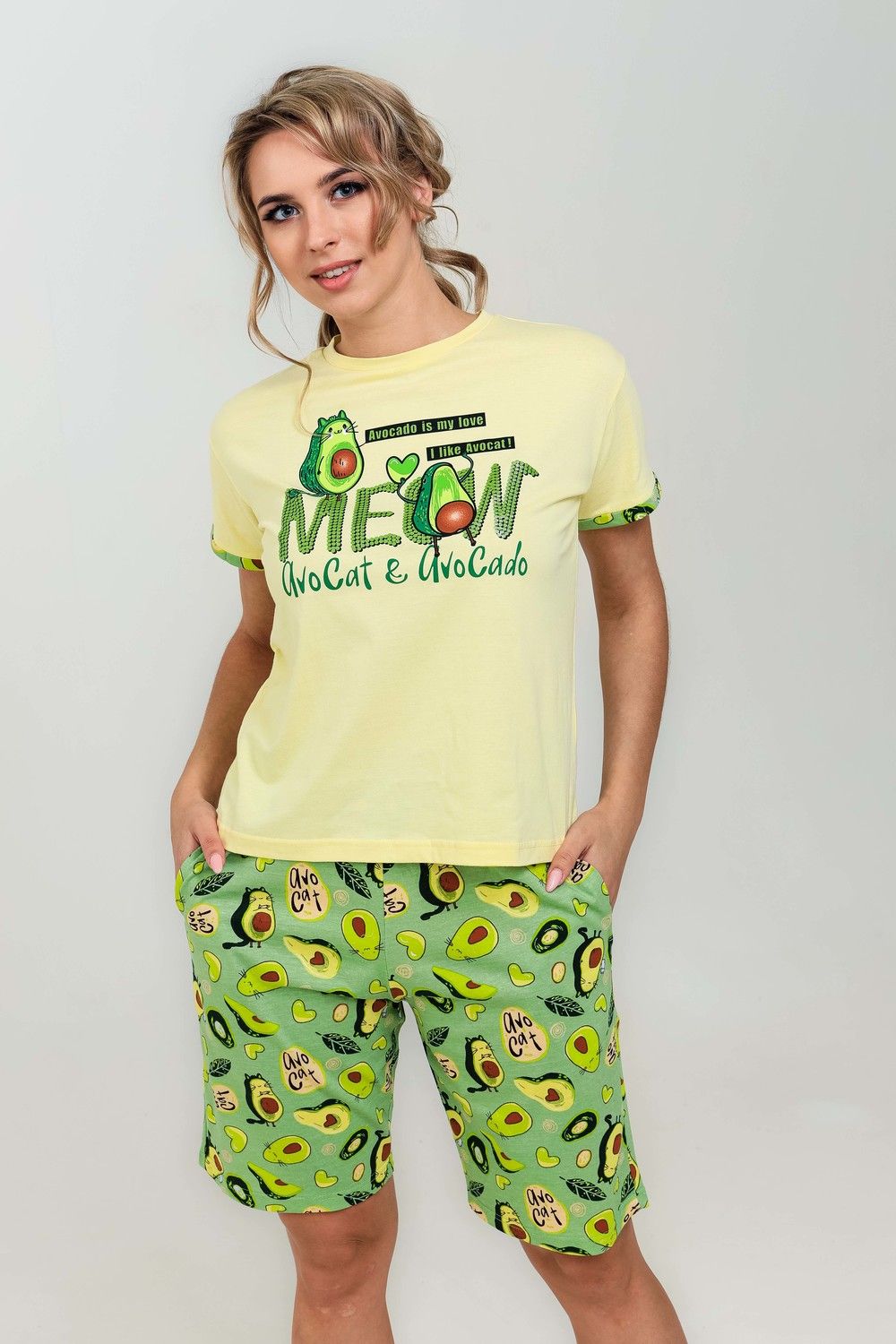 Весёлый костюмчик для дома, состоящий из футболки и удлинённых шорт. Манжеты на рукавах с отворотом. Карманы в боковых швах шорт. Свободный крой. Необычный принт добавляет образу лёгкость.