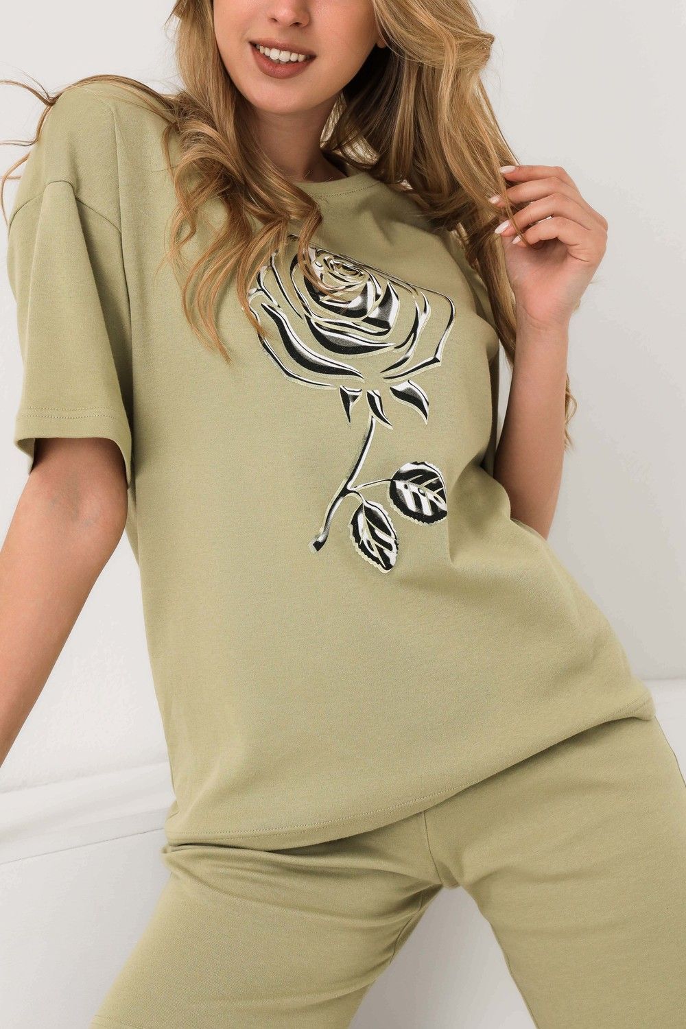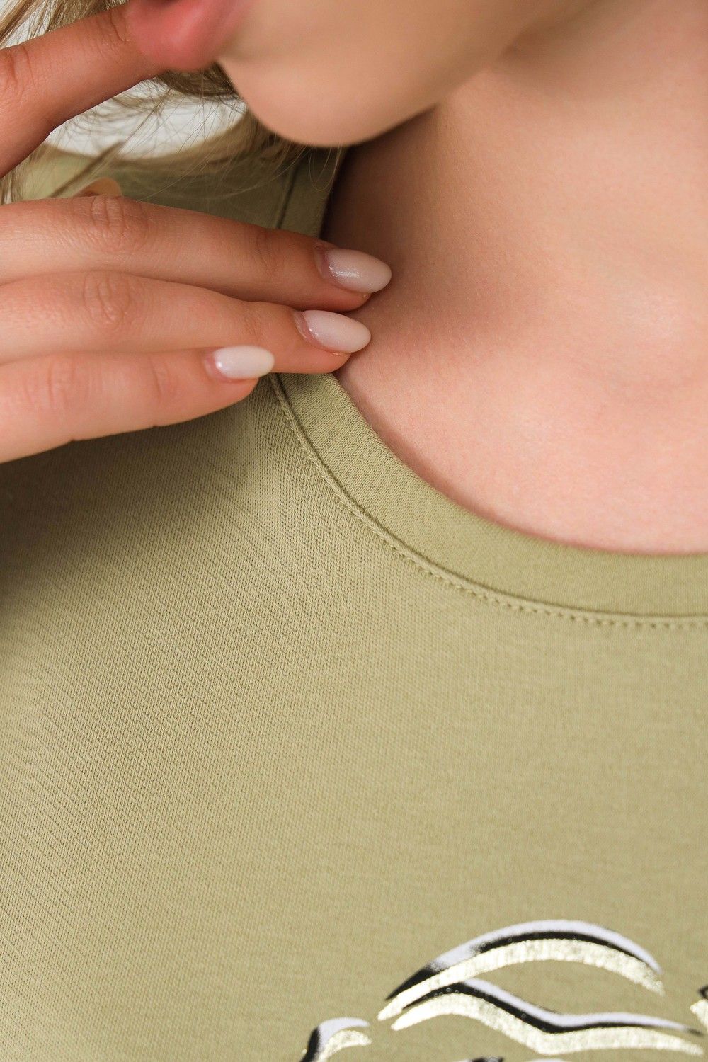 Костюм из качественной ткани. Интерлок пенье - это полотно, при производстве которого используют самые лучшие длинные нити. Материал идеально гладкий, тонкий, на ощупь немного шелковистый. Практически не мнётся, долго сохраняет свою форму. Хорошо удерживает тепло. Обеспечивает свободную циркуляцию воздуха. Футболка свободного кроя, пояс выполнен на поясной машине, горловина обработана киперной лентой. На этой модели использована специальная техника нанесения фольги, с помощью которой выделены отдельные участки изображения. Эффект 3Д. Качественно. Уютно. Для тебя.