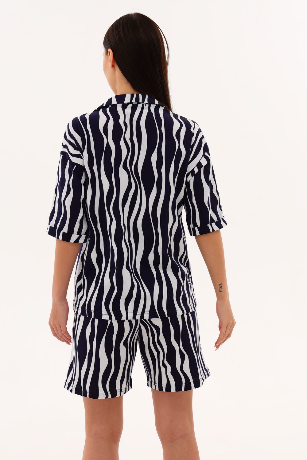 Костюм, состоящий из рубашки и шорт. Рубашка из лёгкого мягкого трикотажного полотна прямого силуэта, на пуговицах, отложной воротник, втачной рукав с манжетами, застёжка на пуговицах. Шорты свободного кроя с боковыми карманами. Пояс обработан на поясной машине, что позволяет после стирки избежать деформации.