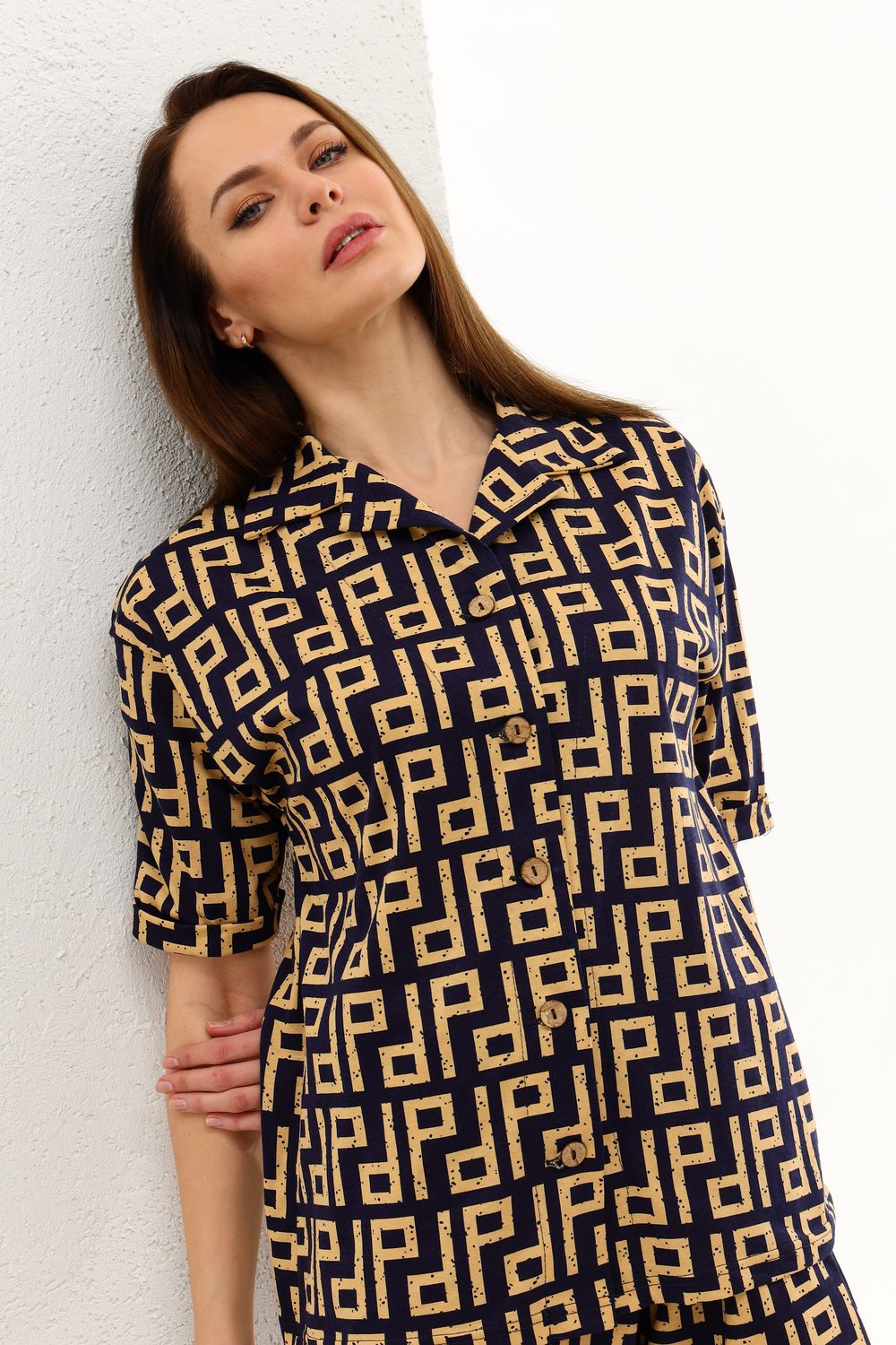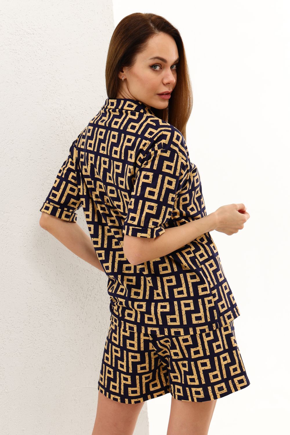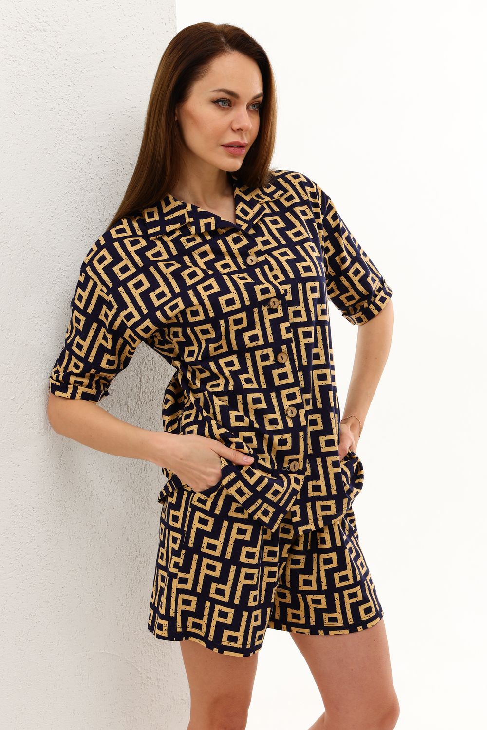 Костюм, состоящий из рубашки и шорт. Рубашка из лёгкого мягкого трикотажного полотна прямого силуэта, на пуговицах, отложной воротник, втачной рукав с манжетами, застёжка на пуговицах. Шорты свободного кроя с боковыми карманами. Пояс обработан на поясной машине, что позволяет после стирки избежать деформации.