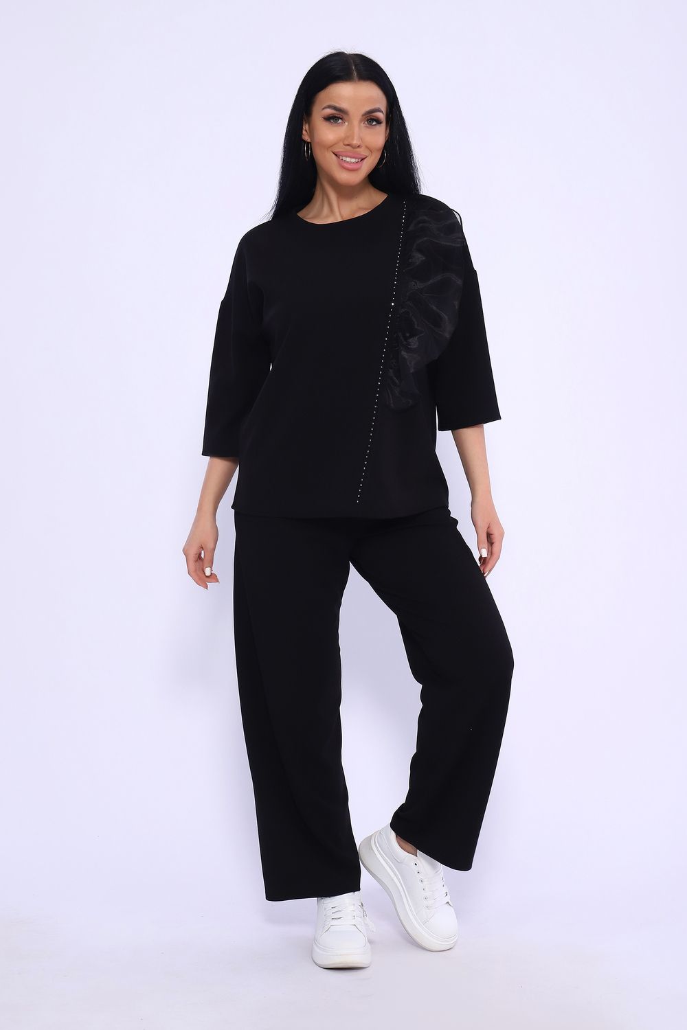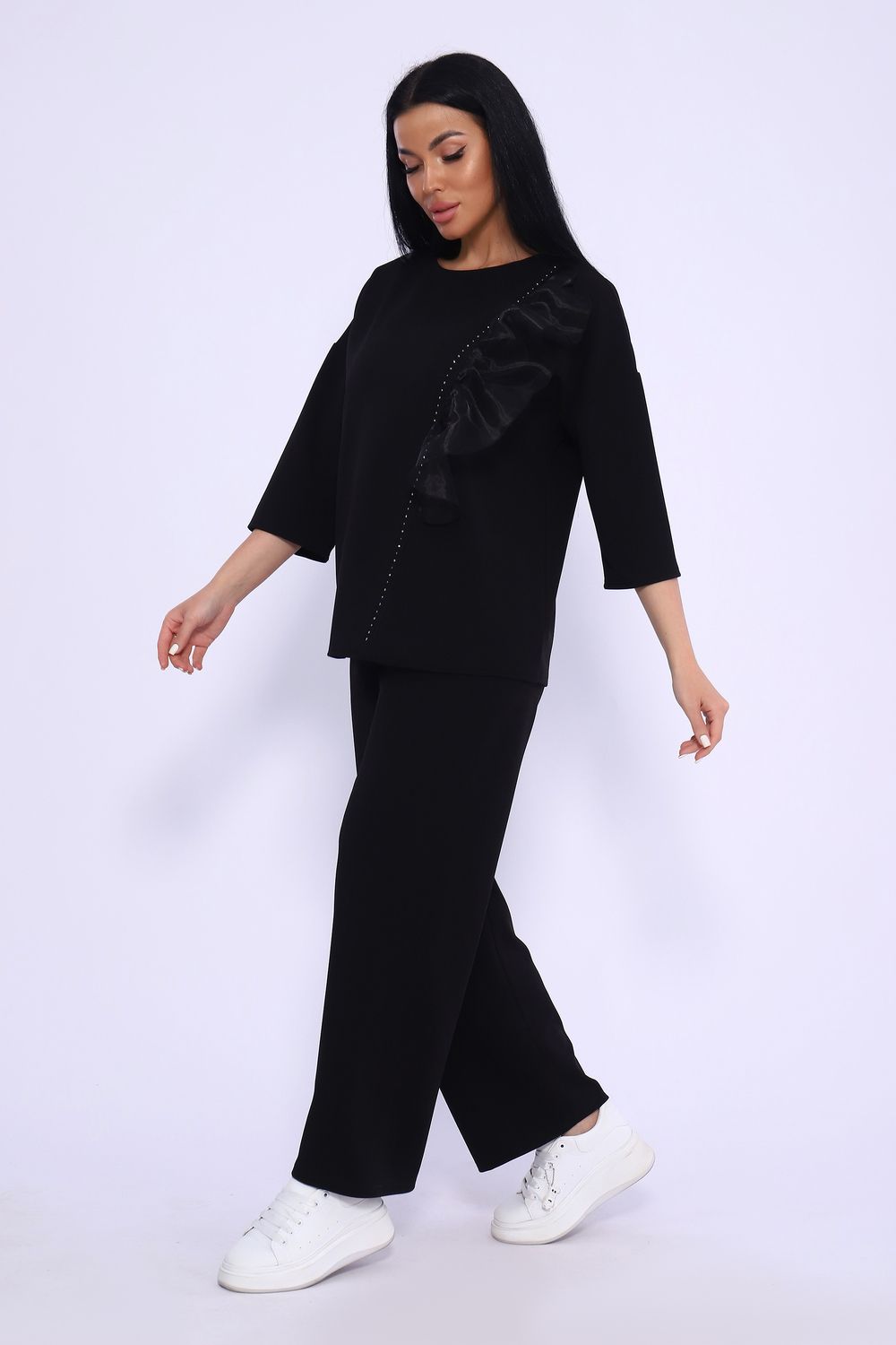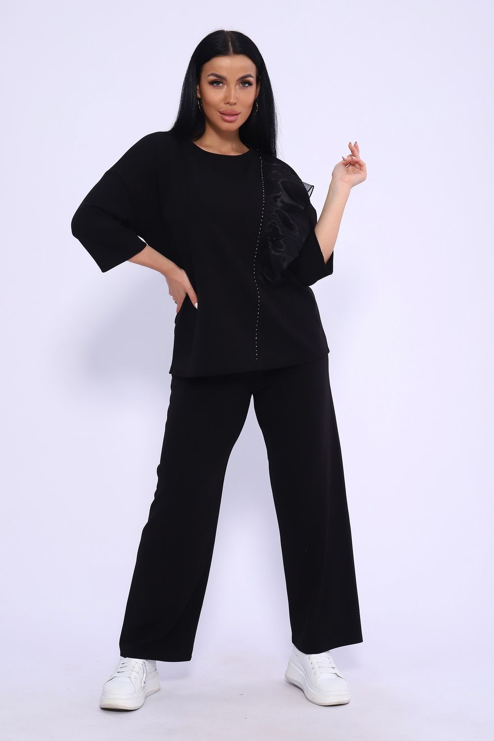 Модель свободного силуэта состоит из брюк палаццо и туники с рукавом 34. По переду туники дорожка из страз и оборка из органзы, что делает костюм интересным и эффектным. Брюки с очень удобной высокой посадкой, а туника тоже комфортно и свободно подойдёт практически на любую фигуру. Добавьте этот образ в свой праздничный или повседневный день, и ваша жизнь будет более красочной. В замерах длина рукава указана от начала горловины.