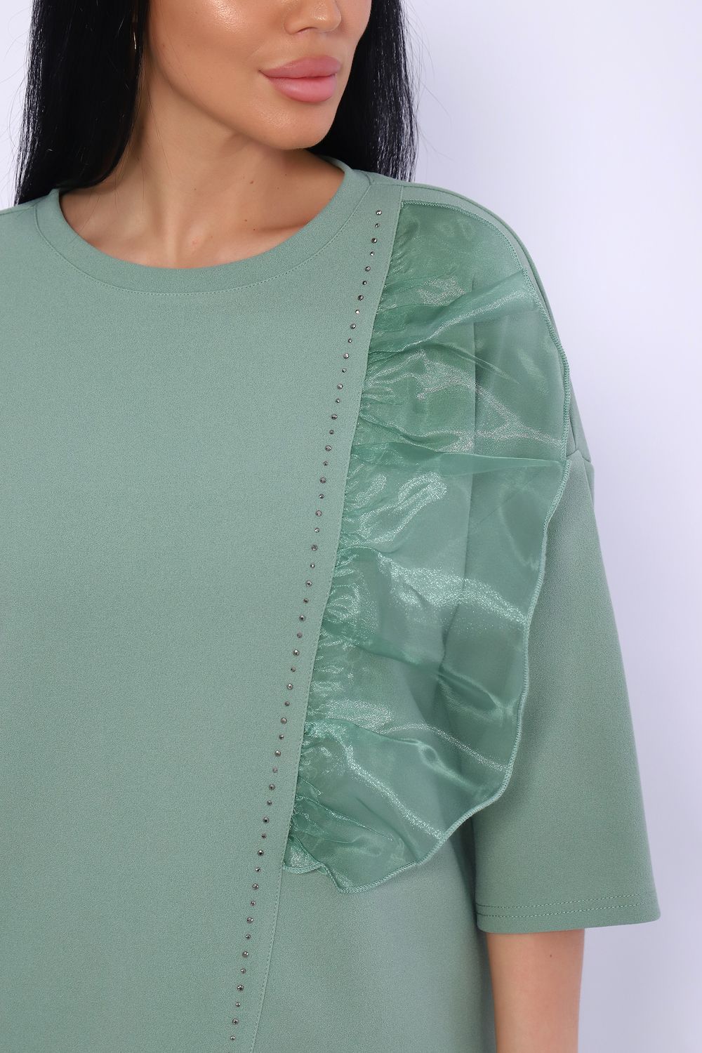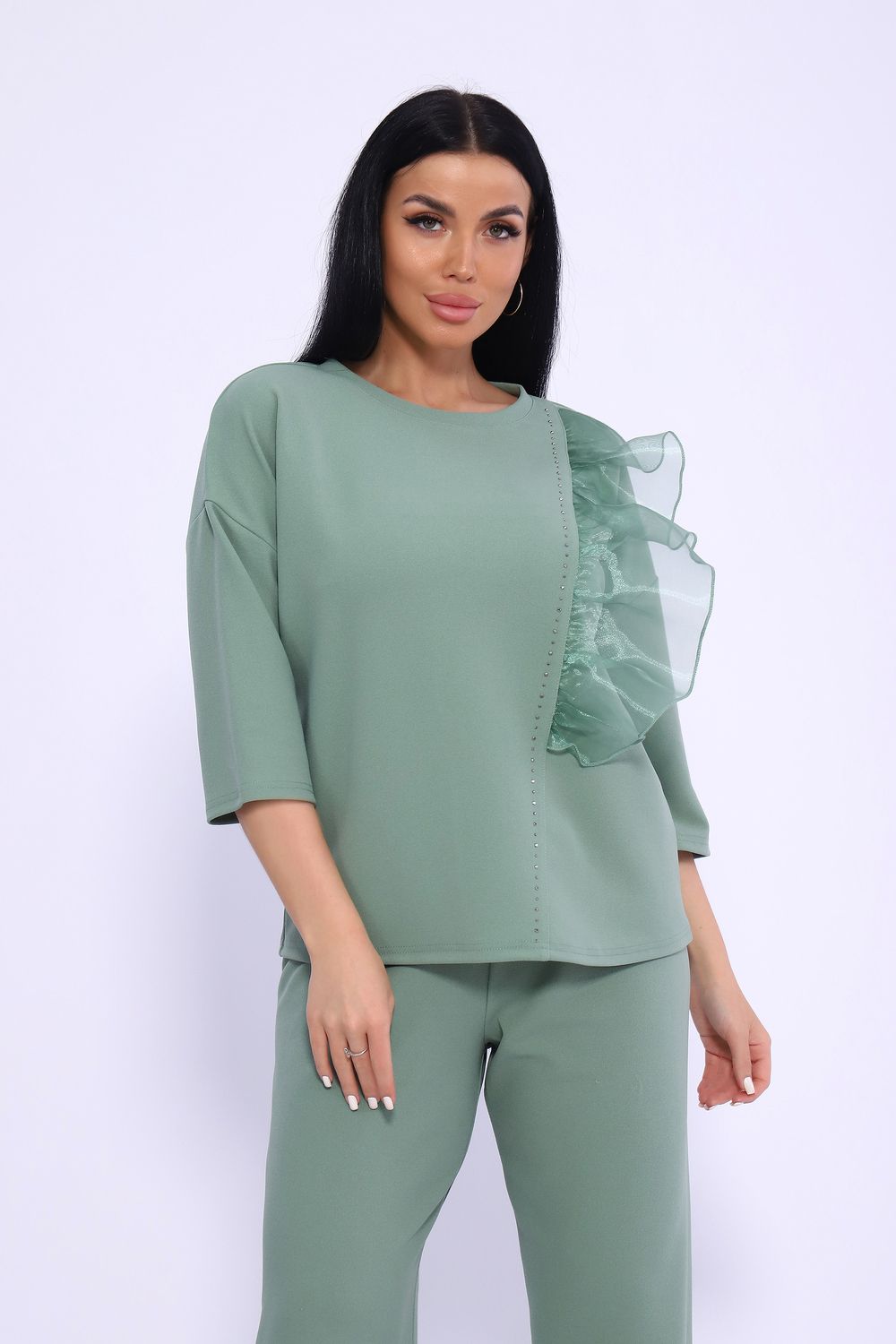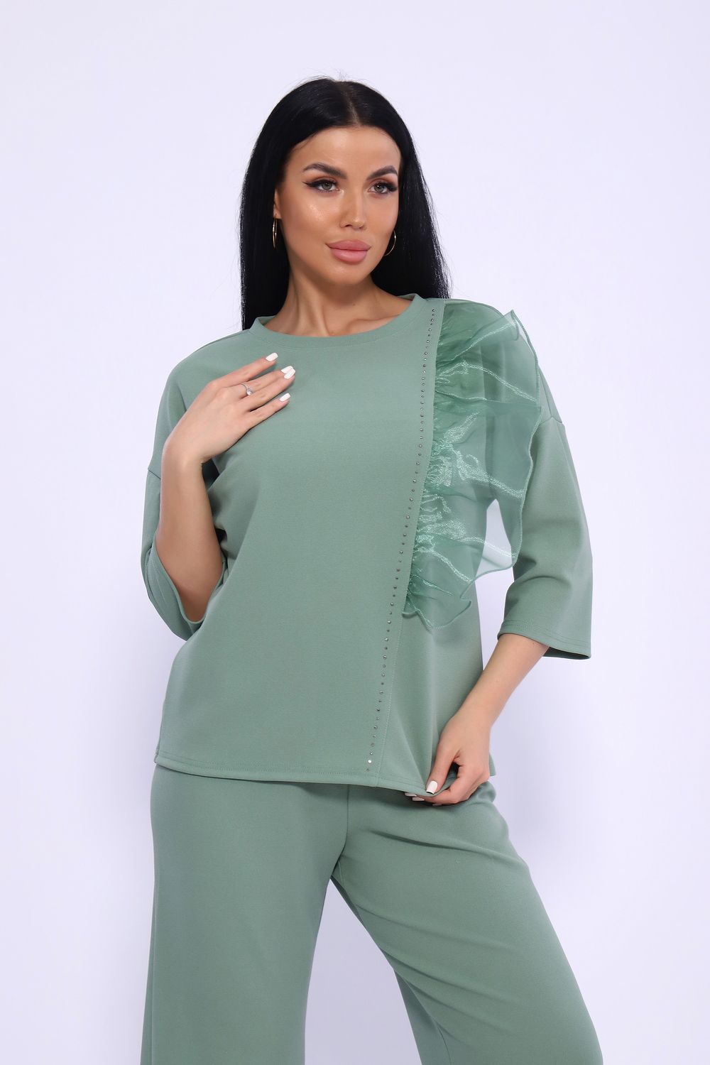 Модель свободного силуэта состоит из брюк палаццо и туники с рукавом 34. По переду туники дорожка из страз и оборка из органзы, что делает костюм интересным и эффектным. Брюки с очень удобной высокой посадкой, а туника тоже комфортно и свободно подойдёт практически на любую фигуру. Добавьте этот образ в свой праздничный или повседневный день, и ваша жизнь будет более красочной. В замерах длина рукава указана от начала горловины.