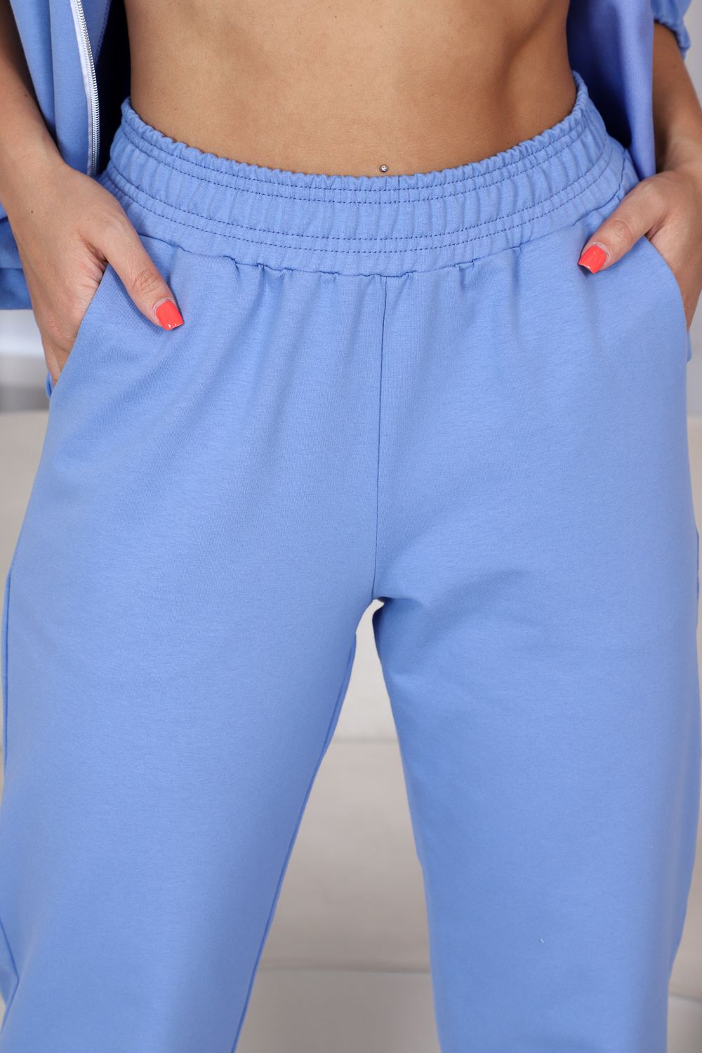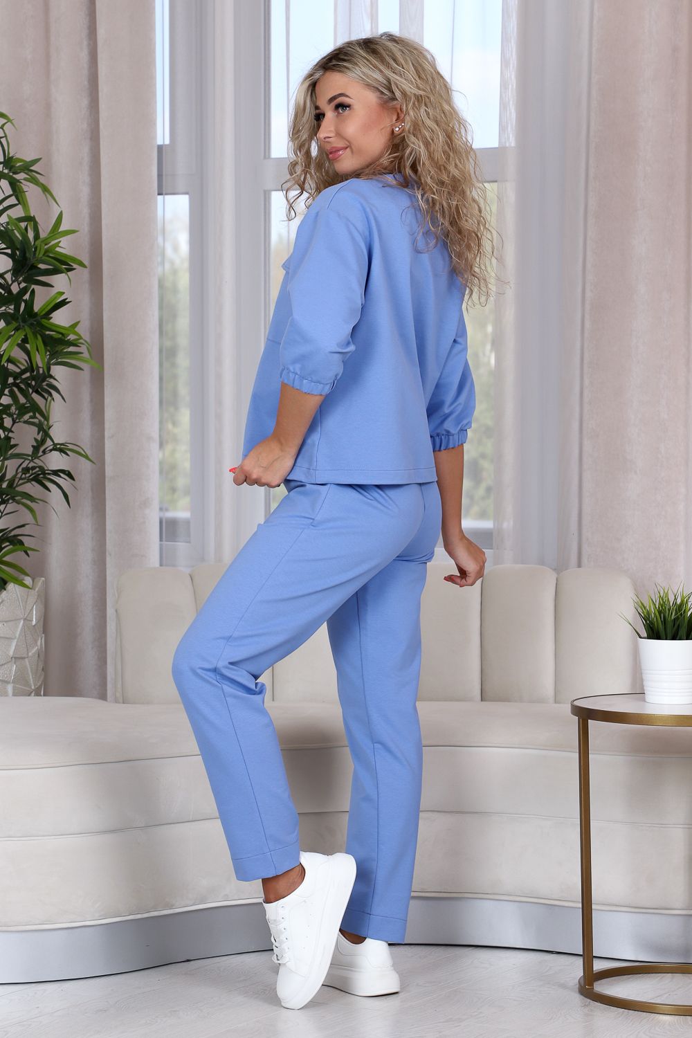 Костюм женский из футера состоит из куртки и брюк. Куртка застегивается на тесьму - молнию. На полочке расположена кокетка, накладные карманы с клапаном. На правом клапане печать. Низ куртки фиксируется резинкой. Брюки на притачном поясе, с карманами.