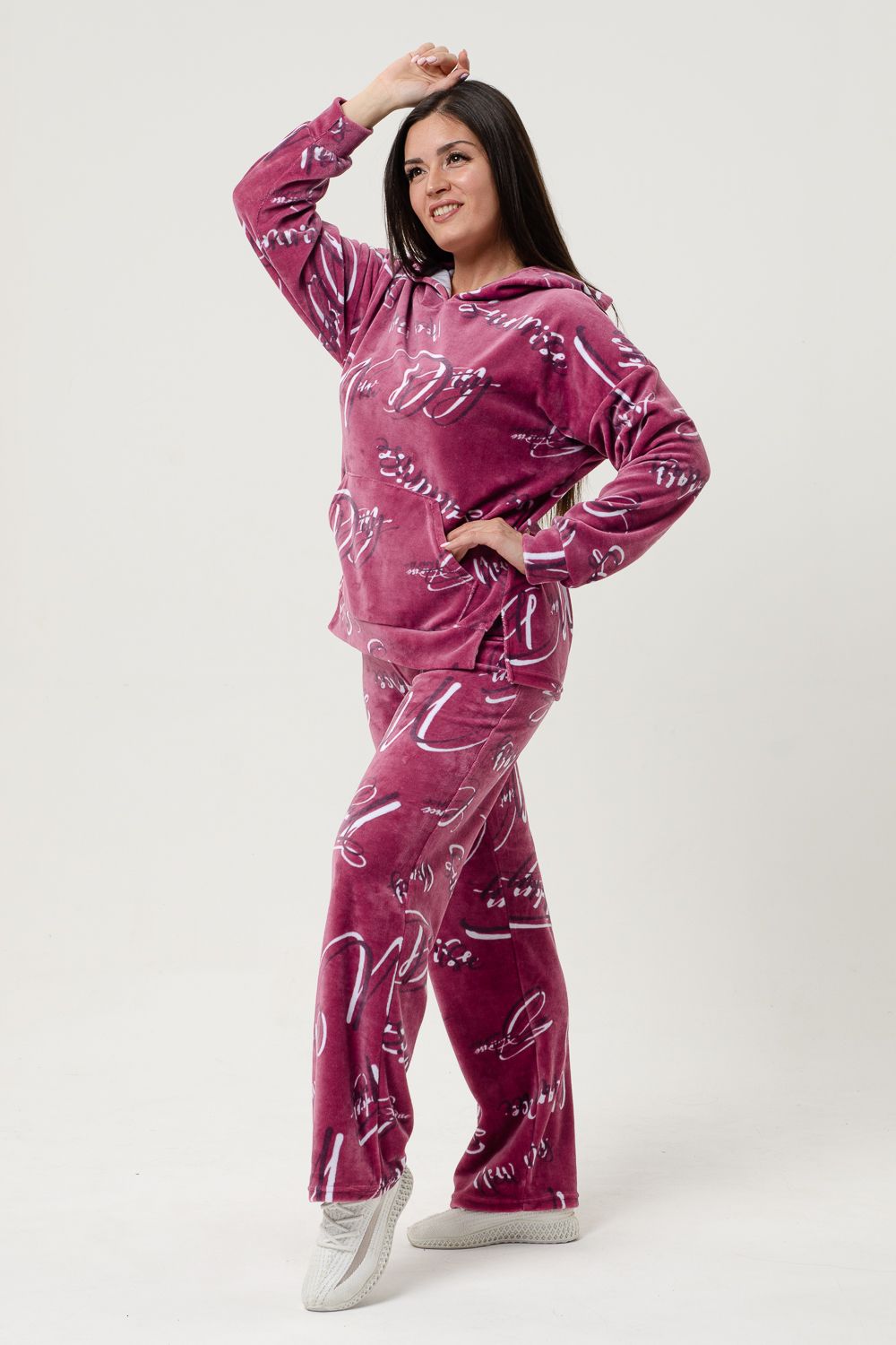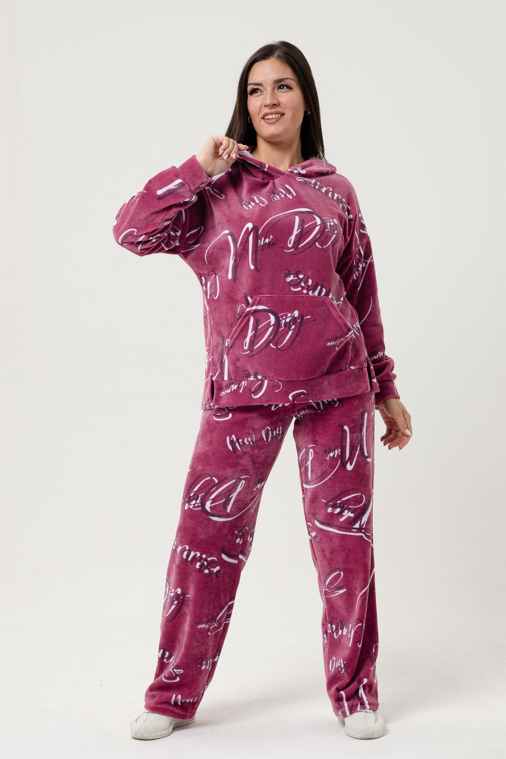 Костюм женский с брюками, толстовка с капюшоном, карманом-кенгуру. Боковой шов плавна переходит на перед, внизу которого небольшие разрезы. На передней половинке внизу пояс. Длинный рукав с манжетом. Брюки-трубы с удобной посадкой. Костюм уютный, теплый для дома и отдыха в прохладное время года.
