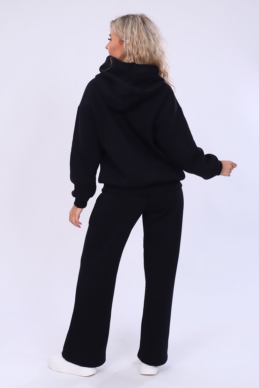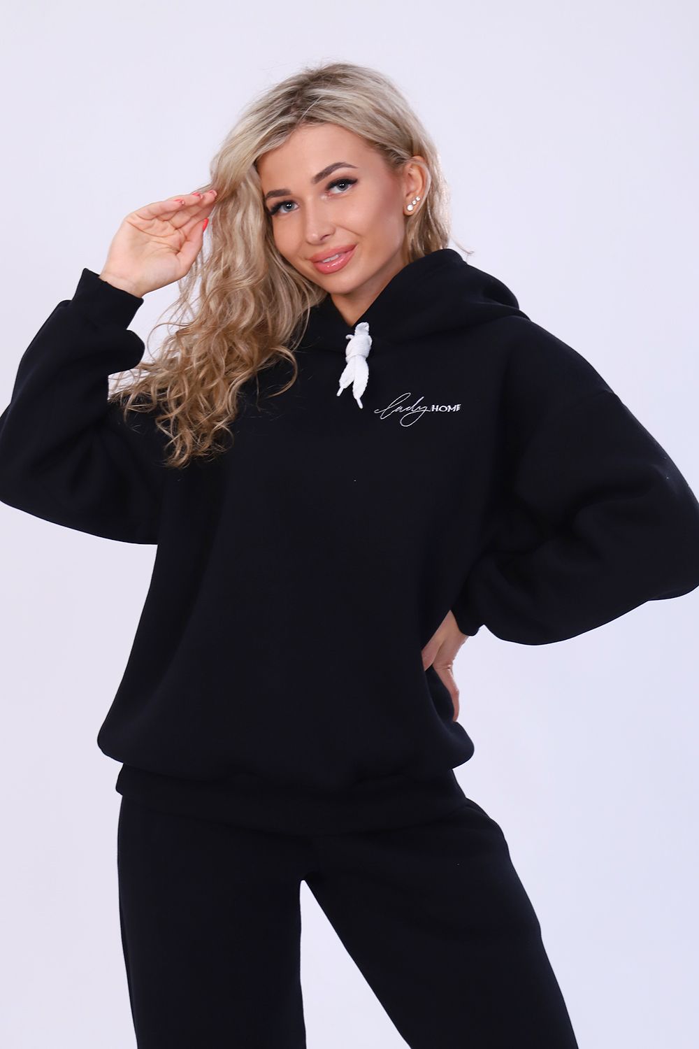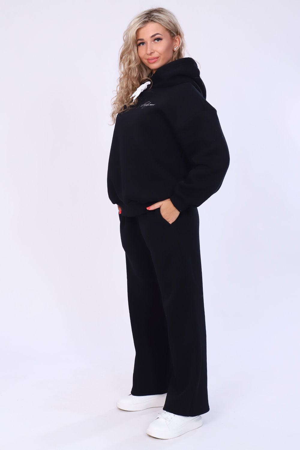 Костюм состоит из толстовки с капюшоном и брюк, из приятной мягкой ткани. Капюшон фиксируется шнуром. Пояс и рукав толстовки на манжете, на полочке вышивка. Брюки с карманами. Модель особенно удобна и комфортна в прохладное время года.