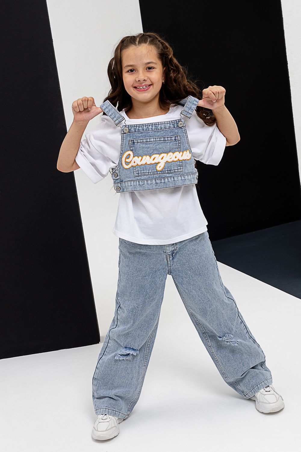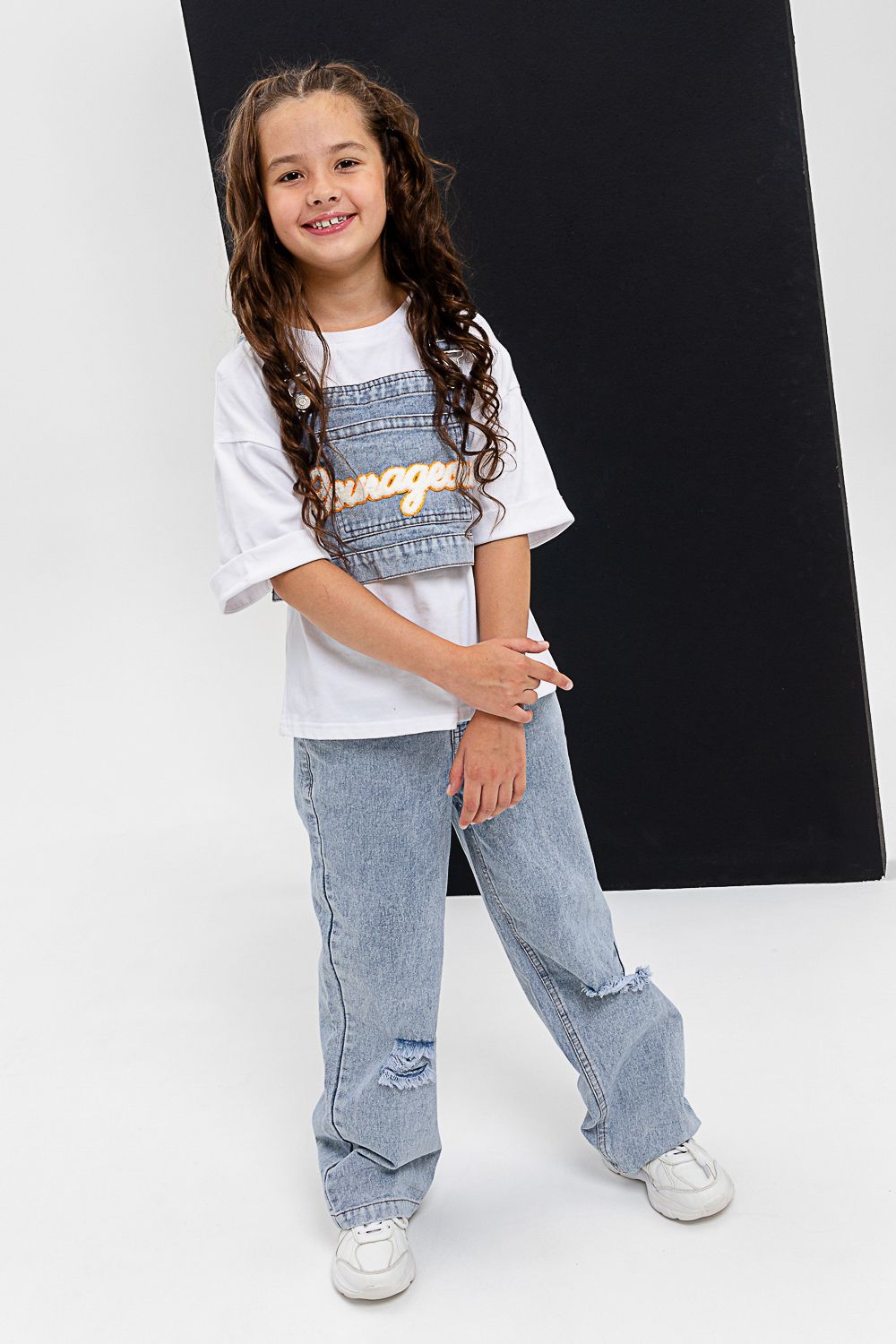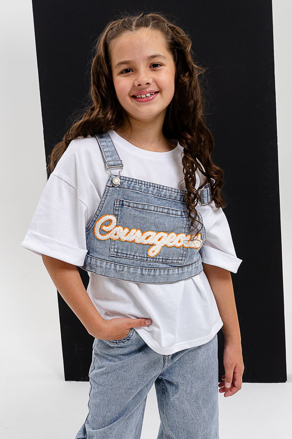 Костюм тройка для девочки. Футболка оверсайз из 100% хлопка. Жилетка и джинсы из плотной ткани джинс. На жилетке вышивка.