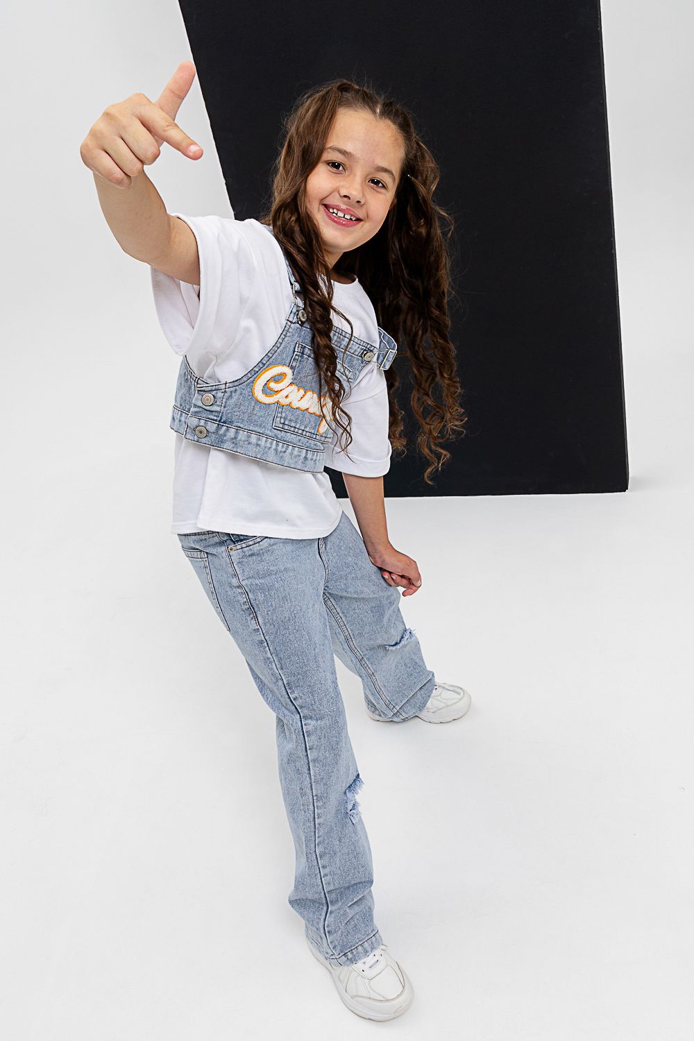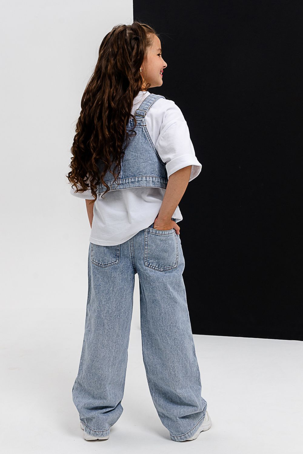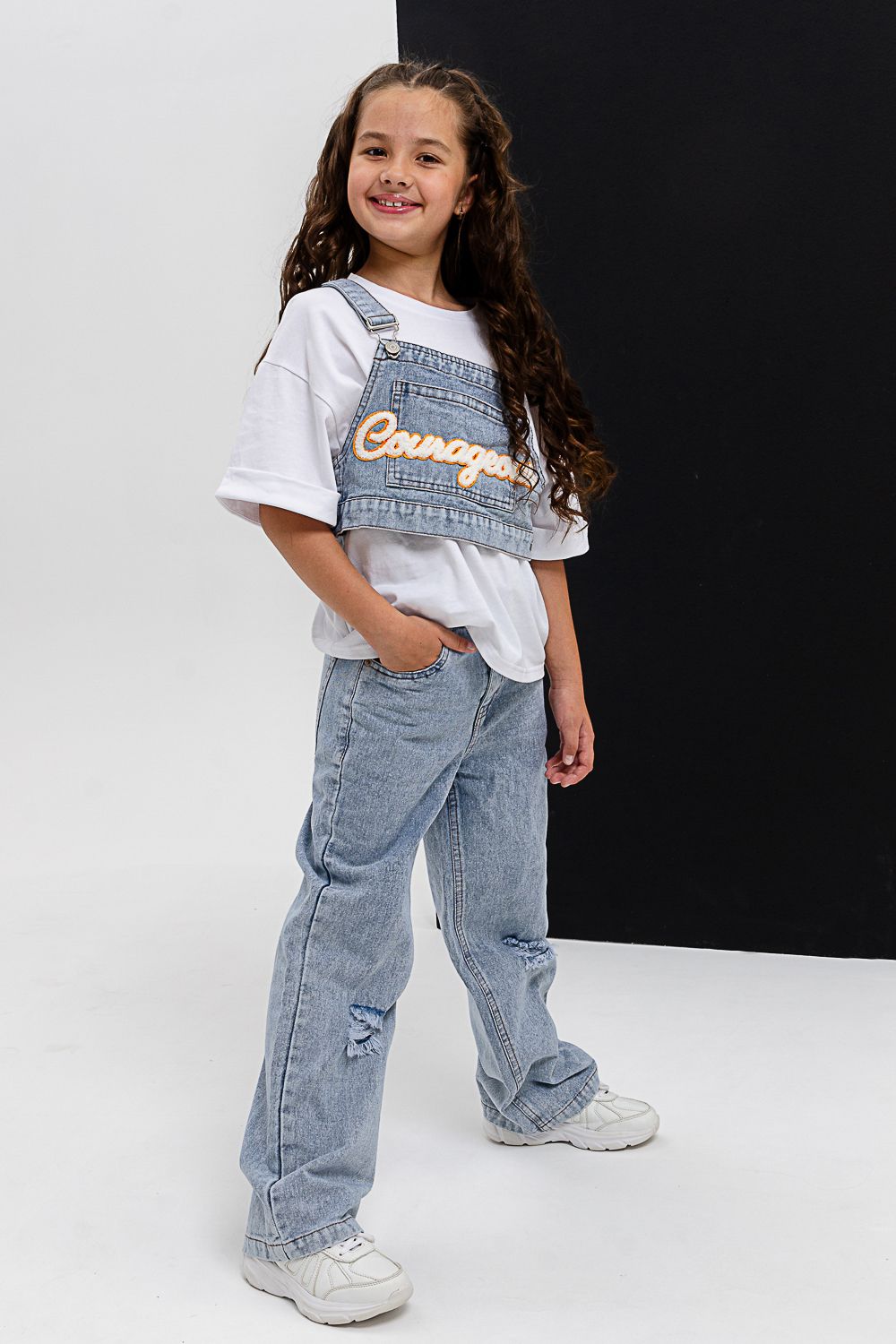 Костюм тройка для девочки. Футболка оверсайз из 100% хлопка. Жилетка и джинсы из плотной ткани джинс. На жилетке вышивка.