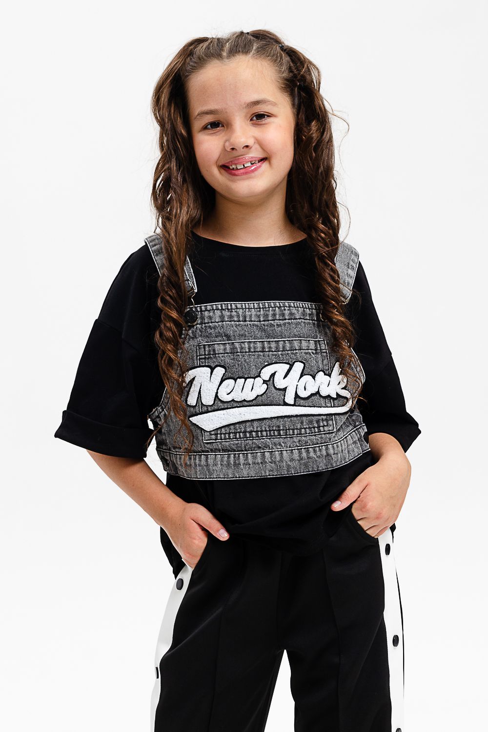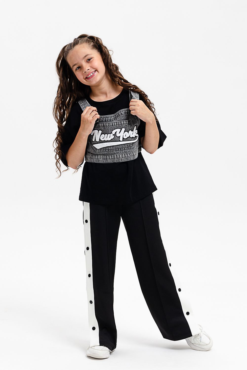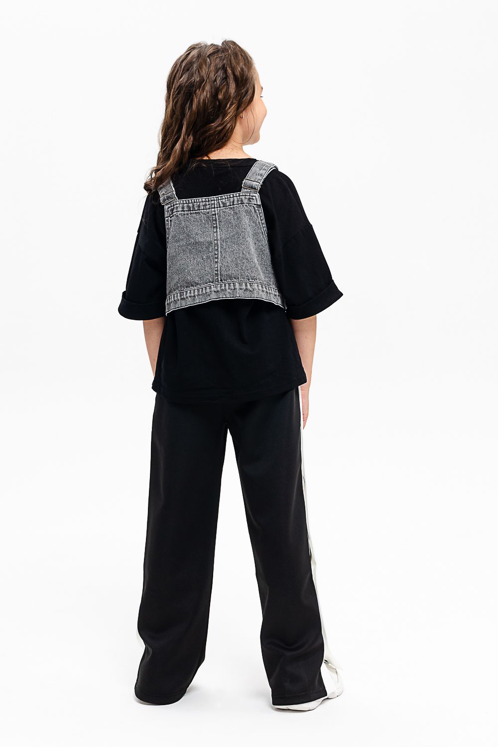 Костюм тройка для девочки. Футболка оверсайз из 100% хлопка. Жилетка из плотной ткани джинс. На жилетке вышивка.