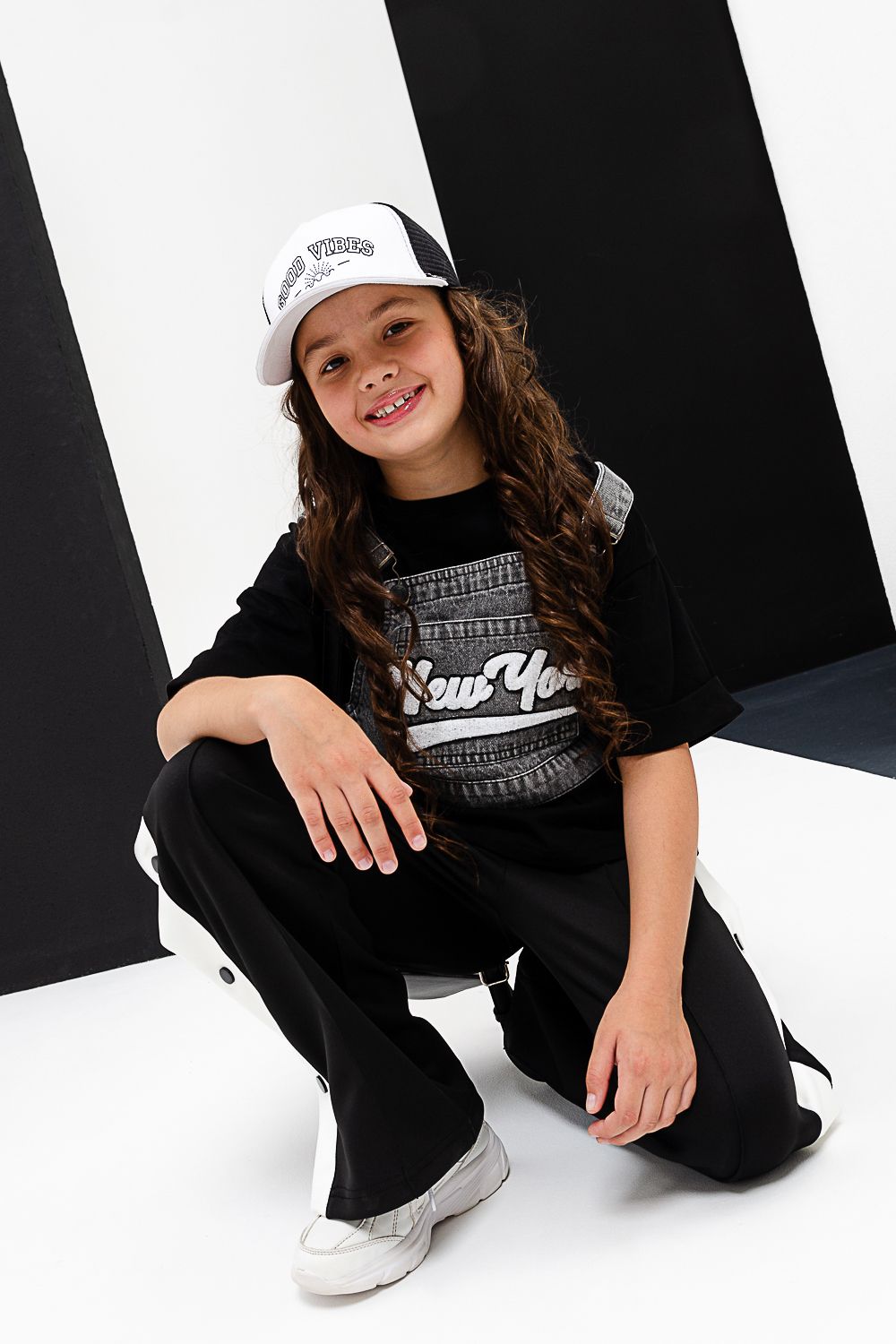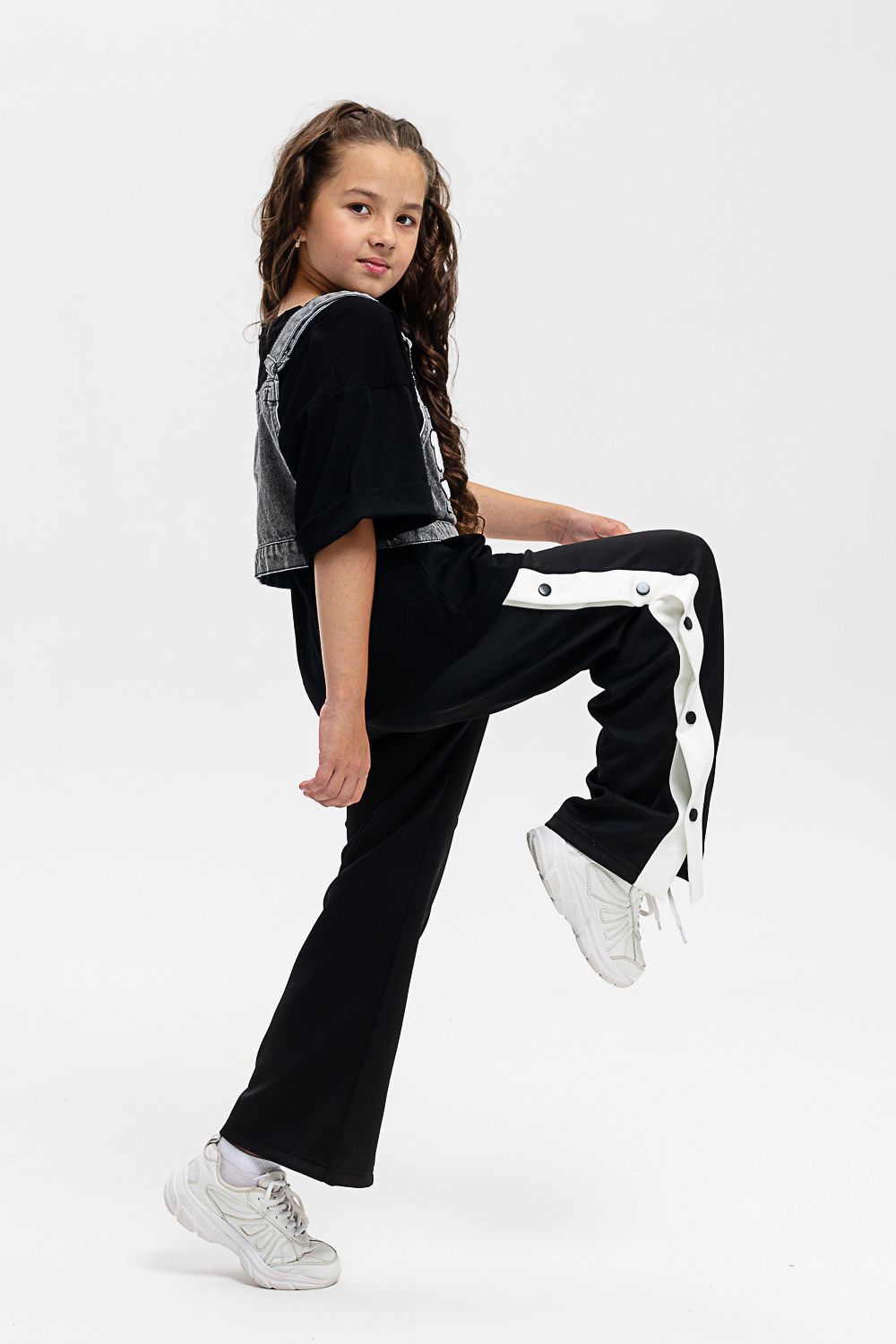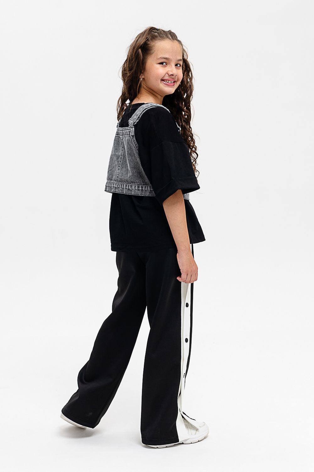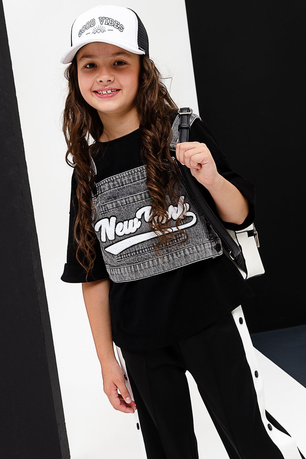Костюм тройка для девочки. Футболка оверсайз из 100% хлопка. Жилетка из плотной ткани джинс. На жилетке вышивка.