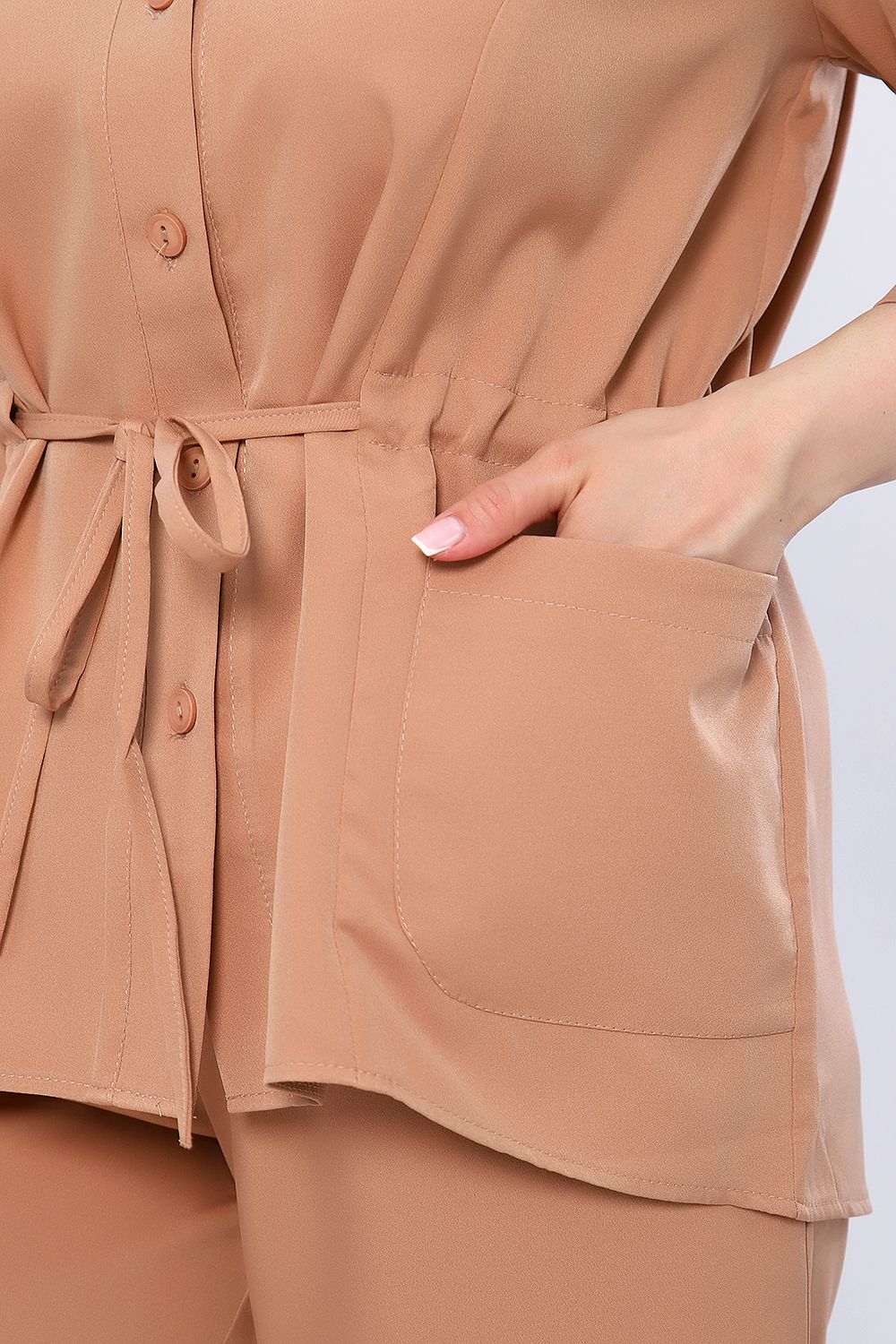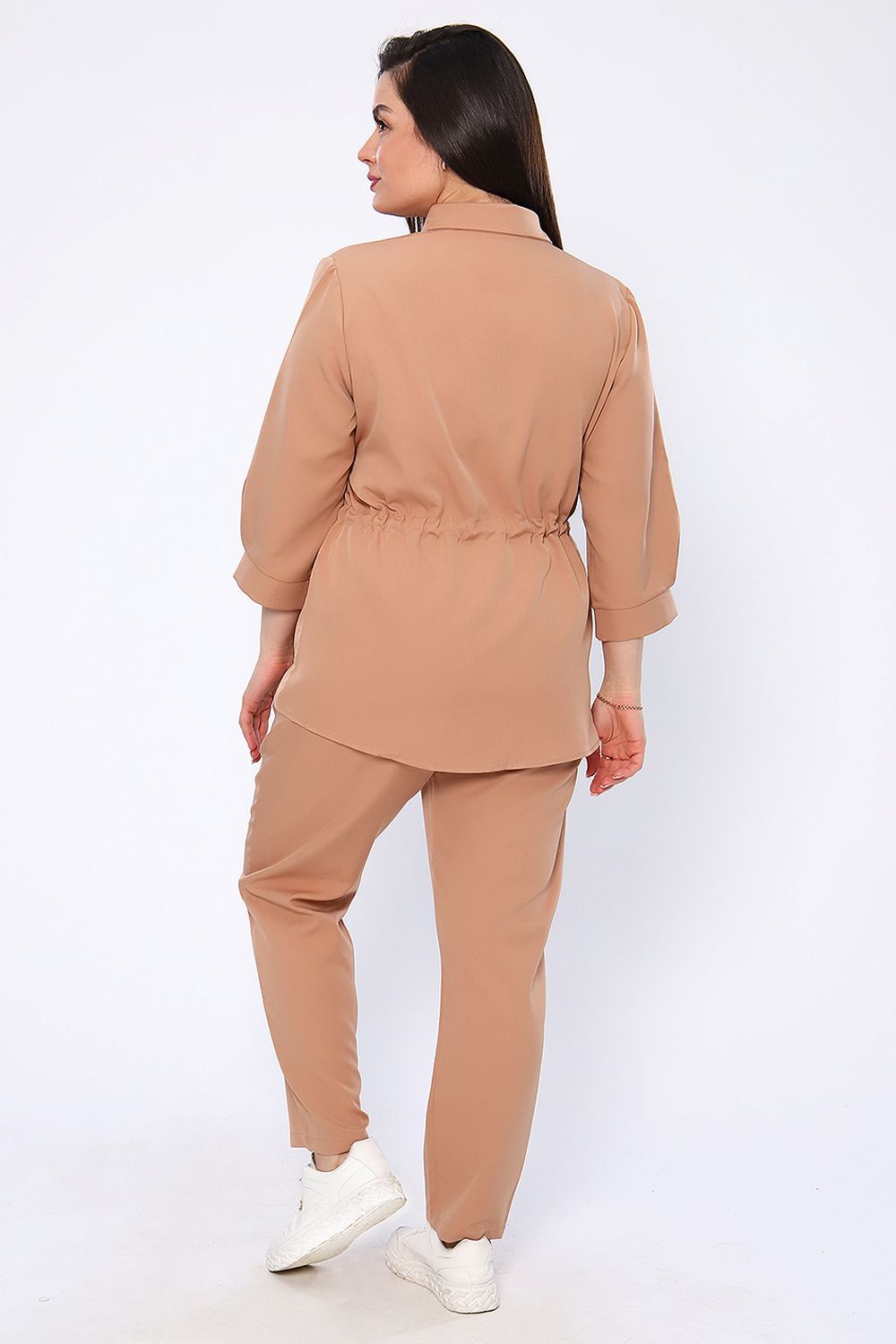 Идеальный костюм для повседневной жизни. Костюм смотрится элегантно и стильно. Комплект состоит из двух предметов, удобных однотонных брюк на резинке и однотонной туники рубашечного покроя с завязками на талии. Такой костюм не стыдно будет надеть в гости, на работу или просто на вечернюю прогулку. Прекрасно сочетается как с туфлями, так и кроссовками.
