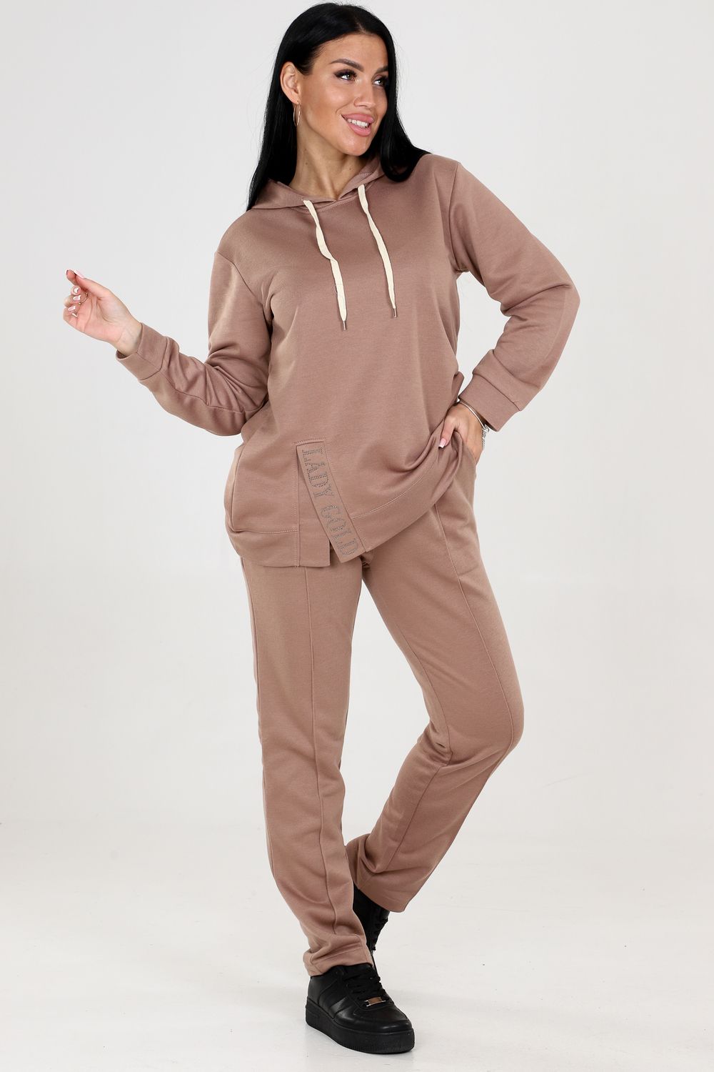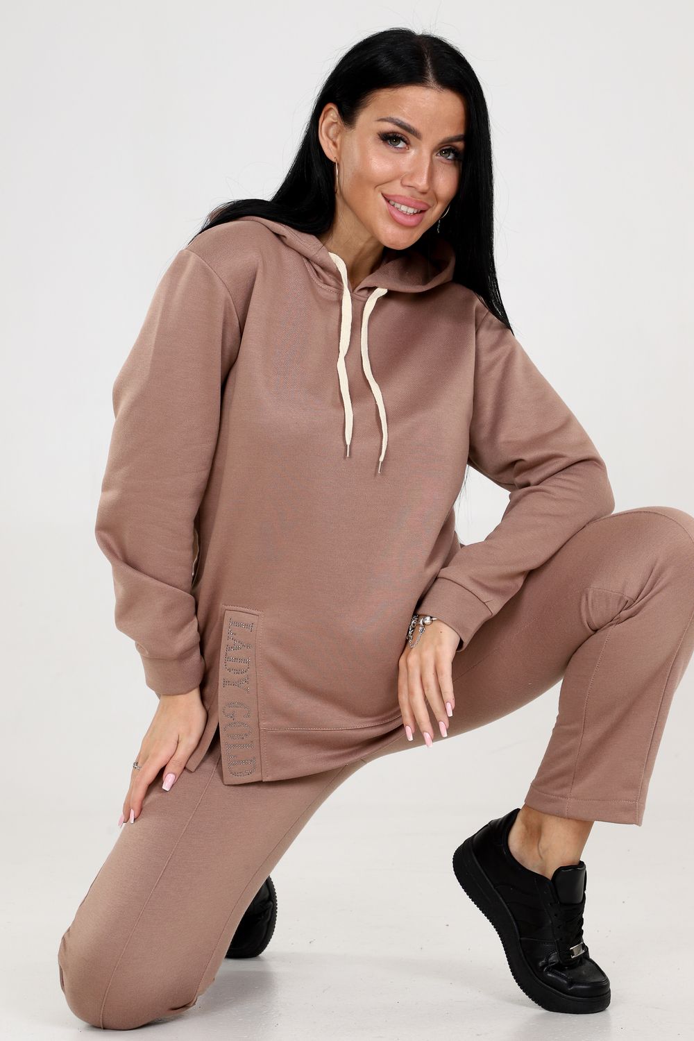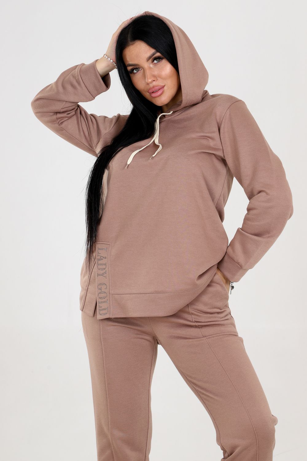 Туника с капюшоном. Разрез туники оформлен стразами, придающими блеск и привлекательность. Это прекрасная деталь, которая подчеркнет вашу индивидуальность и притянет взгляды окружающих. Брюки этого костюма оснащены резинкой, что обеспечивает идеальную посадку и комфорт в носке. Вы будете ощущать себя уверенно и свободно, благодаря оптимальной посадке брюк.