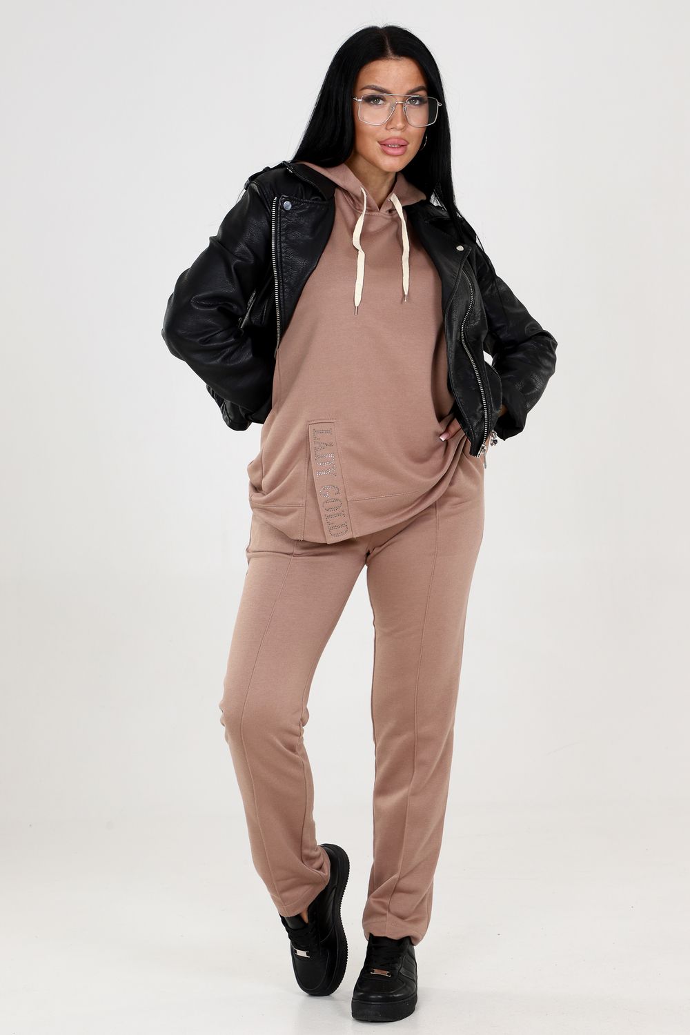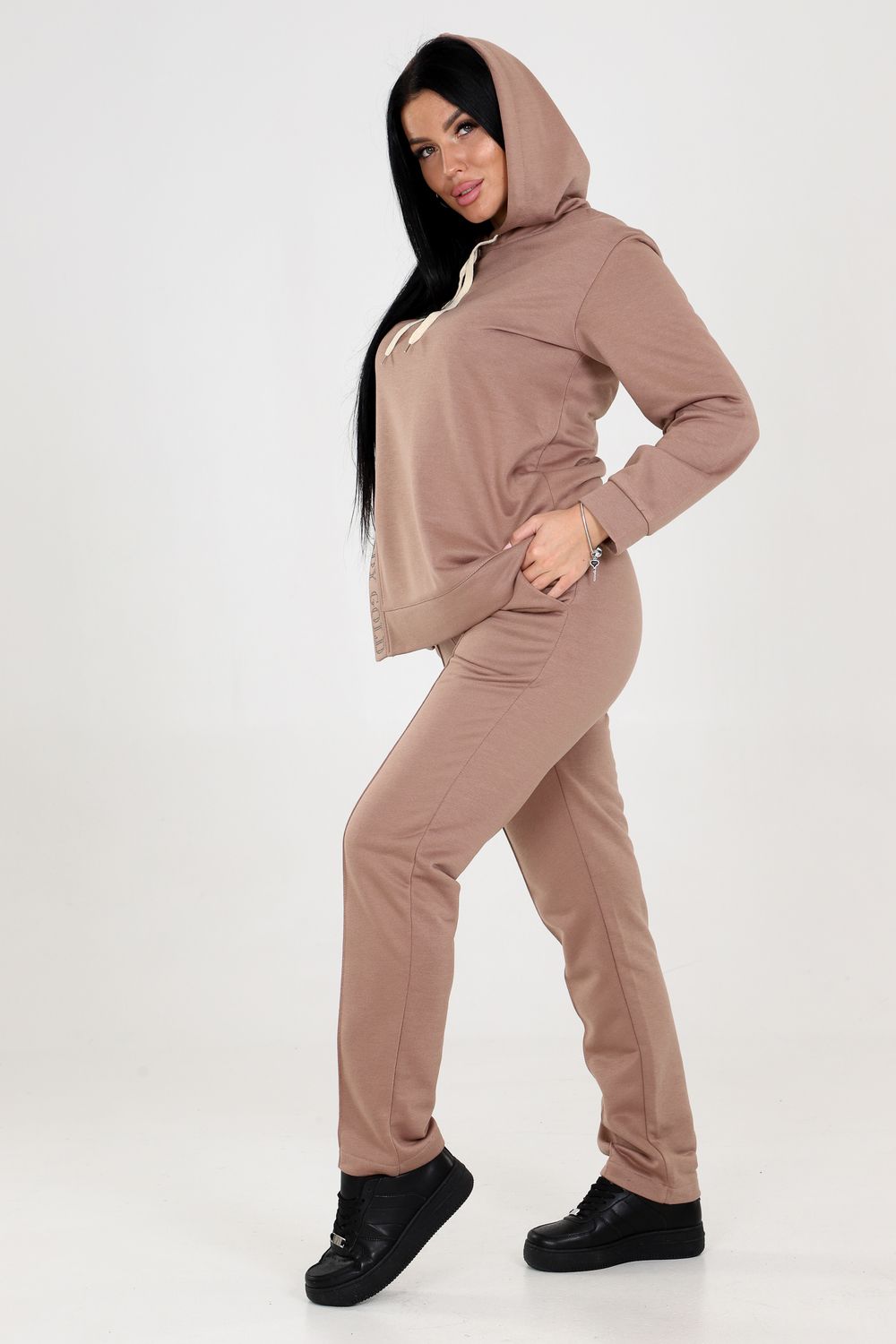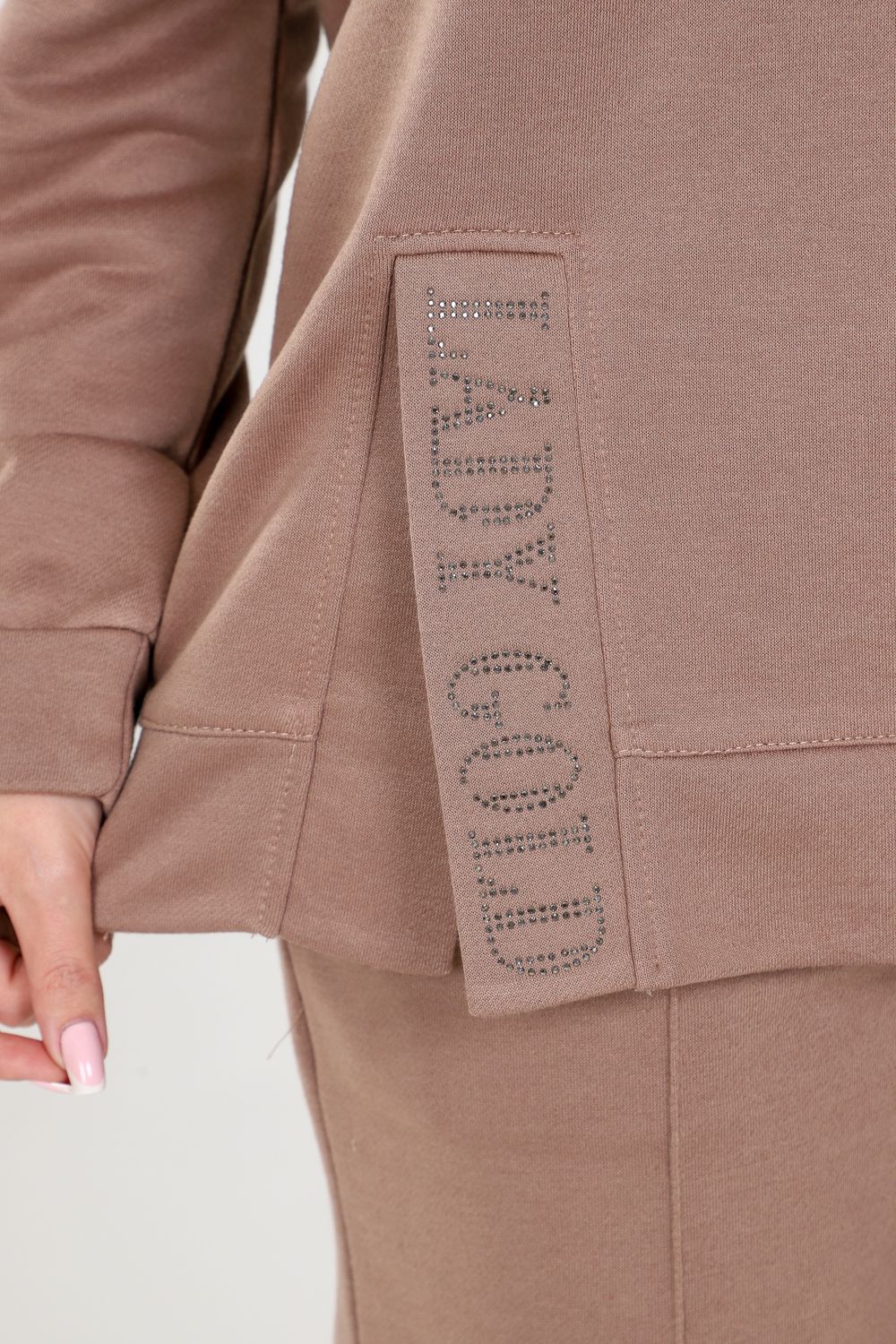 Туника с капюшоном. Разрез туники оформлен стразами, придающими блеск и привлекательность. Это прекрасная деталь, которая подчеркнет вашу индивидуальность и притянет взгляды окружающих. Брюки этого костюма оснащены резинкой, что обеспечивает идеальную посадку и комфорт в носке. Вы будете ощущать себя уверенно и свободно, благодаря оптимальной посадке брюк.