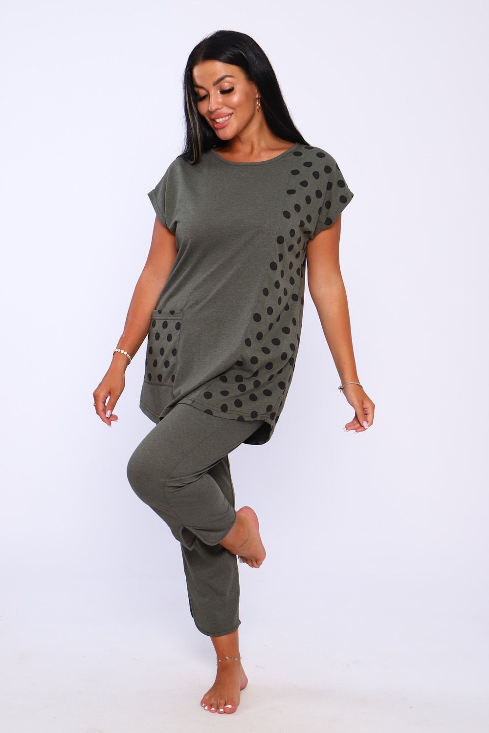 Костюм состоит из футболки свободного кроя и укороченных брюк с карманами.