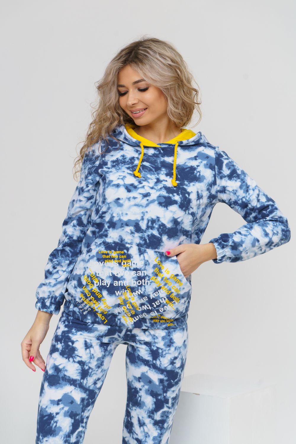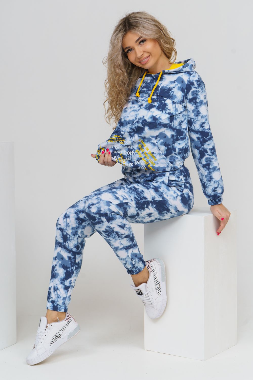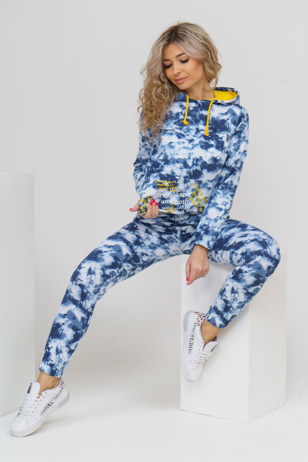 Яркий стильный костюм с дизайном тай-дай и принтом в виде надписи состоит из толстовки и брюк. Толстовка с капюшоном и жёлтой вставкой внутри сочетается с надписью на кармане кенгуру и шнурком. Низ толстовки и рукава на резинке. Брюки с карманами и резинкой на талии и по низу. Тай-дай без сомнения получил титул самого популярного принта сезона. Этот, как его часто называют " психоделический" узор, в миг заполнил хроники стритстайла и инстаграм модниц.