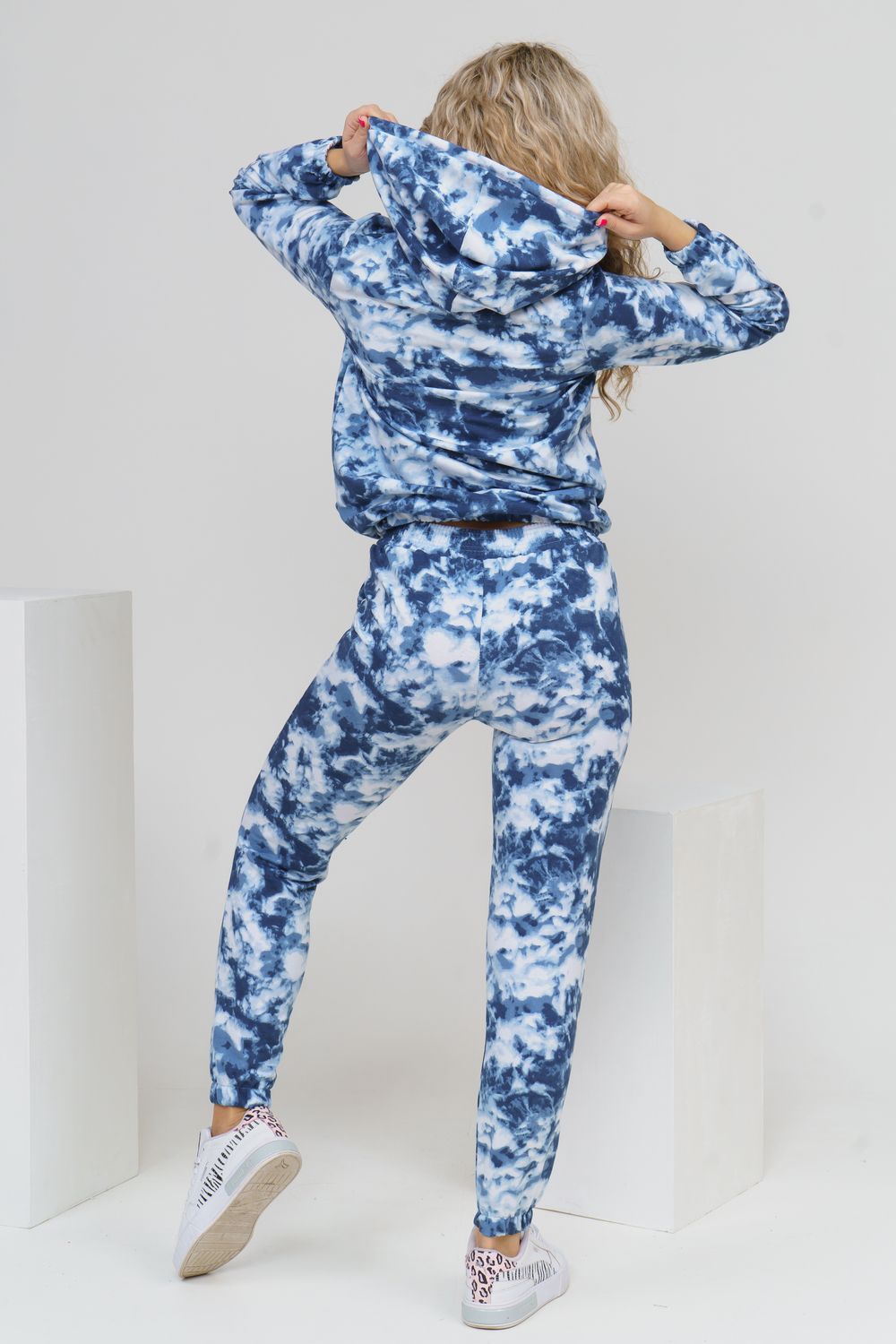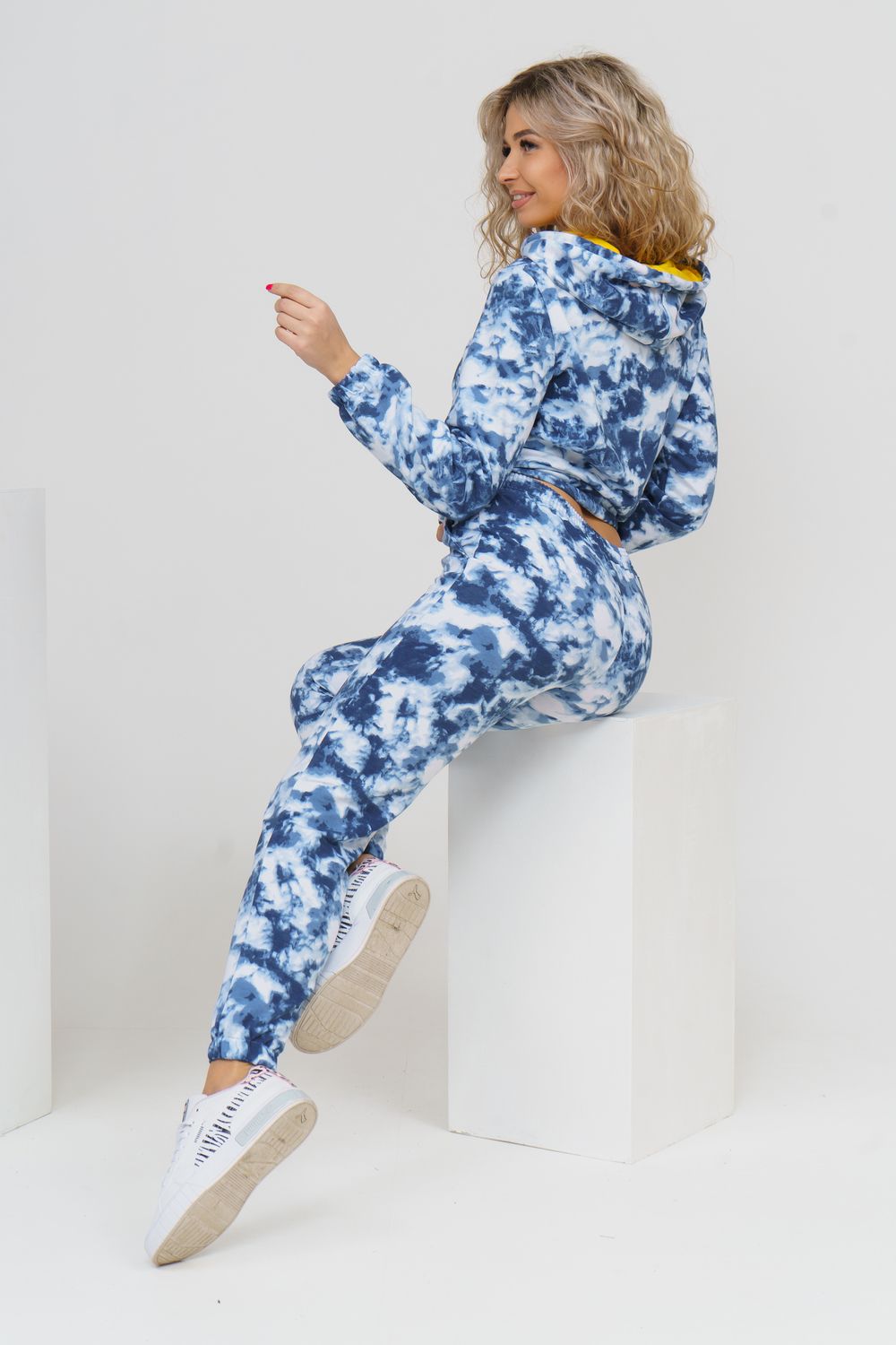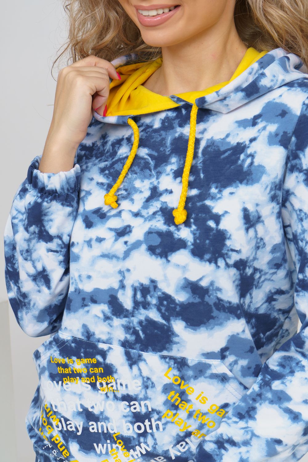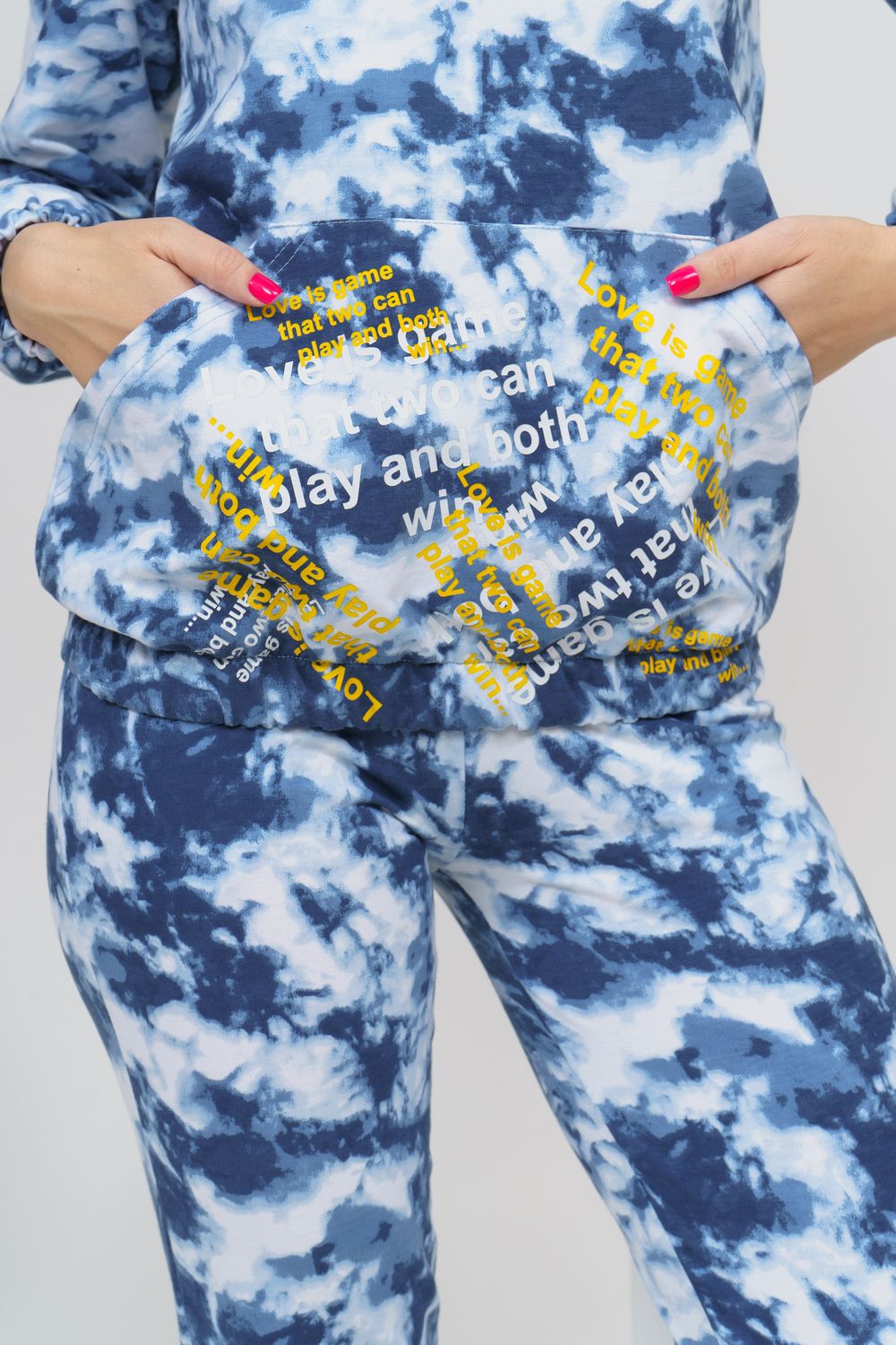 Яркий стильный костюм с дизайном тай-дай и принтом в виде надписи состоит из толстовки и брюк. Толстовка с капюшоном и жёлтой вставкой внутри сочетается с надписью на кармане кенгуру и шнурком. Низ толстовки и рукава на резинке. Брюки с карманами и резинкой на талии и по низу. Тай-дай без сомнения получил титул самого популярного принта сезона. Этот, как его часто называют " психоделический" узор, в миг заполнил хроники стритстайла и инстаграм модниц.