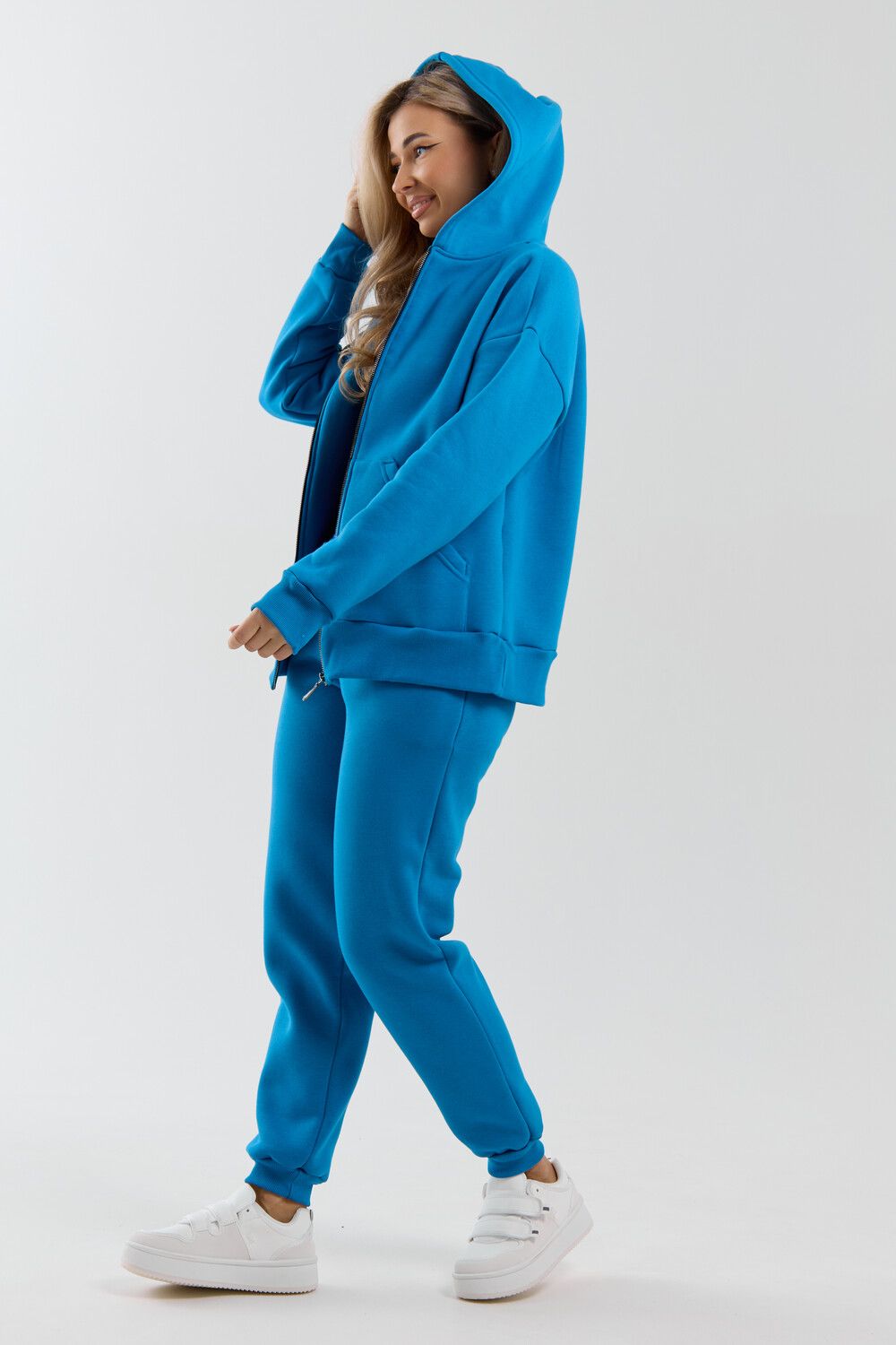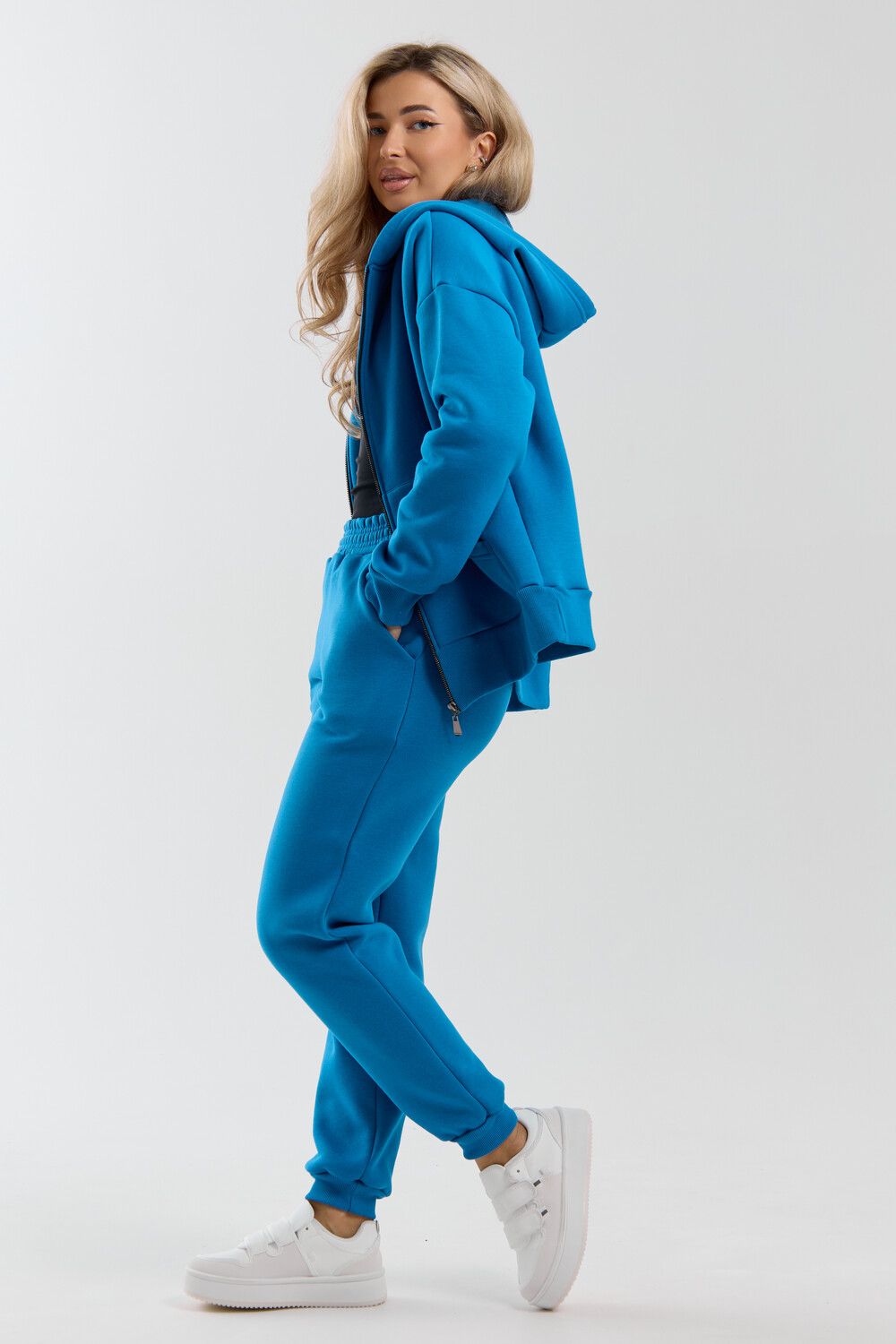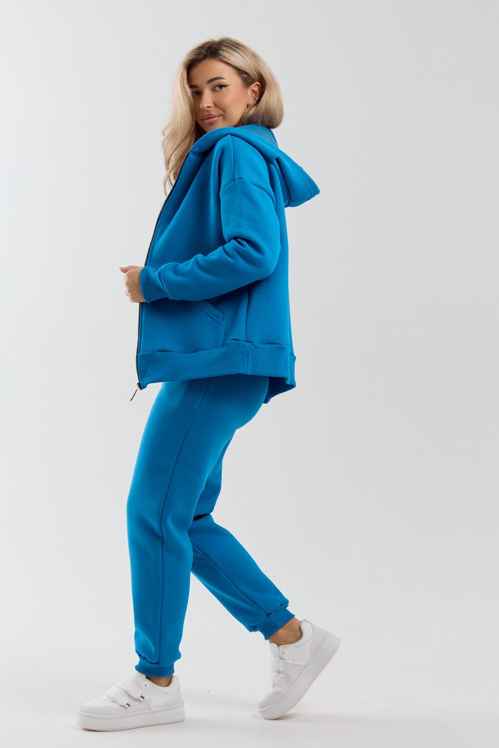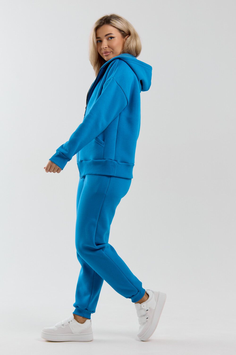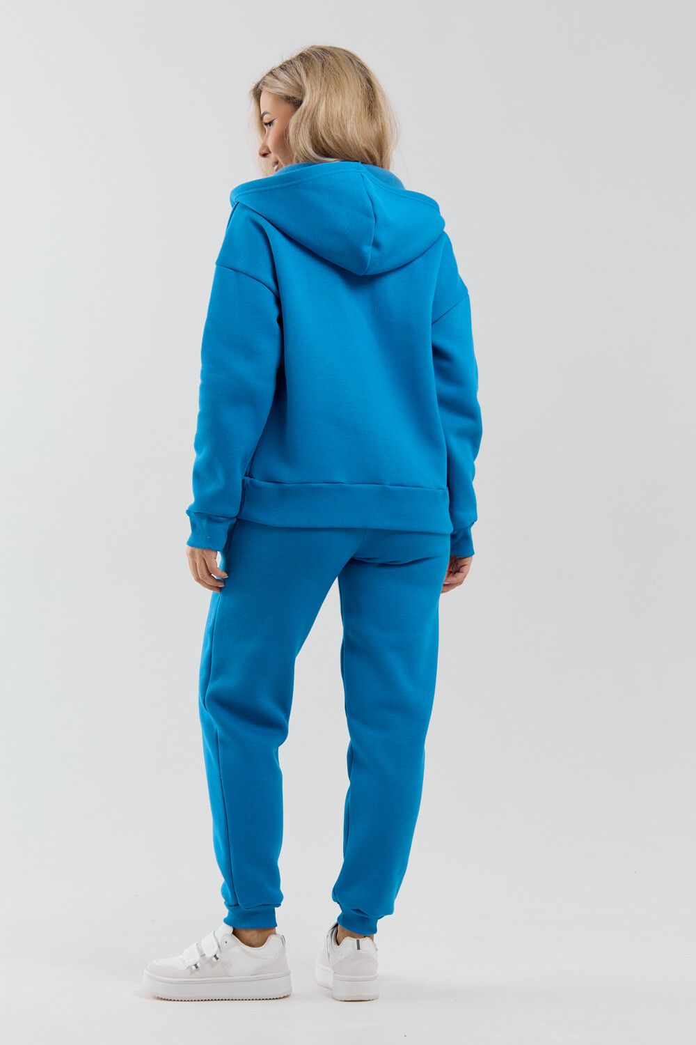 Модный женский костюм выполнен из качественного футера 3-нитки с начёсом, который обладает необыкновенной мягкостью, натуральностью, гипоаллергенностью и формоустойчивостью (при правильном уходе и стирке 30-40 °С), и обеспечивает максимальное удобство и комфорт при носке. Костюм состоит из современной "zip hoodi" свободного силуэта, которую дополняет: рукав с актуальной сейчас спущенной линией плеча, удобные карманы кенгуру и манжеты. Молния выполнена из качественных пластиковых зубьев закрепленных на прочной тесьме со стойким металлическим напылением, что обеспечивает плавное скольжение бегунка. А также удобные брюки, которые дополнены вместительными боковыми карманами, поясом выполненным на специализированной поясной машине и манжетами выполненными из качественного кашкорсе. Длина рукава указана от точки основания шеи.