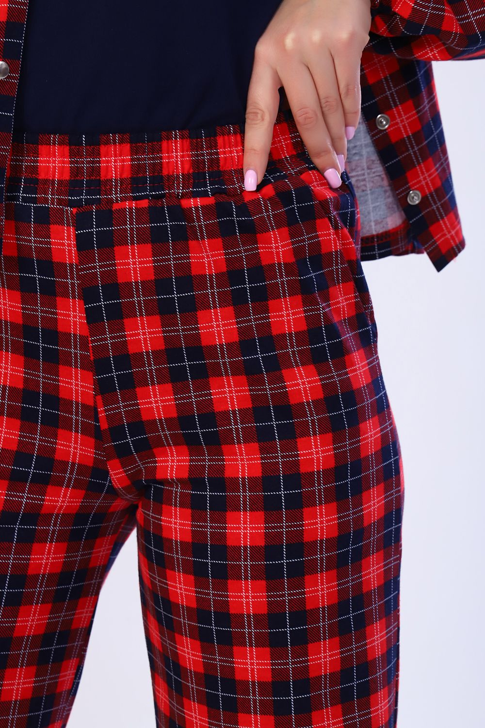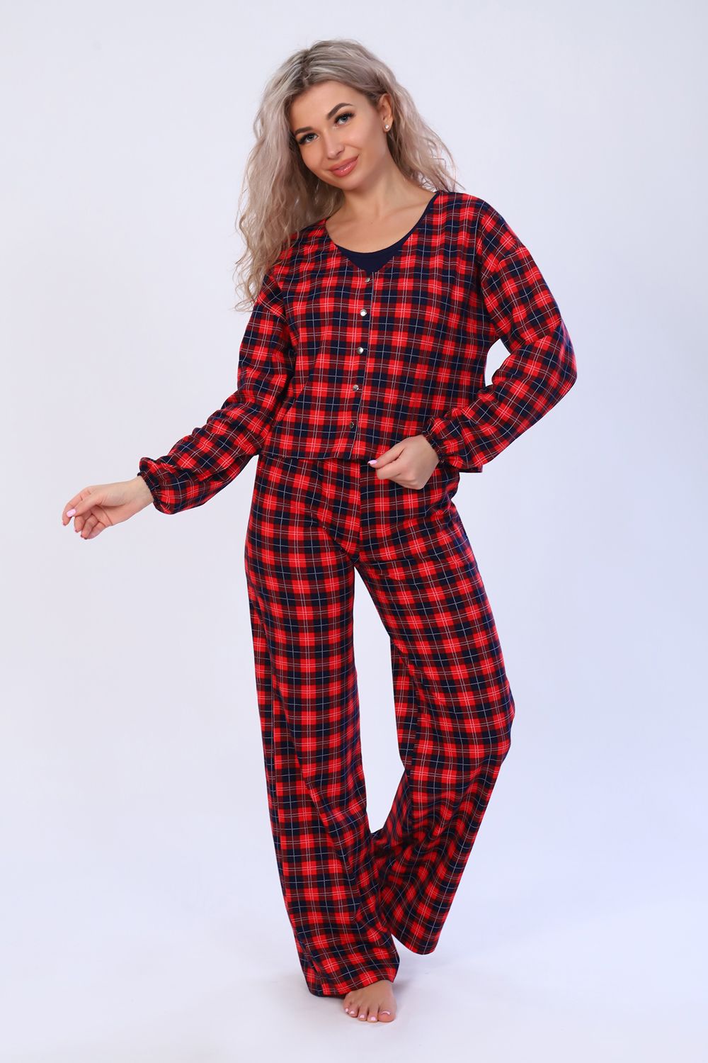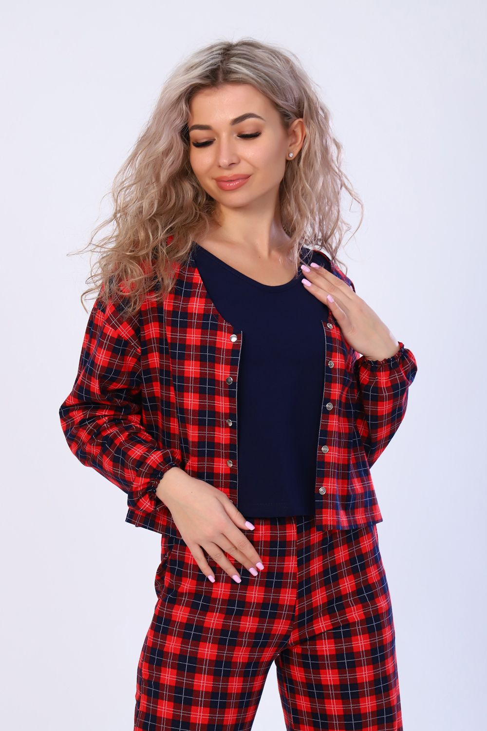 Женский костюм 3-ка из 100% хлопчатобумажного полотна в клетку - это идеальный вариант поднять настроение себе и окружающим! Стильный домашний комплект с брюками - незаменимая вещь в гардеробе каждой модницы. Костюм состоит из рубашки, майки и брюк палаццо. Рубашка с V-образным вырезом, длинным рукавом на резинке и застёгивающаяся на современные кнопки. Майка классическая, однотонная, без рукава. И конечно брюки палаццо успешно конкурирующие с другими моделями. Пояс брюк выполнен на специализированной поясной машине, по бокам имеются вместительные карманы. Комплект хорошо садится на любую фигуру, удобный крой позволяет чувствовать себя свободно, а всеми любимая расцветка придаёт образу лёгкость и романтичность.