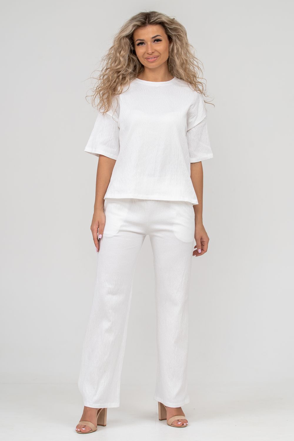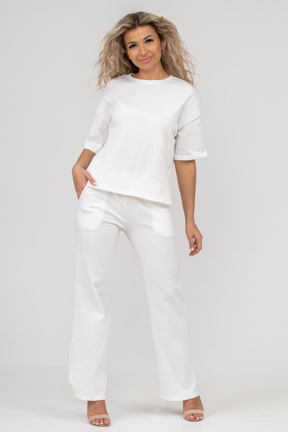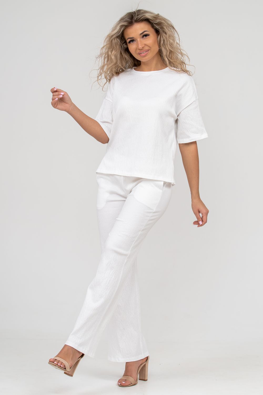 Модный стильный костюм - идеальное решение для тех, кто ищет лёгкую и красивую одежду на каждый день. Костюм, футболка и брюки, выполнен из кулирки гипе жатка компакт. Жатка - это ткань с "мятой" структурой, декоративными заломами и складками. Имеет много положительных качеств: хорошо тянется, упругая, красивая текстура, неприхотливая в уходе, прочная, износостойкая, не мнётся, не нуждается в глажке и приятная к телу. Футболка выполнена со спущенным рукавом, отстроченной обтачкой по горловине и двумя небольшими разрезами по бокам. На брюках имеется два вместительных боковых кармана и пояс, обработанный на специализированной поясной машине. Данная модель костюма очень удобна в качестве повседневной одежды, а универсальный фасон хорошо скроет недостатки и подчеркнет достоинства фигуры. Свободный крой комплекта "двойки" не сковывает движения, что делает его очень удобным в носке, резинка не перекручивается, а высокая посадка брюк - палаццо даёт ощущение комфорта. Такой костюм можно использовать как в качестве костюма для фитнеса, так и как вариант домашнего костюма, в нем также можно поехать на дачу или отправиться на вечернюю прогулку. Однотонный дизайн летнего брючного костюма без принта, надписей и декоративных элементов будет гармонировать с любым стилем одежды, а дополнить образ с модным костюмчиком можно любимыми аксессуарами и украшениями. Свободную футболку и брючки можно носить как вместе, так и отдельно. Футболку с коротким рукавом и разрезами по бокам можно легко сочетать с джинсами, юбками и шортами. К брюкам с карманами можно также подобрать любой верх. Образ с костюмом можно дополнить кроссовками, кедами или туфлями. Мягкий, прочный, хлопковый материал не дает усадку, не теряет форму после стирки и не линяет, его можно стирать в режиме бережной стирки при 30 градусах. Также данный трикотажный костюм не скатывается и не вытягивается за счет небольшого количества полиэстера в составе. Такой однотонный костюм с широкими брюками подойдет для разной возрастной категории. Он идеально подойдет для беременных и мам с детьми. Хорошо сядет на высоких и невысоких представительницах прекрасного пола всех возрастов. Такой универсальный прогулочный женский костюм станет отличным подарочным вариантом, его можно подарить маме, дочери, жене, бабушке, подруге или порадовать себя любимую даже без повода. Наш костюм благодаря своей практичности и лаконичному дизайну будет служить Вам долгие годы.