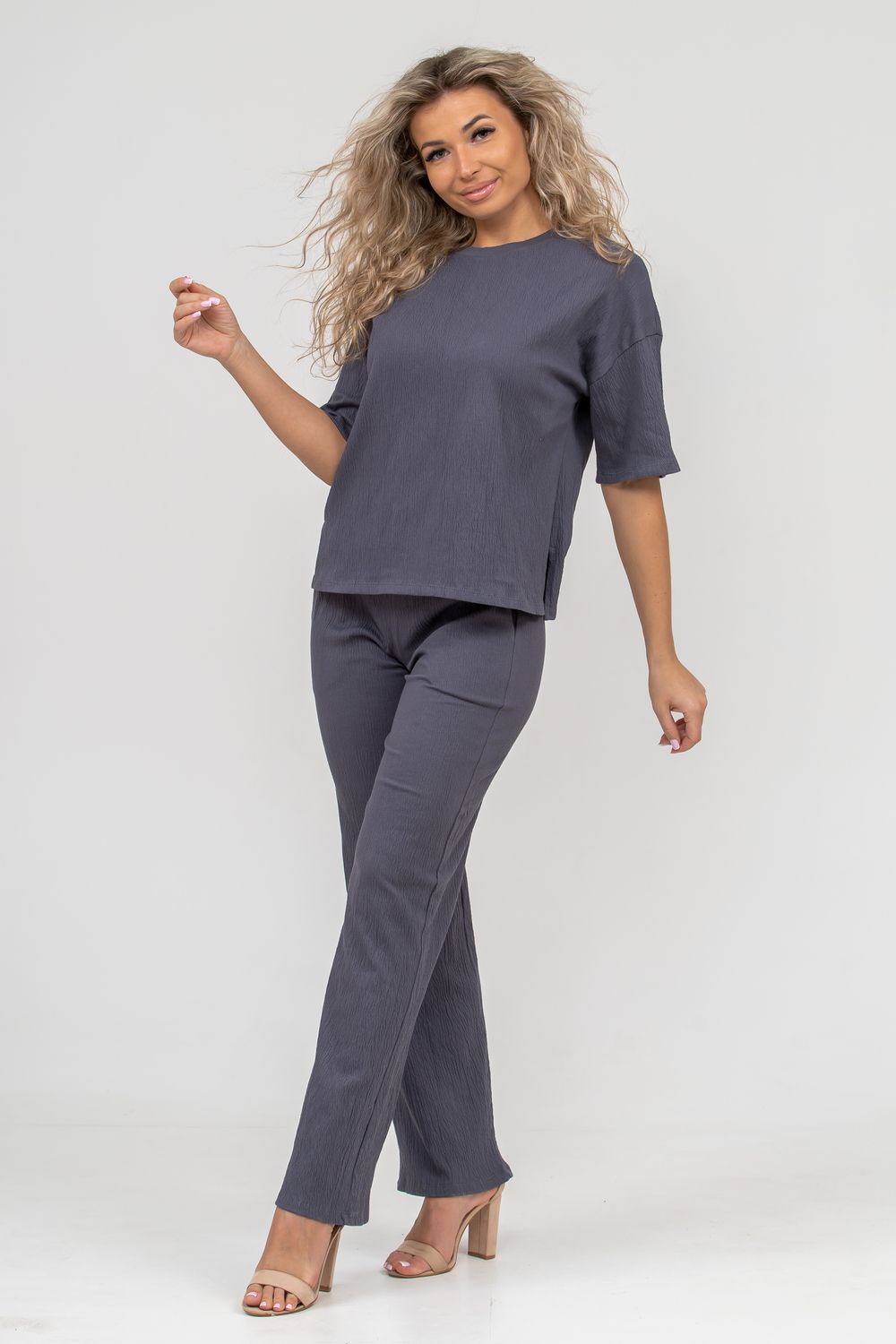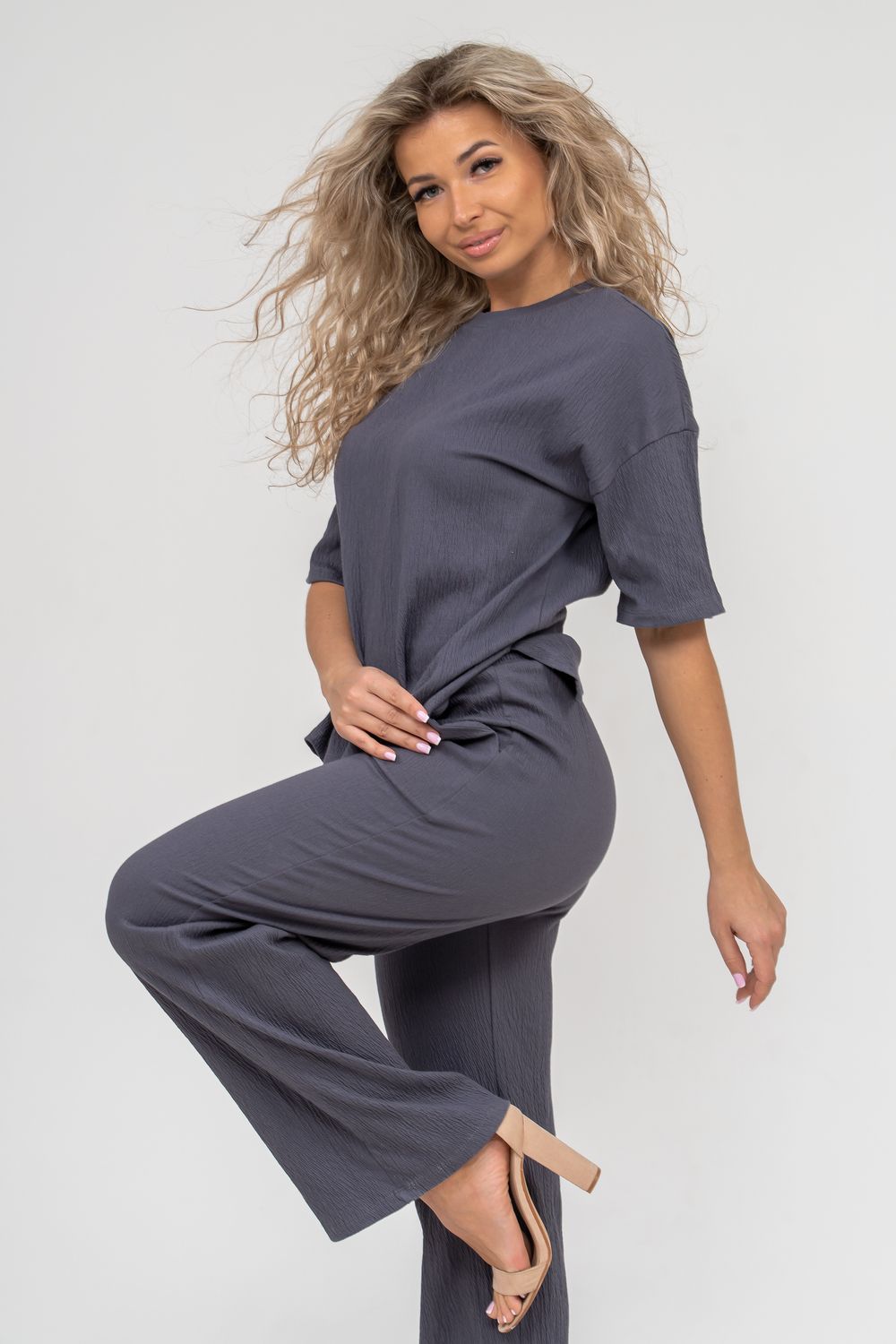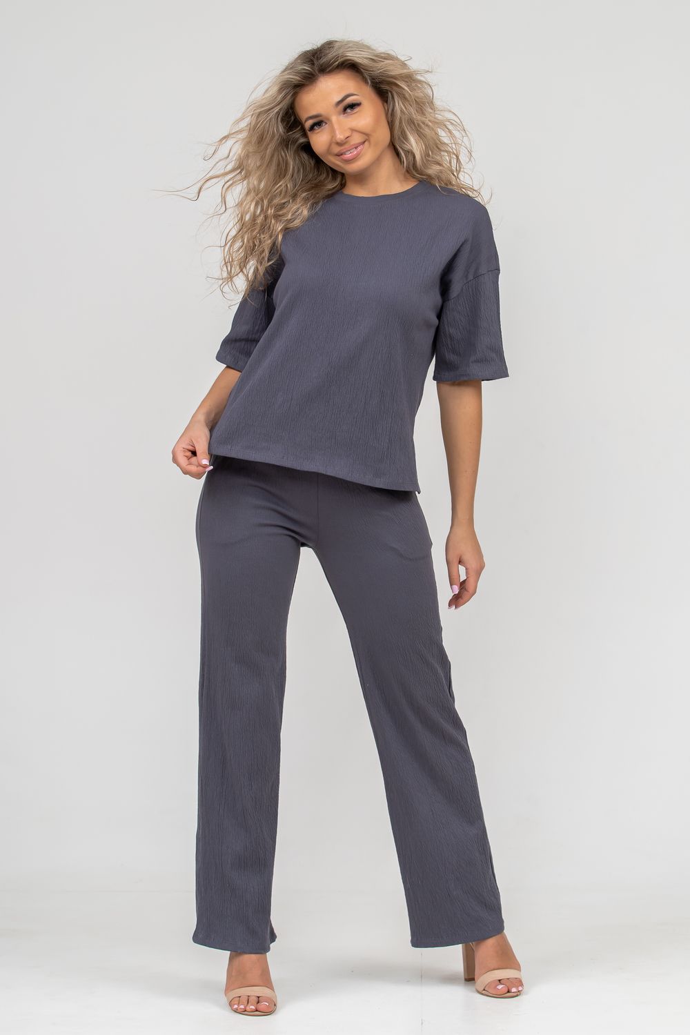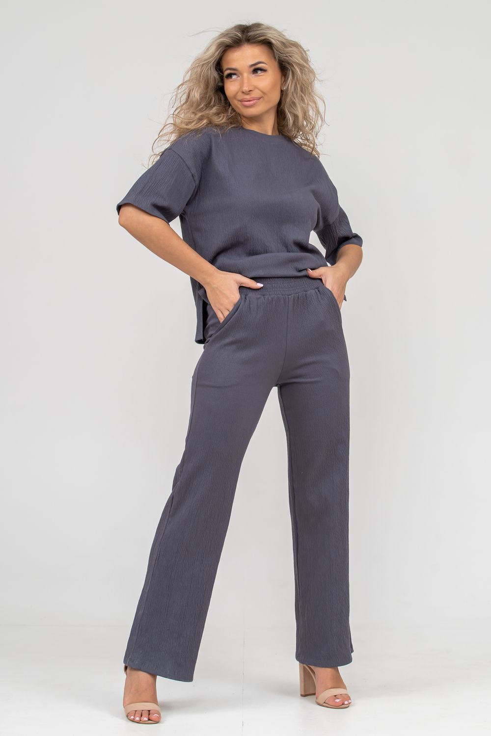 Модный стильный костюм - идеальное решение для тех, кто ищет лёгкую и красивую одежду на каждый день. Костюм, футболка и брюки, выполнен из кулирки гипе жатка компакт. Жатка - это ткань с "мятой" структурой, декоративными заломами и складками. Имеет много положительных качеств: хорошо тянется, упругая, красивая текстура, неприхотливая в уходе, прочная, износостойкая, не мнётся, не нуждается в глажке и приятная к телу. Футболка выполнена со спущенным рукавом, отстроченной обтачкой по горловине и двумя небольшими разрезами по бокам. На брюках имеется два вместительных боковых кармана и пояс, обработанный на специализированной поясной машине. Данная модель костюма очень удобна в качестве повседневной одежды, а универсальный фасон хорошо скроет недостатки и подчеркнет достоинства фигуры. Свободный крой комплекта "двойки" не сковывает движения, что делает его очень удобным в носке, резинка не перекручивается, а высокая посадка брюк - палаццо даёт ощущение комфорта. Такой костюм можно использовать как в качестве костюма для фитнеса, так и как вариант домашнего костюма, в нем также можно поехать на дачу или отправиться на вечернюю прогулку. Однотонный дизайн летнего брючного костюма без принта, надписей и декоративных элементов будет гармонировать с любым стилем одежды, а дополнить образ с модным костюмчиком можно любимыми аксессуарами и украшениями. Свободную футболку и брючки можно носить как вместе, так и отдельно. Футболку с коротким рукавом и разрезами по бокам можно легко сочетать с джинсами, юбками и шортами. К брюкам с карманами можно также подобрать любой верх. Образ с костюмом можно дополнить кроссовками, кедами или туфлями. Мягкий, прочный, хлопковый материал не дает усадку, не теряет форму после стирки и не линяет, его можно стирать в режиме бережной стирки при 30 градусах. Также данный трикотажный костюм не скатывается и не вытягивается за счет небольшого количества полиэстера в составе. Такой однотонный костюм с широкими брюками подойдет для разной возрастной категории. Он идеально подойдет для беременных и мам с детьми. Хорошо сядет на высоких и невысоких представительницах прекрасного пола всех возрастов. Такой универсальный прогулочный женский костюм станет отличным подарочным вариантом, его можно подарить маме, дочери, жене, бабушке, подруге или порадовать себя любимую даже без повода. Наш костюм благодаря своей практичности и лаконичному дизайну будет служить Вам долгие годы.