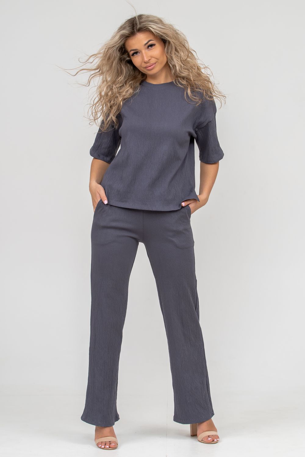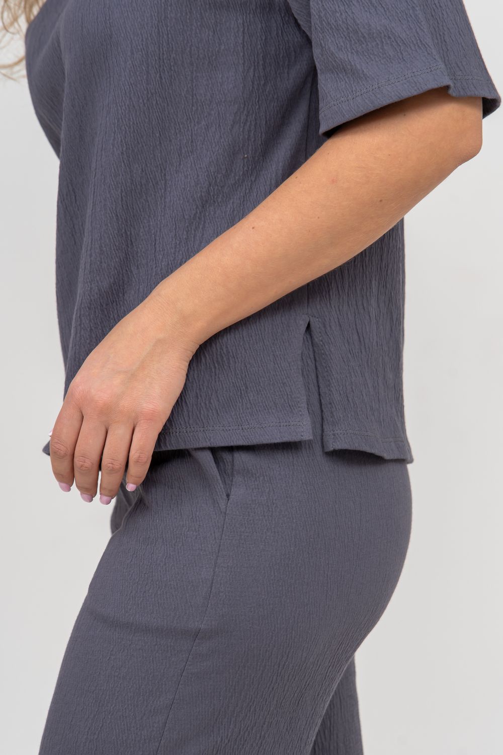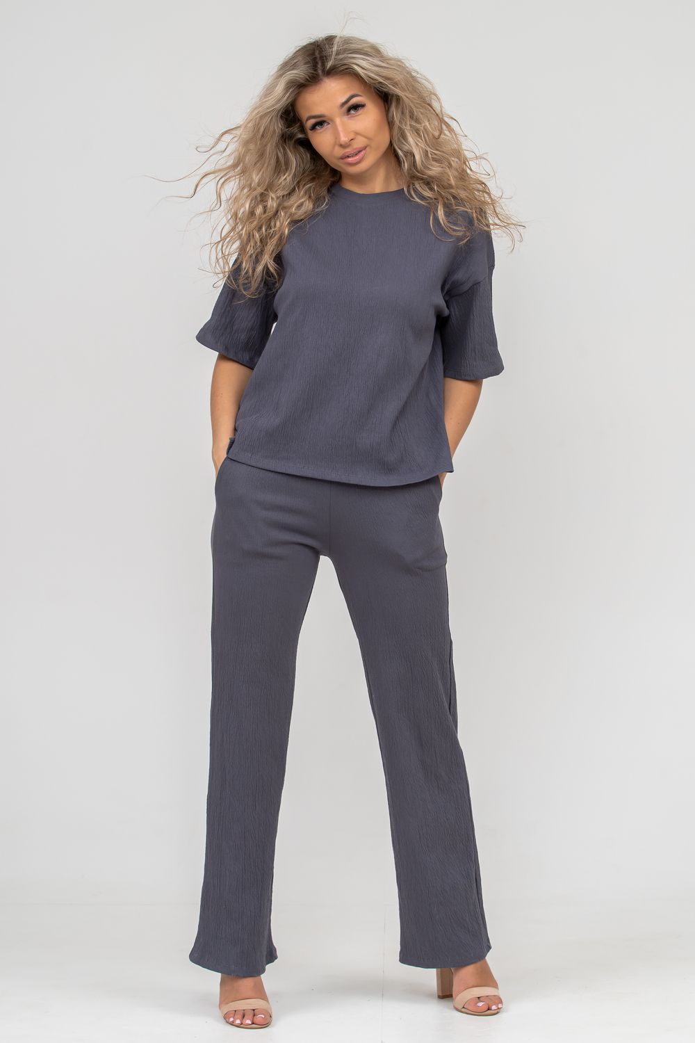 Модный стильный костюм - идеальное решение для тех, кто ищет лёгкую и красивую одежду на каждый день. Костюм, футболка и брюки, выполнен из кулирки гипе жатка компакт. Жатка - это ткань с "мятой" структурой, декоративными заломами и складками. Имеет много положительных качеств: хорошо тянется, упругая, красивая текстура, неприхотливая в уходе, прочная, износостойкая, не мнётся, не нуждается в глажке и приятная к телу. Футболка выполнена со спущенным рукавом, отстроченной обтачкой по горловине и двумя небольшими разрезами по бокам. На брюках имеется два вместительных боковых кармана и пояс, обработанный на специализированной поясной машине. Данная модель костюма очень удобна в качестве повседневной одежды, а универсальный фасон хорошо скроет недостатки и подчеркнет достоинства фигуры. Свободный крой комплекта "двойки" не сковывает движения, что делает его очень удобным в носке, резинка не перекручивается, а высокая посадка брюк - палаццо даёт ощущение комфорта. Такой костюм можно использовать как в качестве костюма для фитнеса, так и как вариант домашнего костюма, в нем также можно поехать на дачу или отправиться на вечернюю прогулку. Однотонный дизайн летнего брючного костюма без принта, надписей и декоративных элементов будет гармонировать с любым стилем одежды, а дополнить образ с модным костюмчиком можно любимыми аксессуарами и украшениями. Свободную футболку и брючки можно носить как вместе, так и отдельно. Футболку с коротким рукавом и разрезами по бокам можно легко сочетать с джинсами, юбками и шортами. К брюкам с карманами можно также подобрать любой верх. Образ с костюмом можно дополнить кроссовками, кедами или туфлями. Мягкий, прочный, хлопковый материал не дает усадку, не теряет форму после стирки и не линяет, его можно стирать в режиме бережной стирки при 30 градусах. Также данный трикотажный костюм не скатывается и не вытягивается за счет небольшого количества полиэстера в составе. Такой однотонный костюм с широкими брюками подойдет для разной возрастной категории. Он идеально подойдет для беременных и мам с детьми. Хорошо сядет на высоких и невысоких представительницах прекрасного пола всех возрастов. Такой универсальный прогулочный женский костюм станет отличным подарочным вариантом, его можно подарить маме, дочери, жене, бабушке, подруге или порадовать себя любимую даже без повода. Наш костюм благодаря своей практичности и лаконичному дизайну будет служить Вам долгие годы.