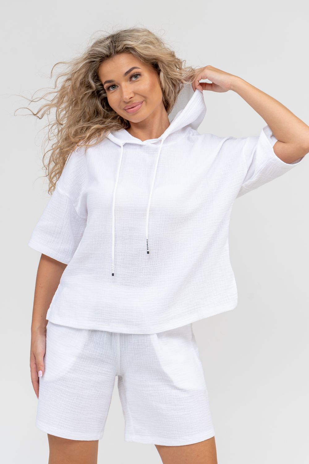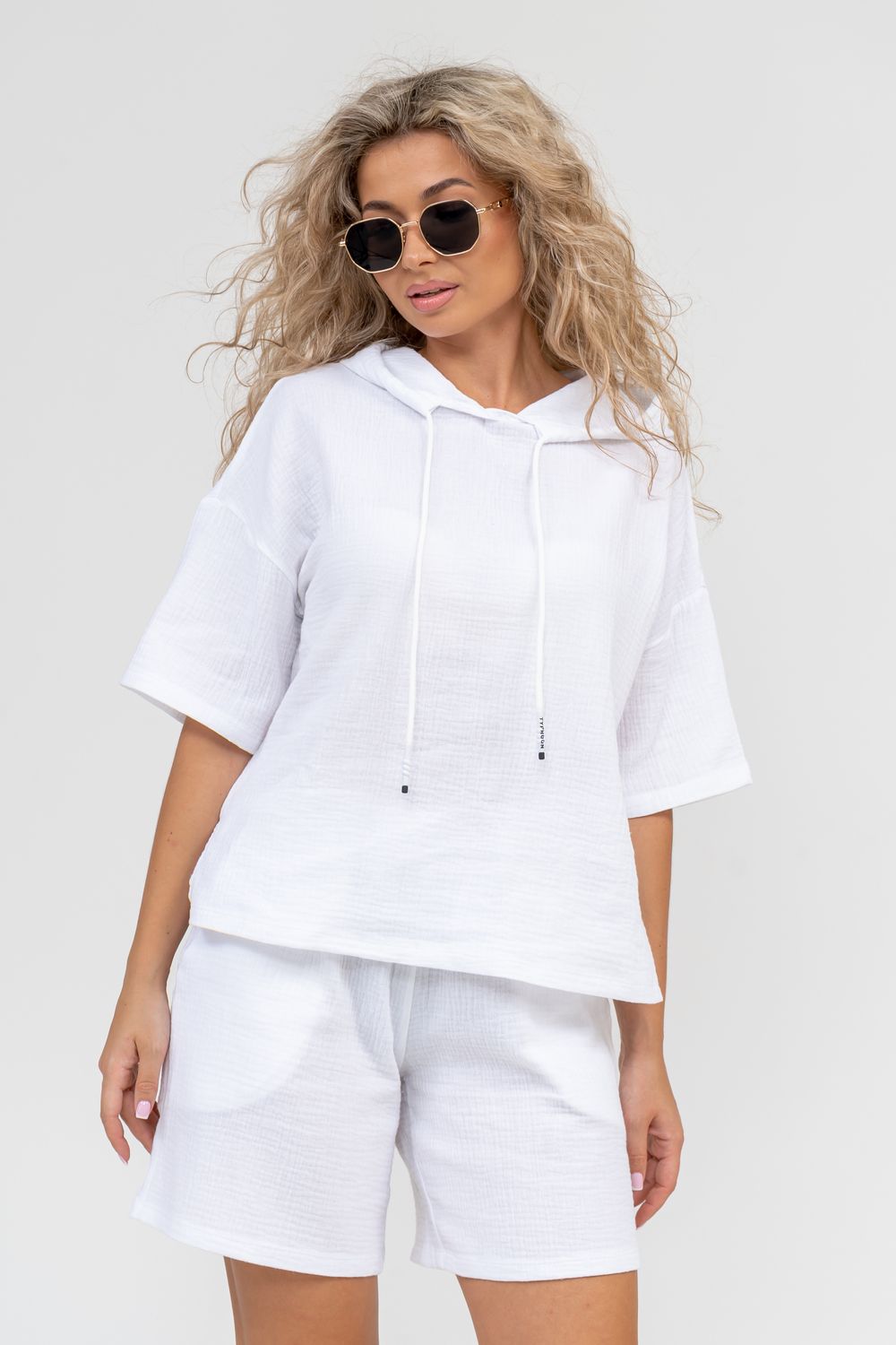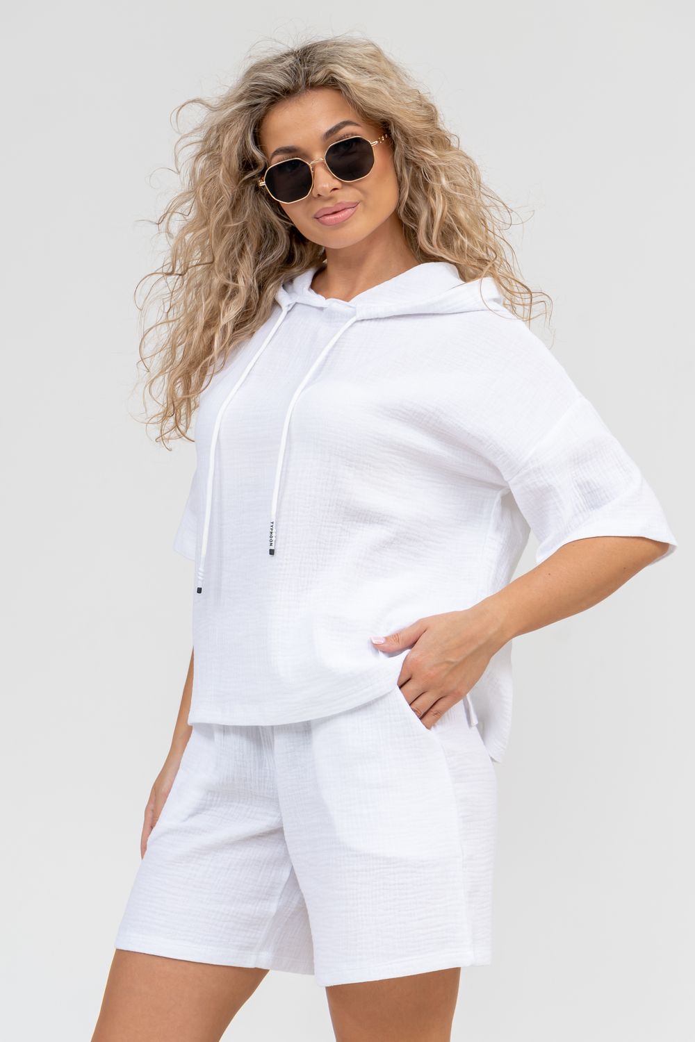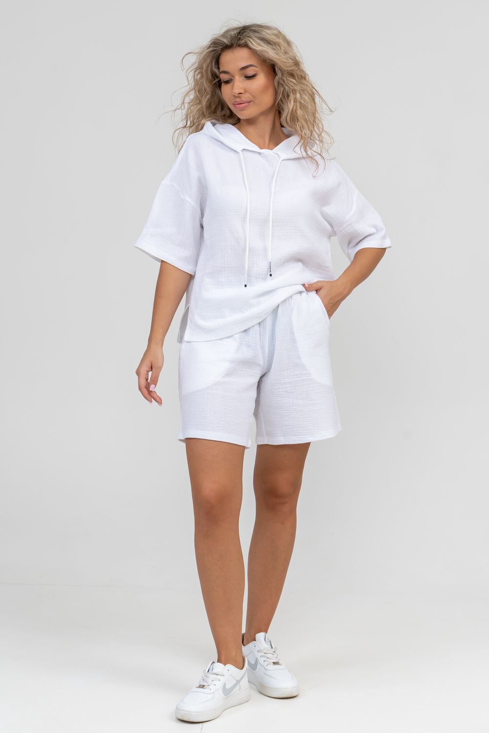 Стильный современный костюм выполнен из 2-х слойного жатого муслина. Этот воздушный и приятный к телу материал, практически не ощущается на теле, идеально дышит и быстро сохнет при намокании. Костюм состоит из футболки и шорт. Толстовка с капюшоном и шнурком. Линия плеча спущена, рукав укороченный, по бокам имеются небольшие разрезы. Свободный крой прекрасно будет смотреться на дамах с любыми формами. Костюм такого плана представлен в широкой размерной сетке, что позволяет выбрать его как девушке, так и женщине. Однотонный костюм модных расцветок будет удачным выбором для поездок в отпуск, на пикник, для активного отдыха и прогулок по городу. Будет гармонично сочетаться как с кроссовками, так и с туфлями, балетками или босоножками. Используя эту модель в качестве домашнего костюма, Вы поймёте, что это именно тот самый идеальный вариант, в котором вы будете себя чувствовать удобно, комфортно и современно. Модель такого плана идеально подойдёт и в качестве подарка для себя и своих любимых. Костюм с шортами - это настоящая находка для тех, кто ценит свою индивидуальность! Стирать муслиновые вещи нужно только в тёплой воде при температуре не выше 40°С.