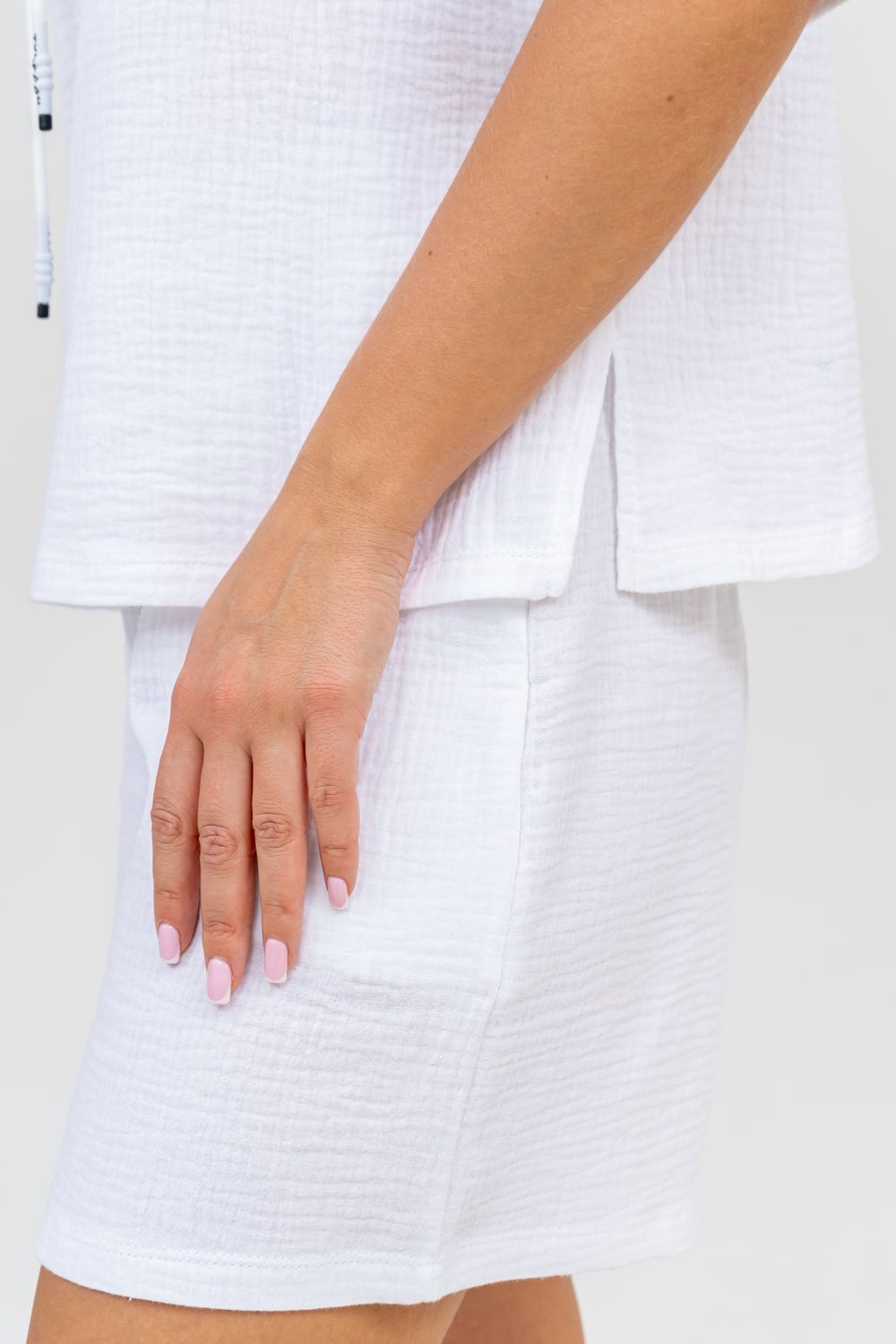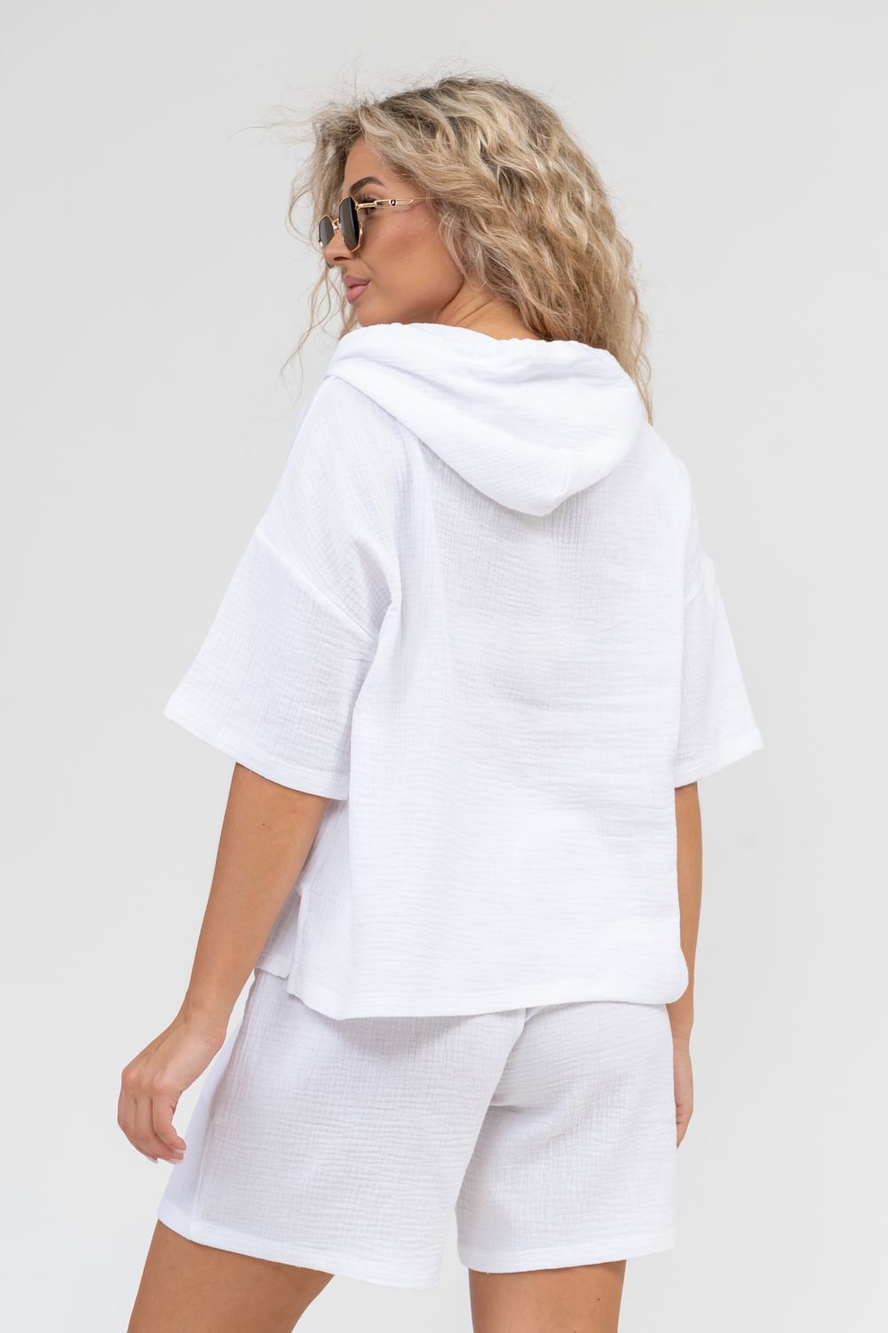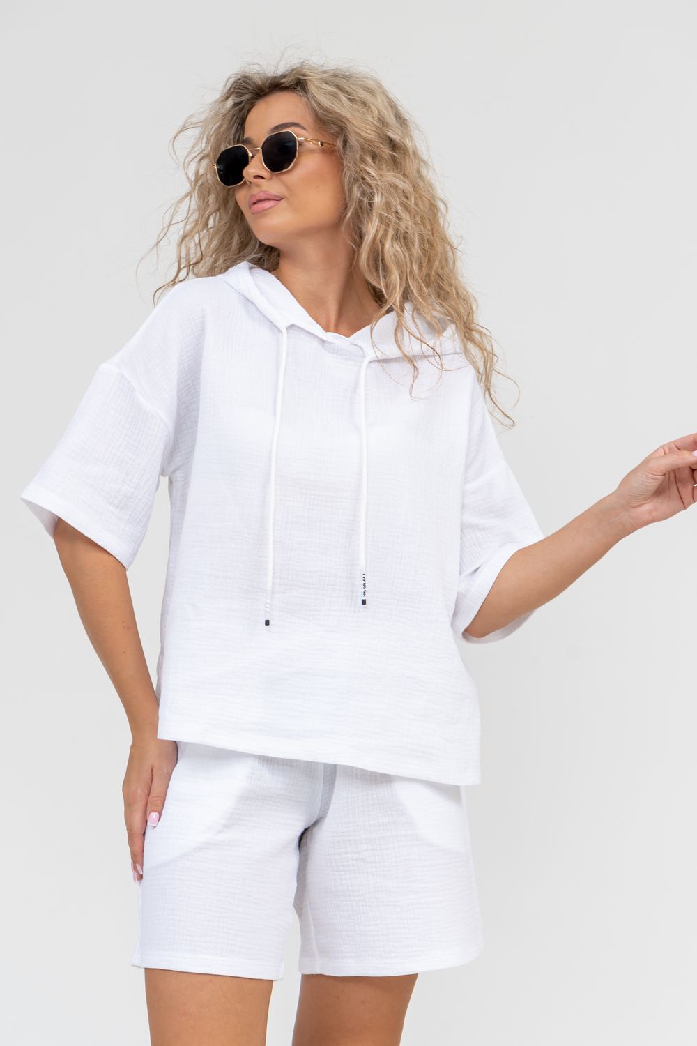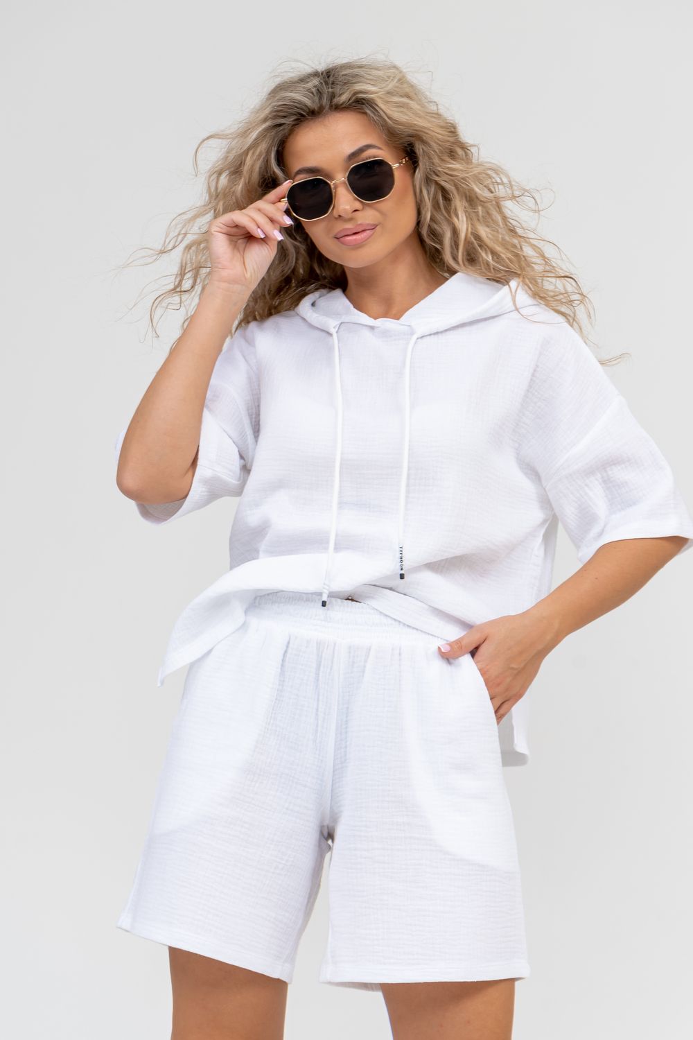 Стильный современный костюм выполнен из 2-х слойного жатого муслина. Этот воздушный и приятный к телу материал, практически не ощущается на теле, идеально дышит и быстро сохнет при намокании. Костюм состоит из футболки и шорт. Толстовка с капюшоном и шнурком. Линия плеча спущена, рукав укороченный, по бокам имеются небольшие разрезы. Свободный крой прекрасно будет смотреться на дамах с любыми формами. Костюм такого плана представлен в широкой размерной сетке, что позволяет выбрать его как девушке, так и женщине. Однотонный костюм модных расцветок будет удачным выбором для поездок в отпуск, на пикник, для активного отдыха и прогулок по городу. Будет гармонично сочетаться как с кроссовками, так и с туфлями, балетками или босоножками. Используя эту модель в качестве домашнего костюма, Вы поймёте, что это именно тот самый идеальный вариант, в котором вы будете себя чувствовать удобно, комфортно и современно. Модель такого плана идеально подойдёт и в качестве подарка для себя и своих любимых. Костюм с шортами - это настоящая находка для тех, кто ценит свою индивидуальность! Стирать муслиновые вещи нужно только в тёплой воде при температуре не выше 40°С.