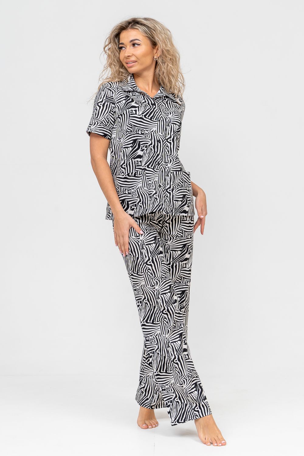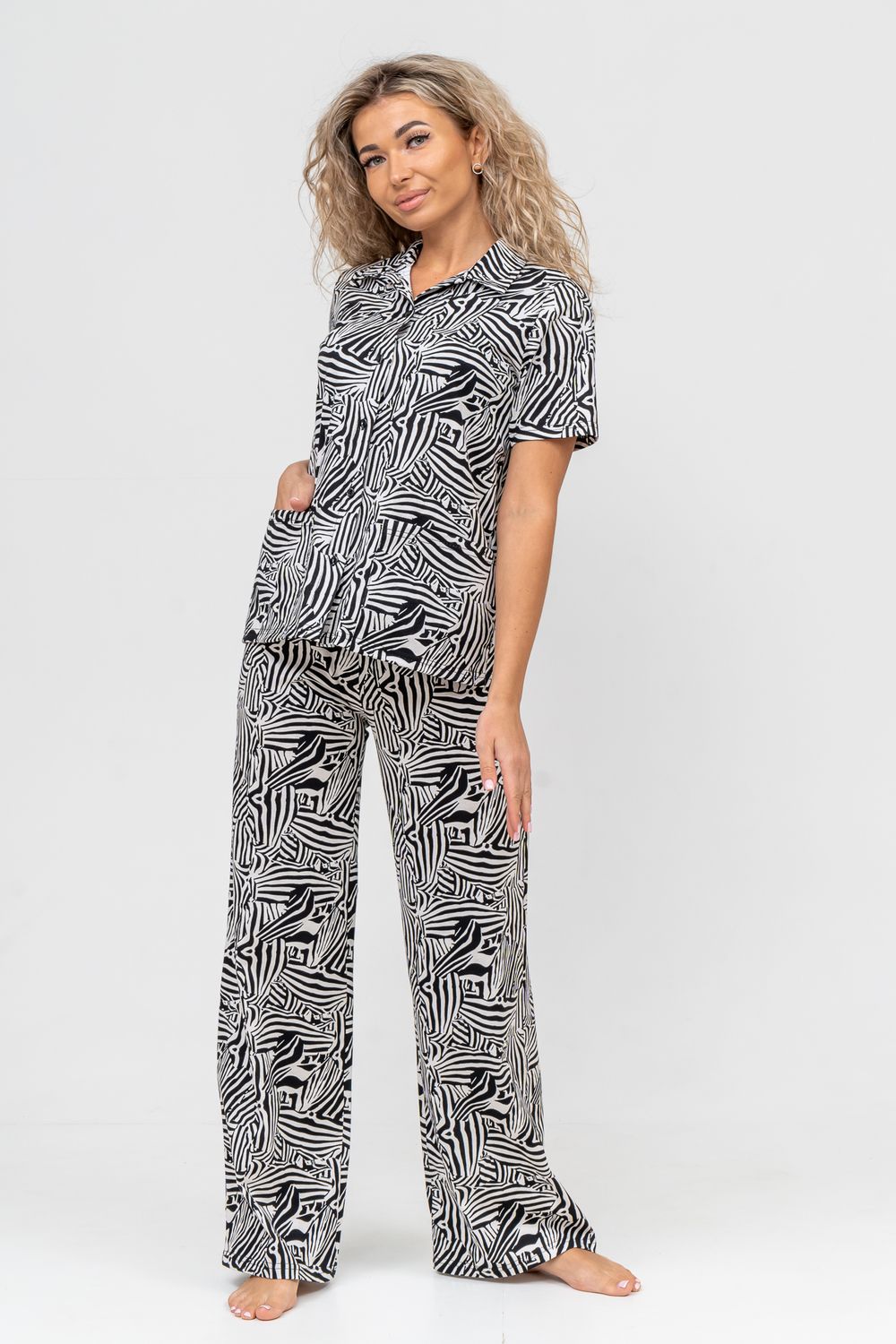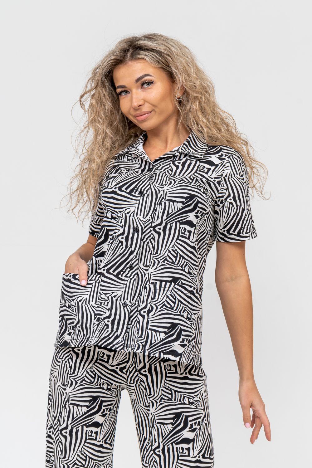 Модный костюм выполнен из 100% хлопчатобумажного полотна с трендовым "анималистичным" принтом зебра. Благодаря своей монохроматической цветовой палитре зебра делает любой образ уникальным и выразительным. Черно-белая расцветка будет самой актуальной в этом сезоне. Это одна из самых модных и популярных моделей сезона. Рубашка имеет классический рубашечный воротник, два накладных кармана и планку на пуговках. Брюки палаццо с высокой посадкой и поясом обработанным на специализированной поясной машине, делают их более удобными и комфортными. За счёт свободного фасона костюм можно носить с любым типом фигуры, отлично подойдёт для беременных женщин, а также кормящих мам. С помощью такого костюма Вы можете создать элегантный и неповторимый образ. Взять с собой в путешествие, на дачу, в санаторий или провести незабываемый вечер дома. Модель такого плана идеально подойдёт и в качестве подарка для себя и своих любимых! Современный костюм - это почти неотъемлемая часть гардероба любой женщины, которая сделает Вас неотразимой в любой ситуации.