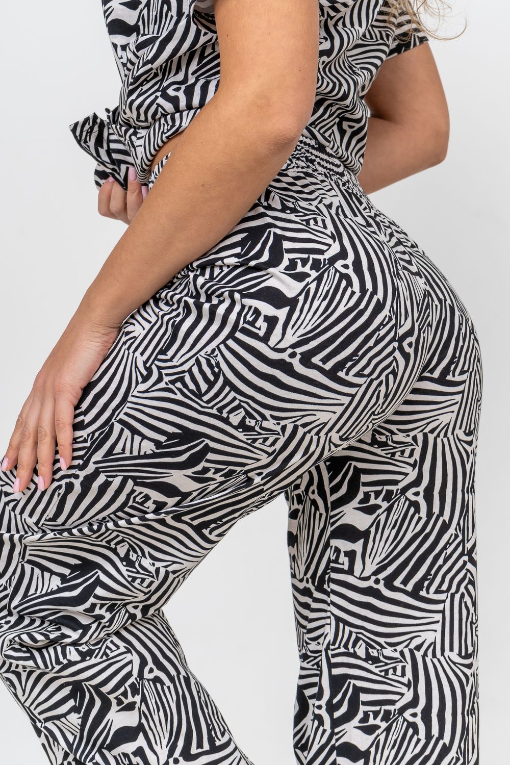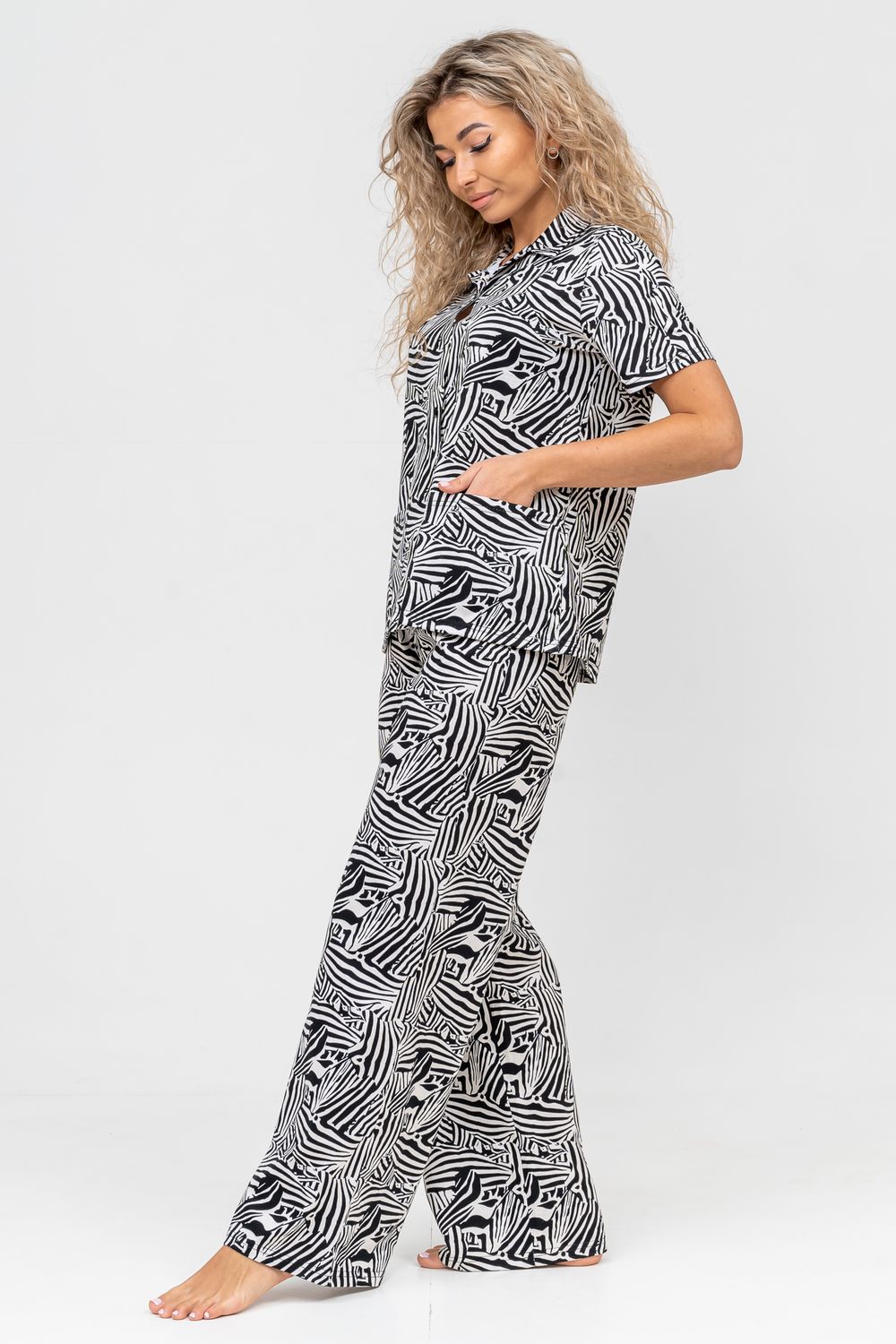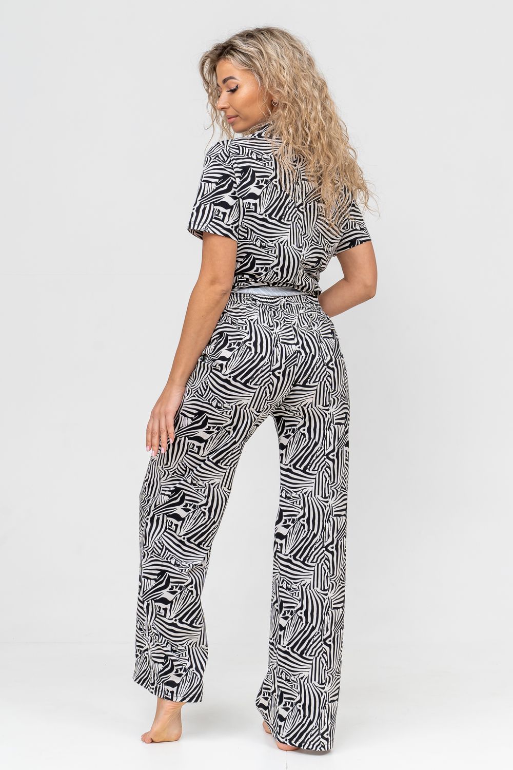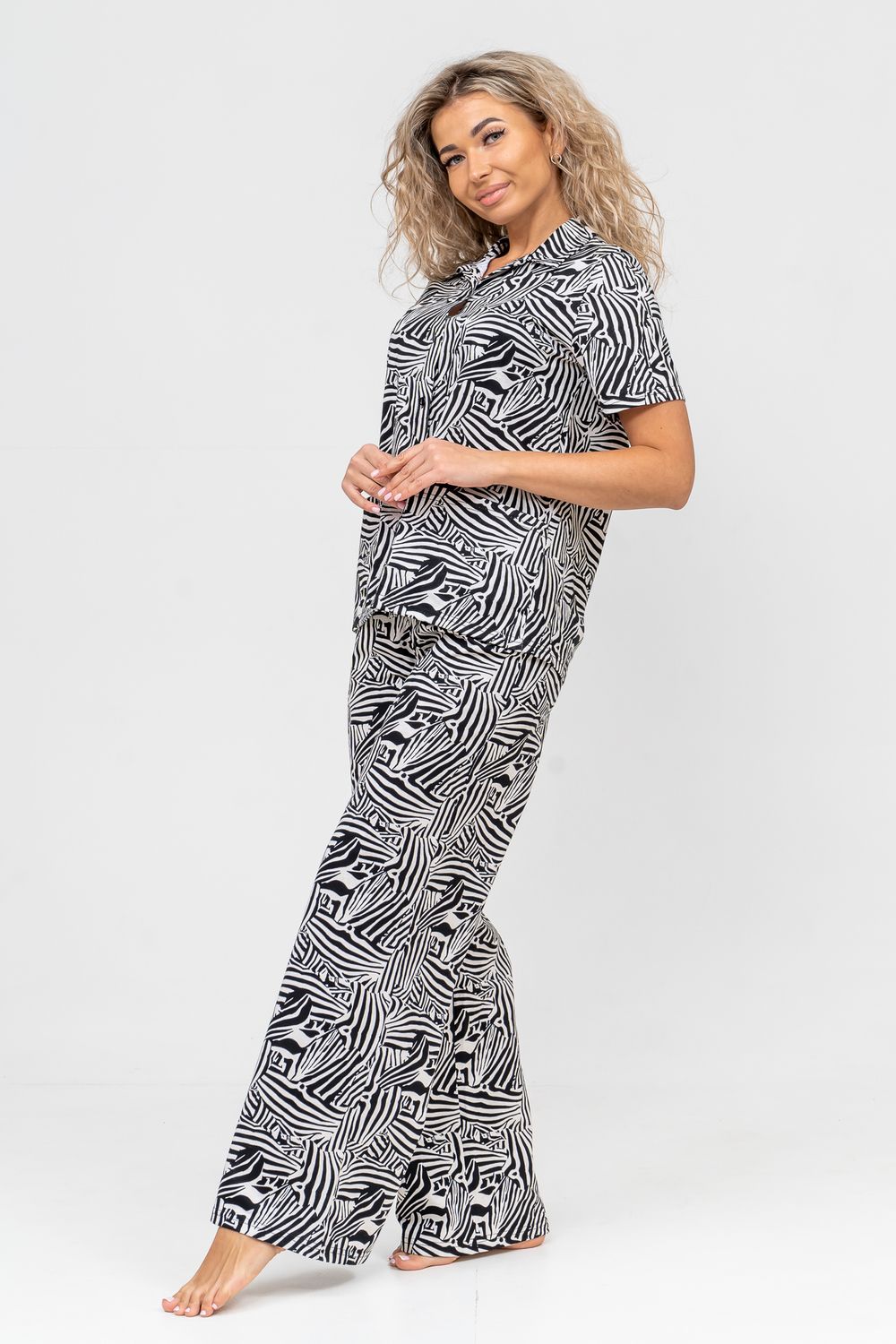 Модный костюм выполнен из 100% хлопчатобумажного полотна с трендовым "анималистичным" принтом зебра. Благодаря своей монохроматической цветовой палитре зебра делает любой образ уникальным и выразительным. Черно-белая расцветка будет самой актуальной в этом сезоне. Это одна из самых модных и популярных моделей сезона. Рубашка имеет классический рубашечный воротник, два накладных кармана и планку на пуговках. Брюки палаццо с высокой посадкой и поясом обработанным на специализированной поясной машине, делают их более удобными и комфортными. За счёт свободного фасона костюм можно носить с любым типом фигуры, отлично подойдёт для беременных женщин, а также кормящих мам. С помощью такого костюма Вы можете создать элегантный и неповторимый образ. Взять с собой в путешествие, на дачу, в санаторий или провести незабываемый вечер дома. Модель такого плана идеально подойдёт и в качестве подарка для себя и своих любимых! Современный костюм - это почти неотъемлемая часть гардероба любой женщины, которая сделает Вас неотразимой в любой ситуации.