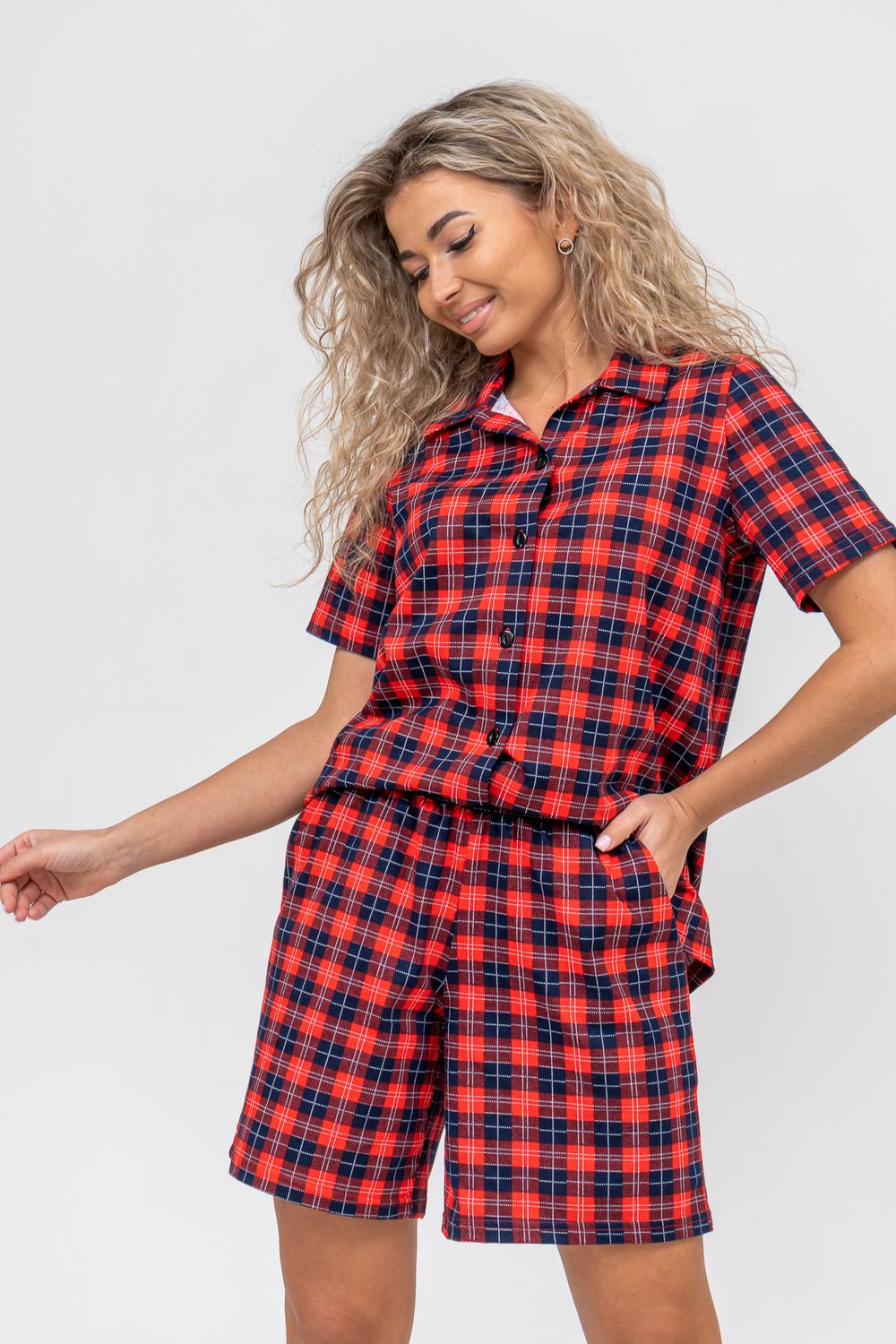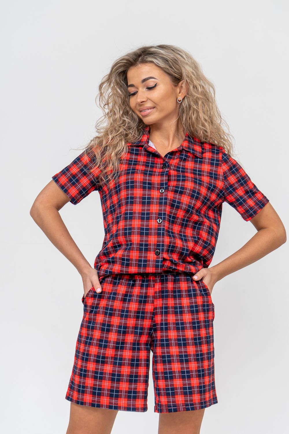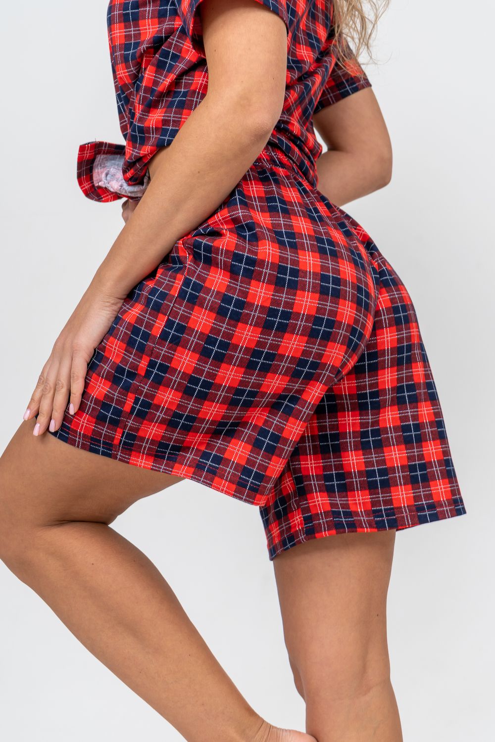 Женский костюм в клетку - это идеальная одежда свободного покроя для дома. Состоит из 100% хлопка, не скатывается и сохраняет форму и цвет после множества стирок. Наш модный костюм с шортами отлично подходит как для повседневной носки, фотосессии, так и для сна. Набор - двойка выполнен из верха рубашечного плана с воротником и планкой на пуговицах и свободных шорт на резинке с двумя вместительными боковыми карманами. Лето, Весна, Осень, Зима - каждый день будет окутан уютом. Удобный трикотажный костюм предоставит вам молодежный стильный вид. Также данный костюм с шортами подойдет и для беременных на ранних сроках. Комплект будет хорошо смотреться на высоких красавицах и миниатюрных дамах. Эта одежда подчеркнёт женскую привлекательность — она будет вызывать приятные тактильные ощущения. Вам не захочется её снимать и после сна вы с удовольствием в костюмчике будете готовить завтрак своим домочадцам, заниматься домашней работой, с удовольствием будете смотреть телевизор или читать книгу. Костюм в клетку станет частью комплекта одежды для отдыха. Он вам потребуется в отпуске, за городом, на даче или на морском отдыхе. Вы будете прекрасны в любой ситуации и чувствовать себя легко и уверенно. А так же Вы сможете подобрать и сделать отличный подарок любимой женщине, девушке, дочке-подростку, маме, бабушке и самой себе. На любой праздник: на Новый Год, Рождество, 8 марта, День Святого Валентина, День Матери, День Рождения. И будьте уверены, что он станет вашим любимым элементом гардероба!