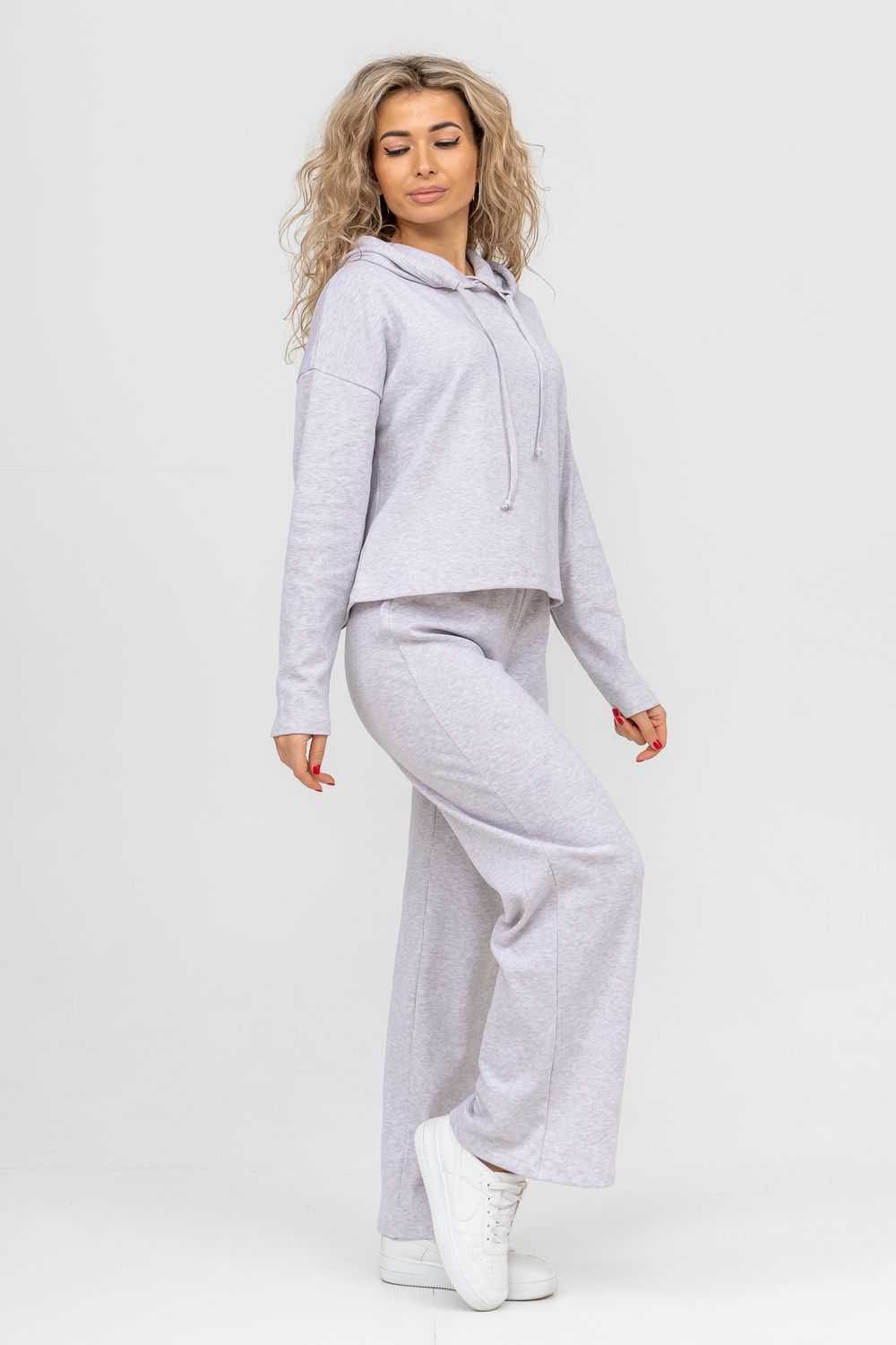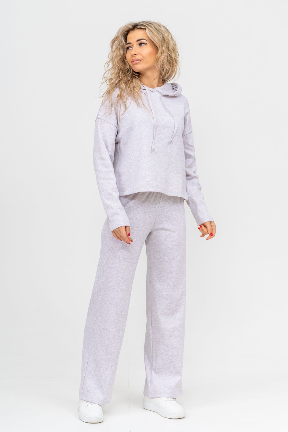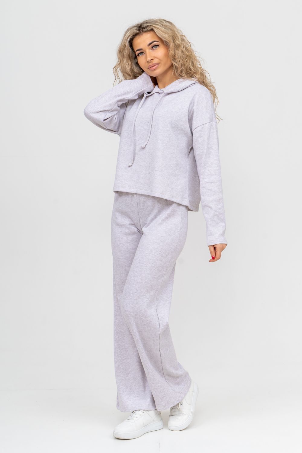 Стильный костюм выполнен из кашкорсе с начёсом. Ткань гладкая с лица и ворсистая с начёсом с изнанки, неприхотлива в уходе и приятная на ощупь. Благодаря особой мягкости, комфортности при носке, дышащей структуре полотна, эта разновидность французского трикотажа широко распространилась по миру. Материал гигроскопичен, поэтому хорошо держит тепло и позволяет телу дышать. Широкие брюки в стиле палаццо - это находка этого сезона. Пояс брюк выполнен на специализированной поясной машине, что делает его максимально качественным. Толстовка свободная, с капюшоном, спущенной линией плеча и слегка удлинённым рукавом. Всё это делает мягкий приятный к телу костюм по настоящему любимым! Костюм можно надевать дома, в качестве повседневной одежды, на работу, в поездку или деловую встречу. Свободный прямой крой свитшота и брюк хорошо скрывает несовершенства, подчеркивает достоинства фигуры и изящный силуэт. Толстовку и брюки можно носить как вместе, так и отдельно. Однотонный дизайн без принта, надписей и декоративных элементов будет гармонировать с любым стилем одежды. Свитшот с длинным рукавом, спущенным плечом можно легко сочетать с джинсами и юбками. Длина рукава указана от точки основания шеи. К брюкам свободной формы можно подобрать абсолютно любой верх. Дополнить образ можно любимыми аксессуарами и украшениями. Стильный, модный брючный костюм, спортивный женский теплый, могут носить девочки - подростки, взрослые и беременные женщины. Так же костюм можно взять для отдыха и йоги, взять с собой в отпуск или в путешествие. Комплект из свитшота и свободных брюк станет удобной прогулочной одеждой на любой сезон. Желаем Вам прекрасного настроения и приятных покупок!