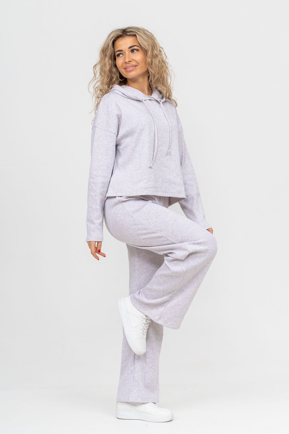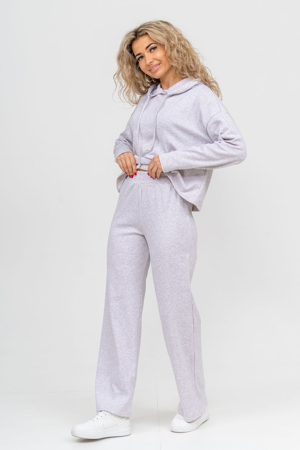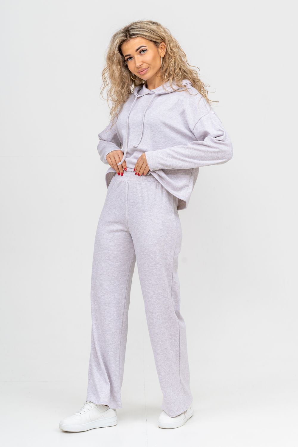 Стильный костюм выполнен из кашкорсе с начёсом. Ткань гладкая с лица и ворсистая с начёсом с изнанки, неприхотлива в уходе и приятная на ощупь. Благодаря особой мягкости, комфортности при носке, дышащей структуре полотна, эта разновидность французского трикотажа широко распространилась по миру. Материал гигроскопичен, поэтому хорошо держит тепло и позволяет телу дышать. Широкие брюки в стиле палаццо - это находка этого сезона. Пояс брюк выполнен на специализированной поясной машине, что делает его максимально качественным. Толстовка свободная, с капюшоном, спущенной линией плеча и слегка удлинённым рукавом. Всё это делает мягкий приятный к телу костюм по настоящему любимым! Костюм можно надевать дома, в качестве повседневной одежды, на работу, в поездку или деловую встречу. Свободный прямой крой свитшота и брюк хорошо скрывает несовершенства, подчеркивает достоинства фигуры и изящный силуэт. Толстовку и брюки можно носить как вместе, так и отдельно. Однотонный дизайн без принта, надписей и декоративных элементов будет гармонировать с любым стилем одежды. Свитшот с длинным рукавом, спущенным плечом можно легко сочетать с джинсами и юбками. Длина рукава указана от точки основания шеи. К брюкам свободной формы можно подобрать абсолютно любой верх. Дополнить образ можно любимыми аксессуарами и украшениями. Стильный, модный брючный костюм, спортивный женский теплый, могут носить девочки - подростки, взрослые и беременные женщины. Так же костюм можно взять для отдыха и йоги, взять с собой в отпуск или в путешествие. Комплект из свитшота и свободных брюк станет удобной прогулочной одеждой на любой сезон. Желаем Вам прекрасного настроения и приятных покупок!