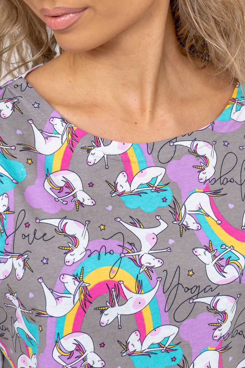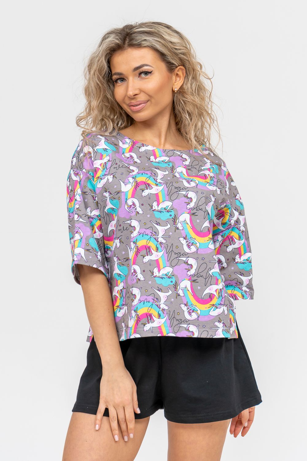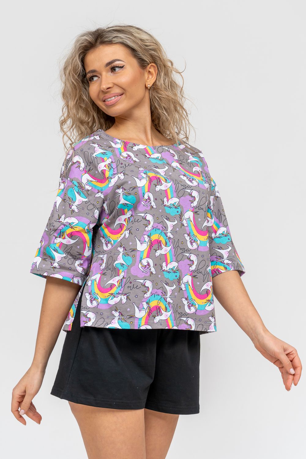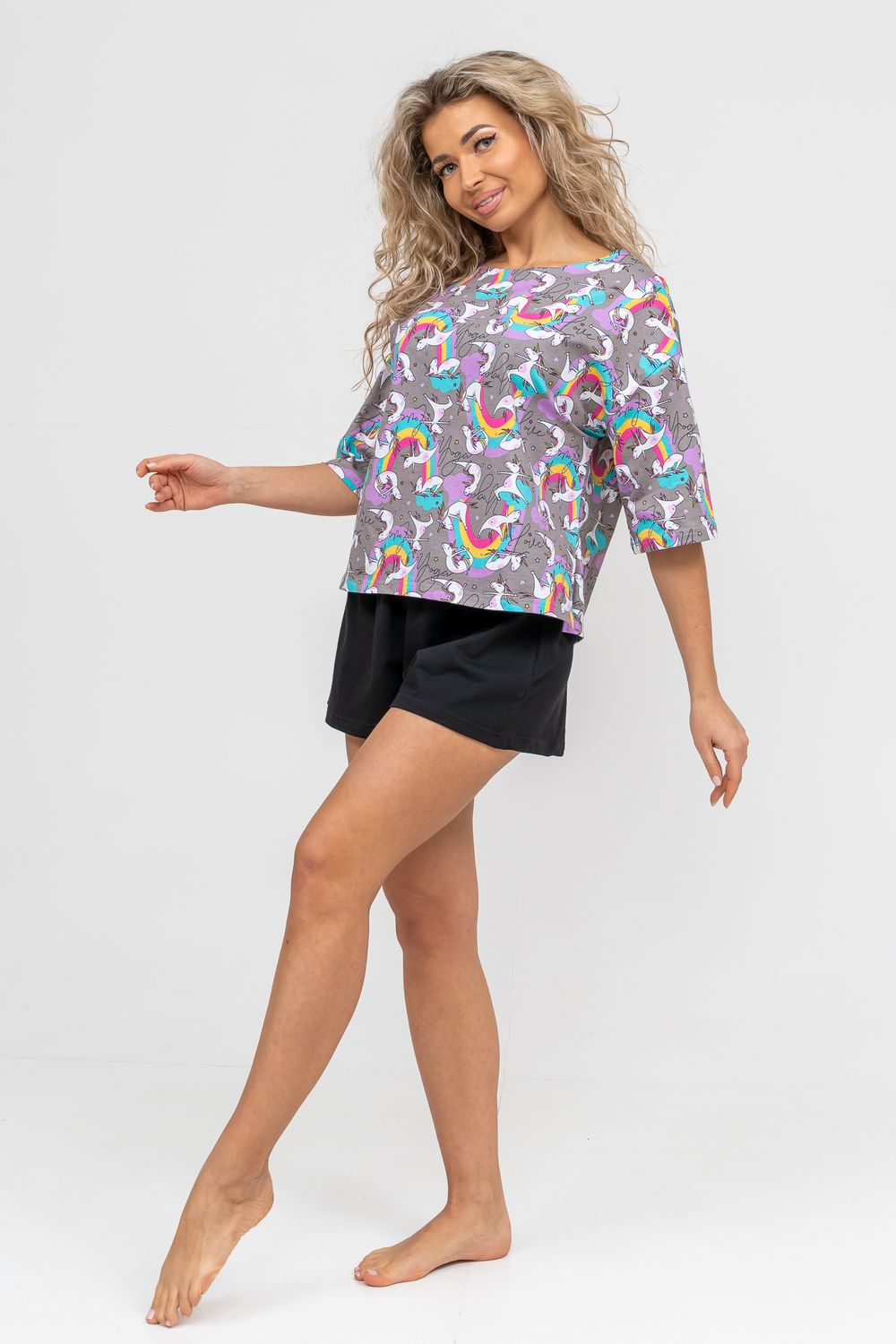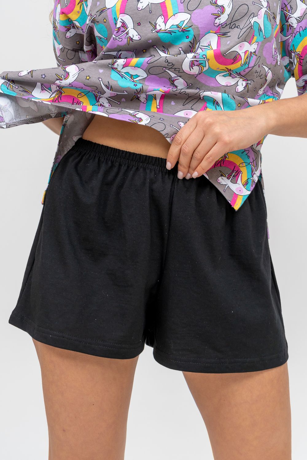 Женский модный костюм - это невероятно удобный вариант одежды для дома, сна, отдыха или пижамной вечеринки. Домашний костюм двойка сшит из натурального хлопка, лёгкого и приятного материала. Пижама состоит из свободной футболки с новым трендовым дизайном ткани и свободных шорт. Стильный костюм комфортно садится по фигуре, выглядит женственно и привлекательно, очаровывая всех. А также модель такого плана - это отличная идея для полезного и практичного подарка на день рождения, 14 февраля, 8 марта и любой другой праздник. Мы уверены, что эта хлопковая пижама подарит Вам истинное наслаждение при каждодневном использовании. Выбирайте деликатный способ стирки при температуре 30°С, тогда домашний комплект прослужит долго.