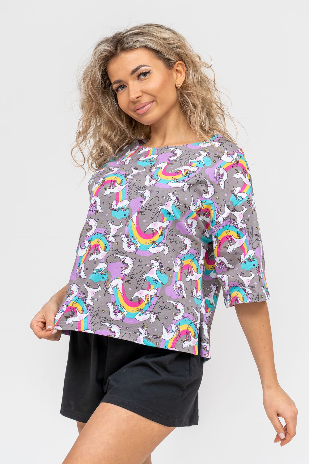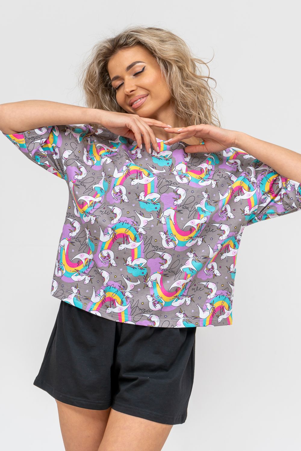 Женский модный костюм - это невероятно удобный вариант одежды для дома, сна, отдыха или пижамной вечеринки. Домашний костюм двойка сшит из натурального хлопка, лёгкого и приятного материала. Пижама состоит из свободной футболки с новым трендовым дизайном ткани и свободных шорт. Стильный костюм комфортно садится по фигуре, выглядит женственно и привлекательно, очаровывая всех. А также модель такого плана - это отличная идея для полезного и практичного подарка на день рождения, 14 февраля, 8 марта и любой другой праздник. Мы уверены, что эта хлопковая пижама подарит Вам истинное наслаждение при каждодневном использовании. Выбирайте деликатный способ стирки при температуре 30°С, тогда домашний комплект прослужит долго.