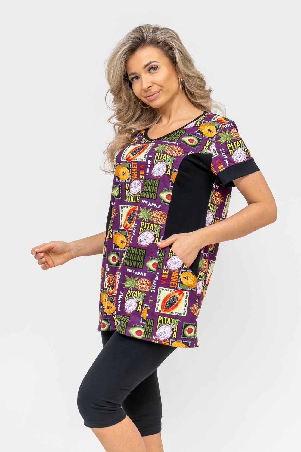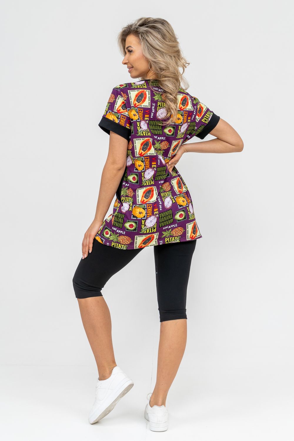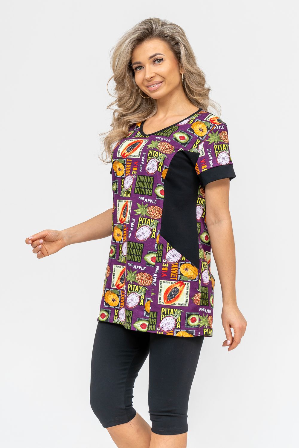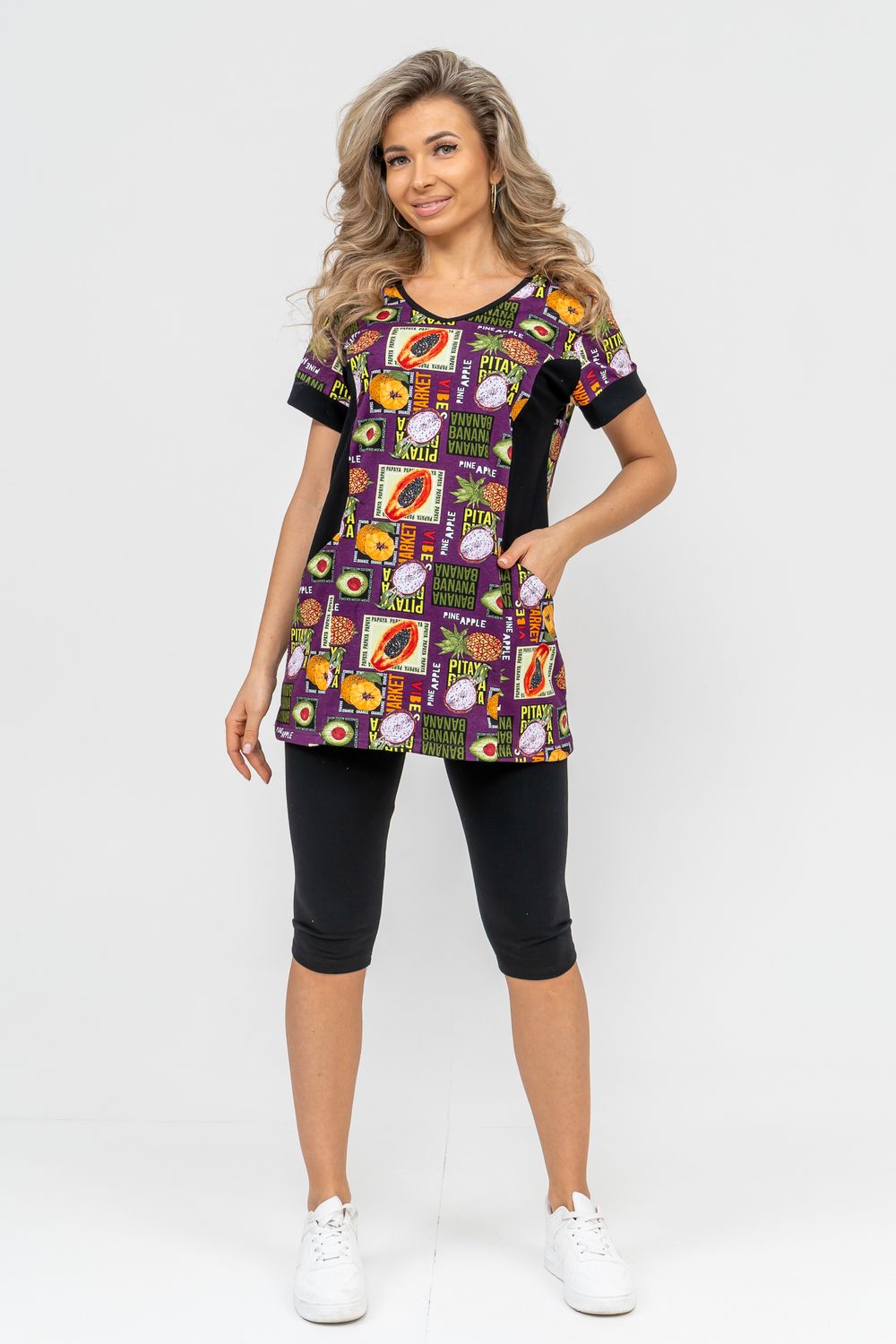 Женский костюм полуприлегающего силуэта состоит из туники и бриджей. 100% дышащий хлопок туники и эластичная вискоза бриджей несут в себе удобство при носке, гигроскопичность и износостойкость. V-образный вырез горловины придаёт изделию женственный вид. Для удобства туника имеет вместительные накладные карманы и втачные рукава с манжетами. Рельефы на полочке изделия создают идеальную посадку и безупречный внешний вид. Бриджи на резинке с высокой посадкой. В костюме такого плана Вы будете чувствовать себя комфортно как дома, так и на любимой даче. Эта двойка идеально подойдет для летнего отдыха на даче, на море или просто для девушек, которые хотят чувствовать себя уютно и комфортно дома. Летний женский костюм подходит для поездок и путешествий, загородного отдыха на природе, а также для получения лечения в больнице или санатории. Повседневное хлопковое изделие с бриджами - отличная идея для подарка любимой жене, маме, сестре или подруге на день рождения, 8 Марта или по любому другому приятному поводу. Рекомендация: для того чтобы продлить яркую жизнь Вашему костюму для дома и отдыха из хлопка, стирку производить при температуре не выше 30 градусов, а во избежание деформации изделия не прибегать к ручному отжиму (не перекручивать), утюжить слегка недосушенное изделие утюгом на паровом режиме. Покупайте наши красивые и удобные домашние костюмы с бриджами и носите с удовольствием! Приятных покупок!