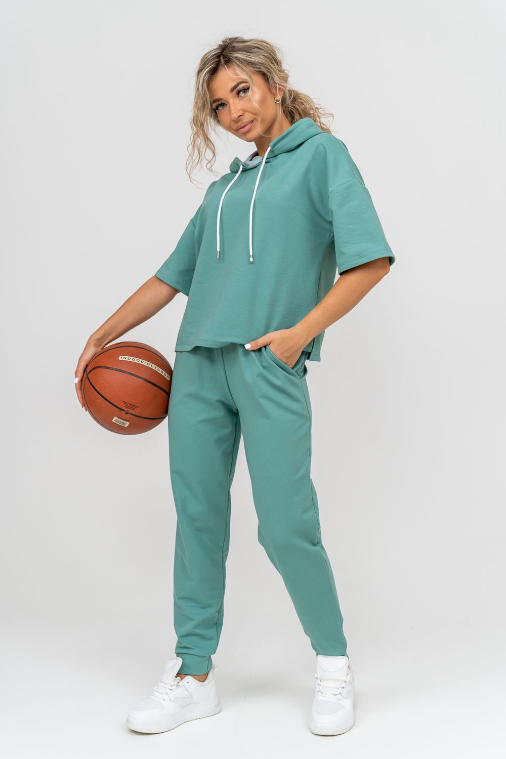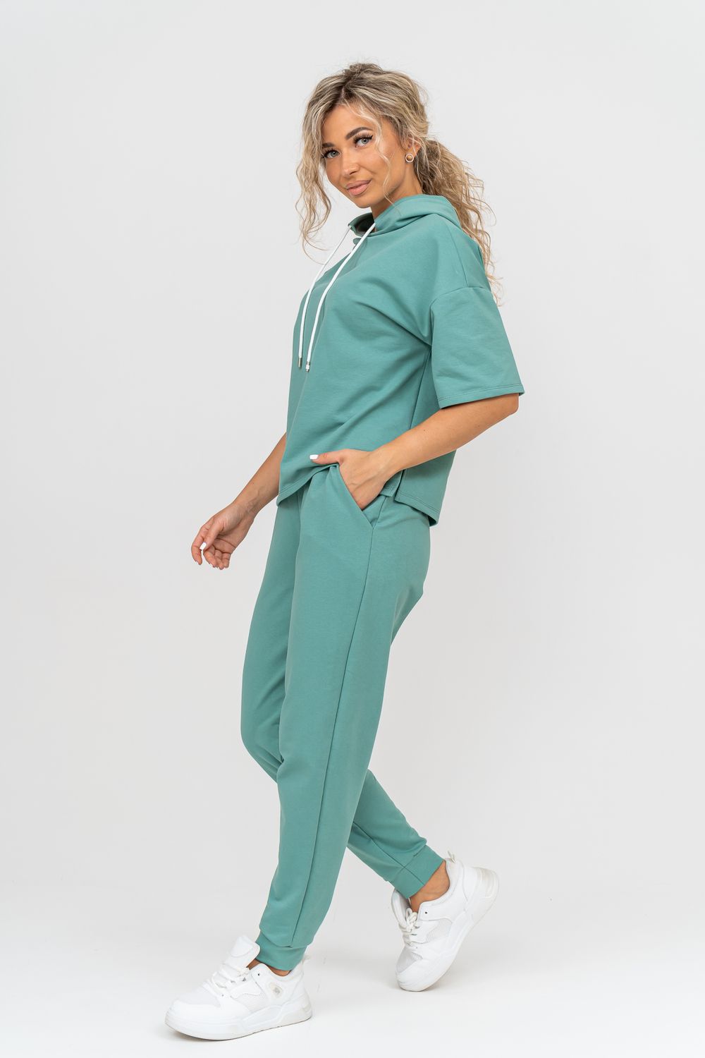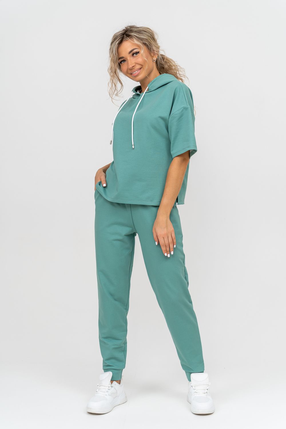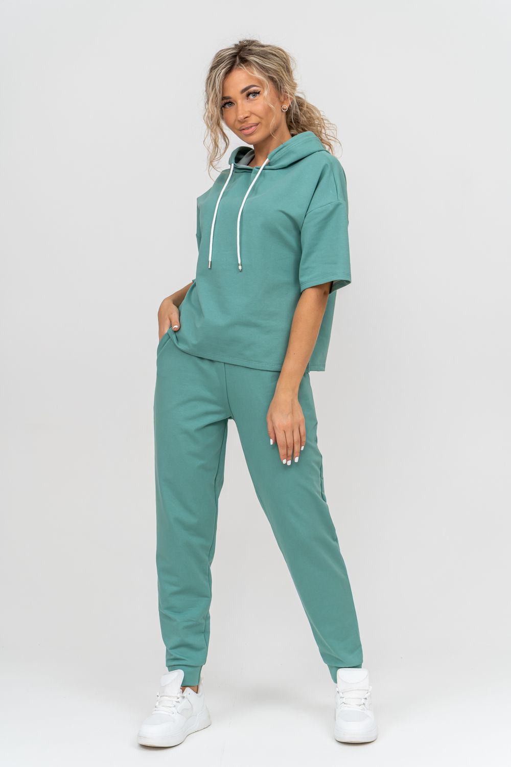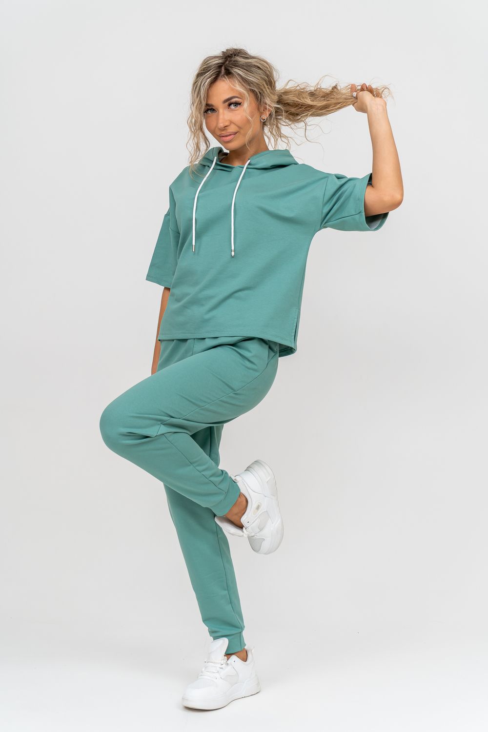 Женский костюм выполнен из футера высокого качества с хлопком и небольшим добавлением полиэстера и лайкры, что позволяет изделию не скатываться и оставлять идеальный внешний вид на долгое время. Костюм состоит из толстовки и брюк. Толстовка с капюшоном и шнурком. Линия плеча спущена, рукав укороченный, по бокам имеются небольшие разрезы. Брюки представлены с вместительными боковыми карманами. Манжеты брюк выполнены из основного материала, а пояс на специализированной поясной машине, что делает швы ровными и качественными. Свободный крой прекрасно будет смотреться на дамах с любыми формами. Костюм такого плана представлен в широкой размерной сетке, что позволяет выбрать его как девушке, так и женщине. Однотонный костюм модных расцветок будет удачным выбором для поездок в отпуск, на пикник, для школы, для активного отдыха и прогулок по городу. Будет гармонично сочетаться как с кроссовками, так и с туфлями, балетками или босоножками. Используя эту модель в качестве домашнего костюма, Вы поймёте, что это именно тот самый идеальный вариант, в котором будете себя чувствовать удобно, комфортно и современно. Костюм с брюками - это настоящая находка для тех, кто ценит свою индивидуальность!