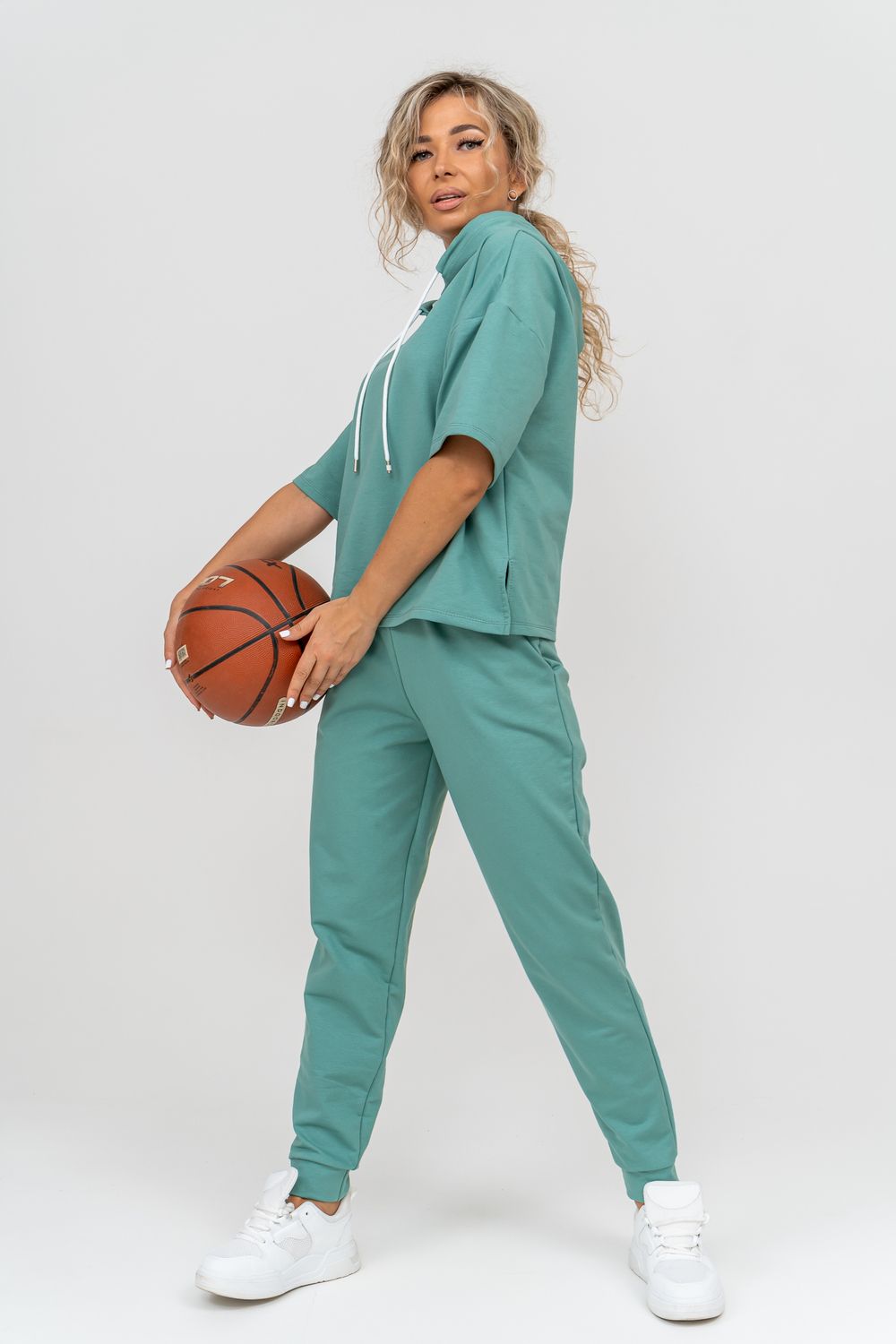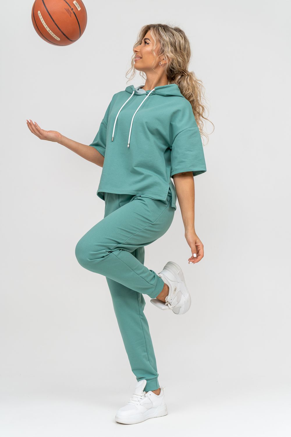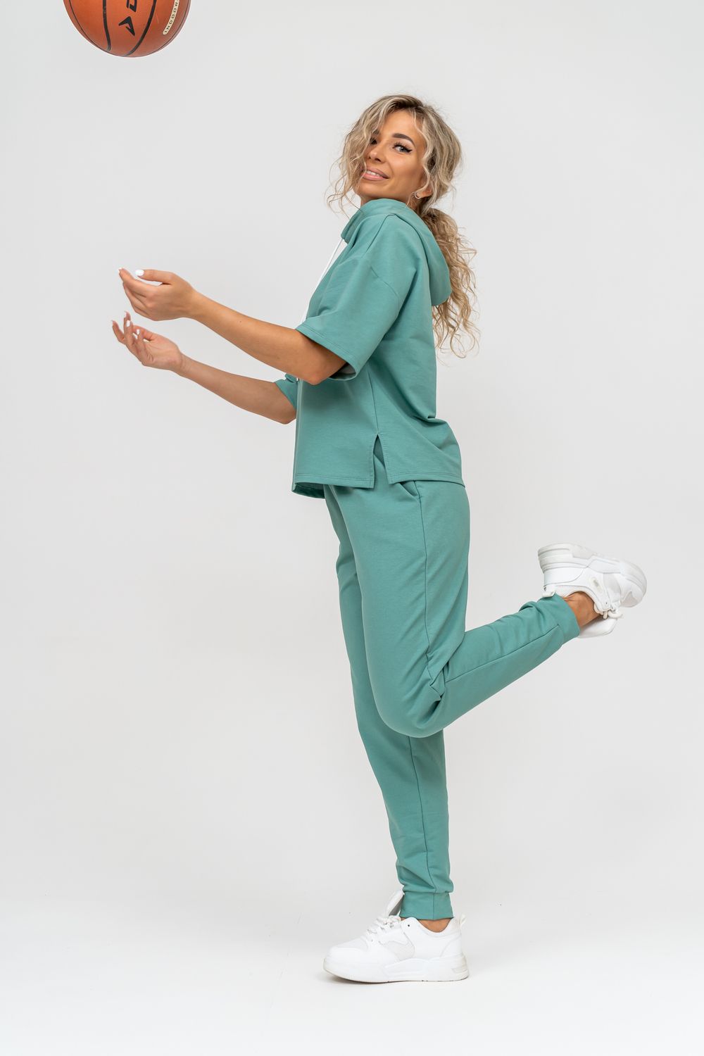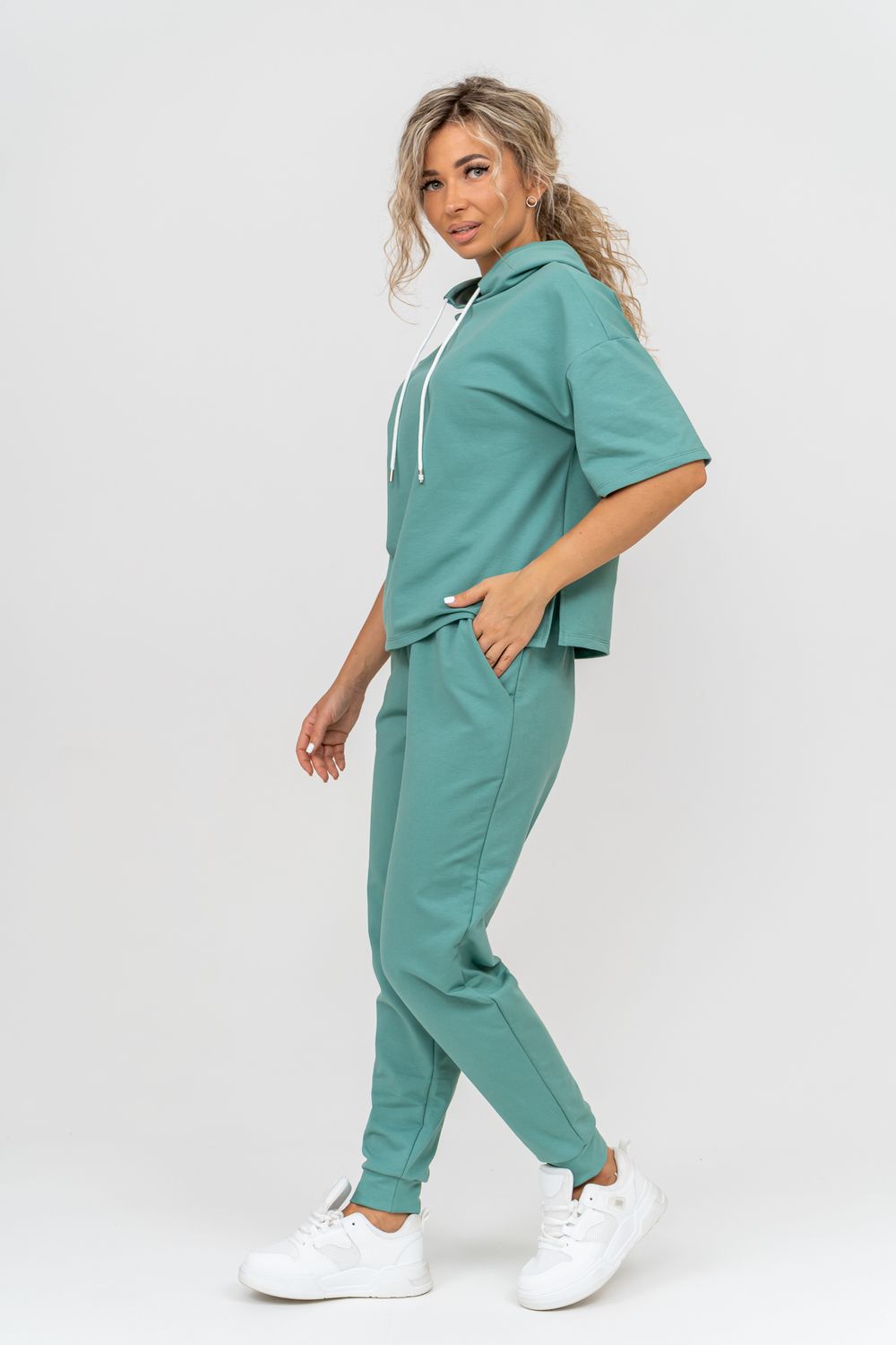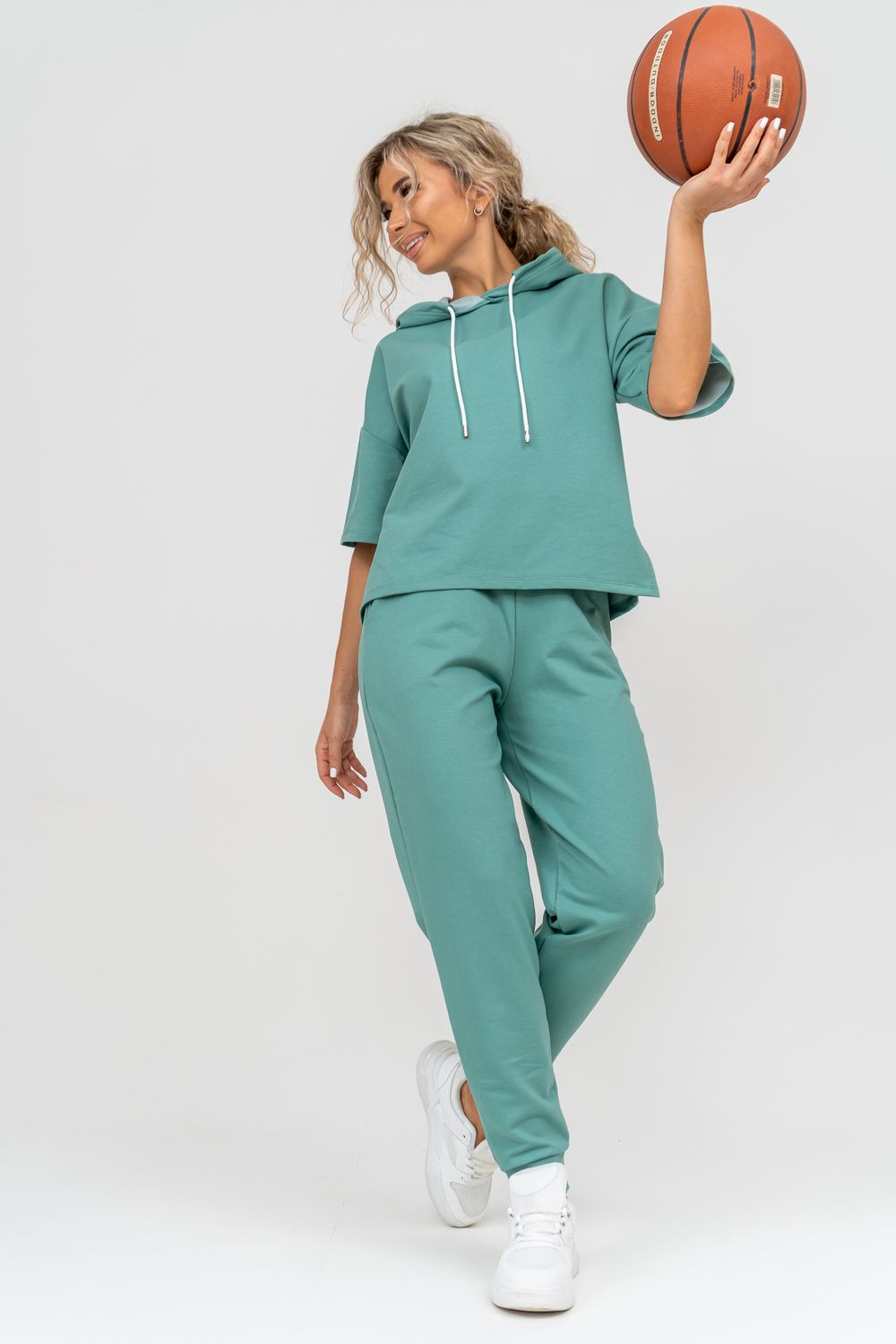 Женский костюм выполнен из футера высокого качества с хлопком и небольшим добавлением полиэстера и лайкры, что позволяет изделию не скатываться и оставлять идеальный внешний вид на долгое время. Костюм состоит из толстовки и брюк. Толстовка с капюшоном и шнурком. Линия плеча спущена, рукав укороченный, по бокам имеются небольшие разрезы. Брюки представлены с вместительными боковыми карманами. Манжеты брюк выполнены из основного материала, а пояс на специализированной поясной машине, что делает швы ровными и качественными. Свободный крой прекрасно будет смотреться на дамах с любыми формами. Костюм такого плана представлен в широкой размерной сетке, что позволяет выбрать его как девушке, так и женщине. Однотонный костюм модных расцветок будет удачным выбором для поездок в отпуск, на пикник, для школы, для активного отдыха и прогулок по городу. Будет гармонично сочетаться как с кроссовками, так и с туфлями, балетками или босоножками. Используя эту модель в качестве домашнего костюма, Вы поймёте, что это именно тот самый идеальный вариант, в котором будете себя чувствовать удобно, комфортно и современно. Костюм с брюками - это настоящая находка для тех, кто ценит свою индивидуальность!