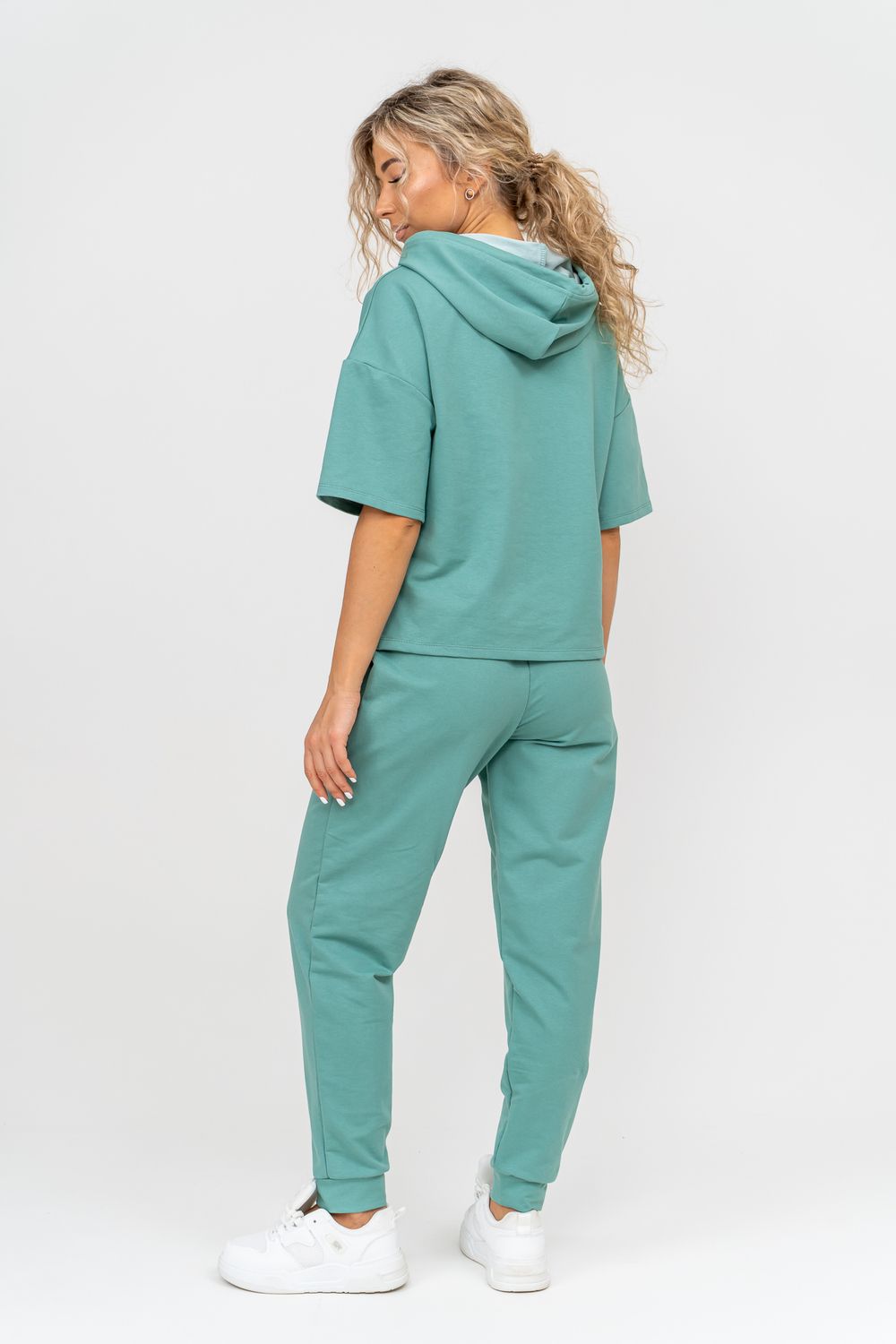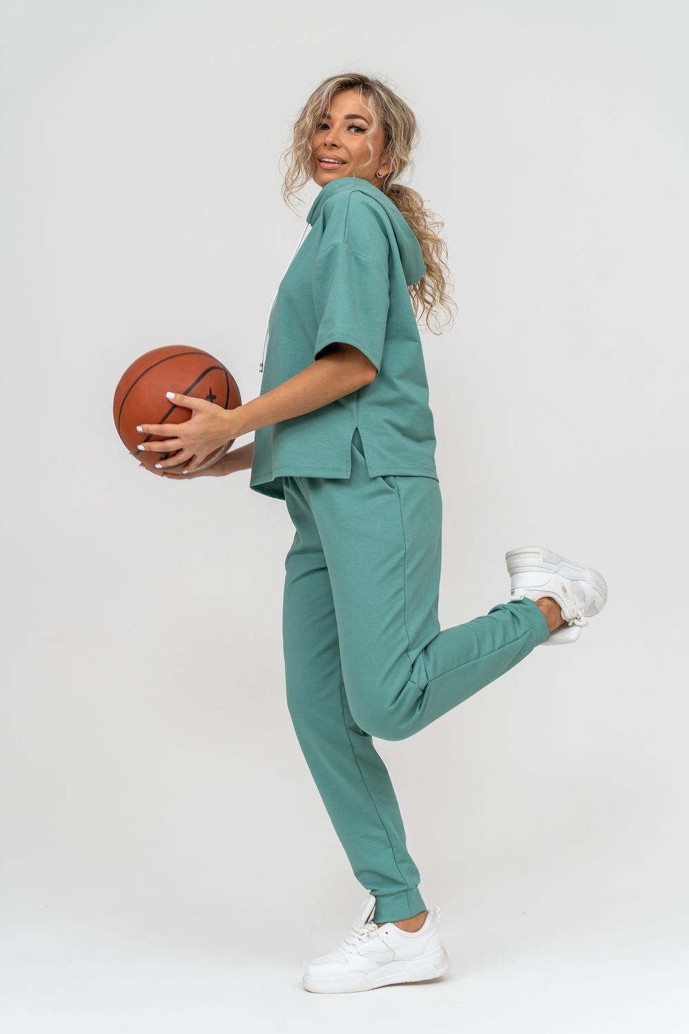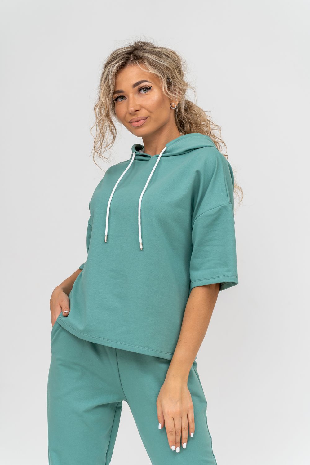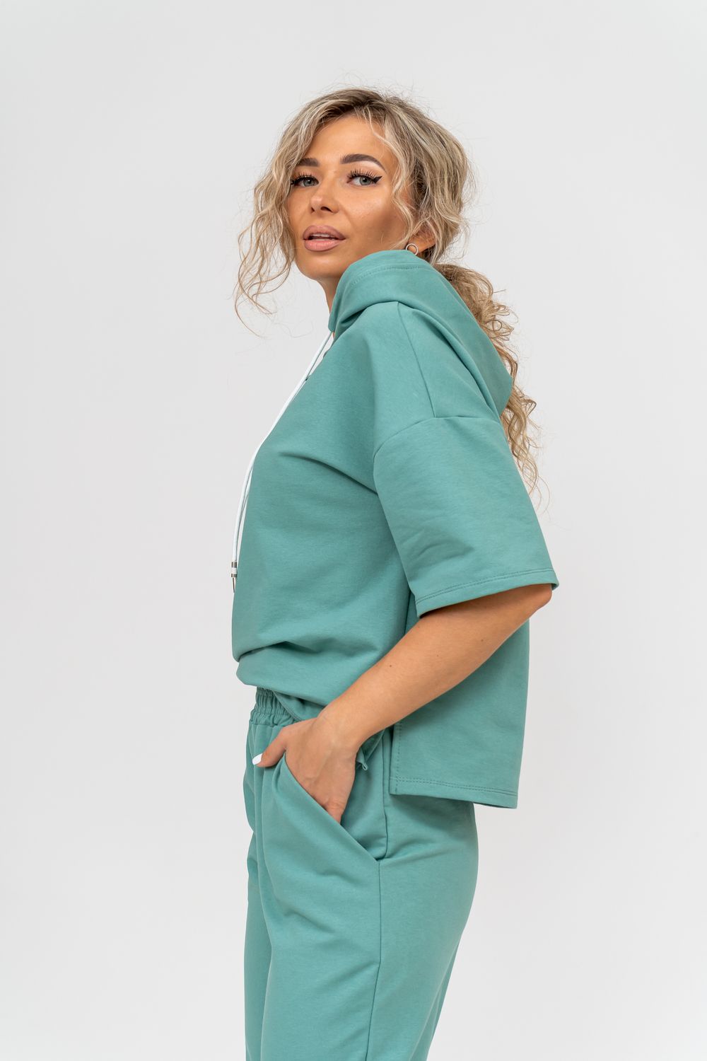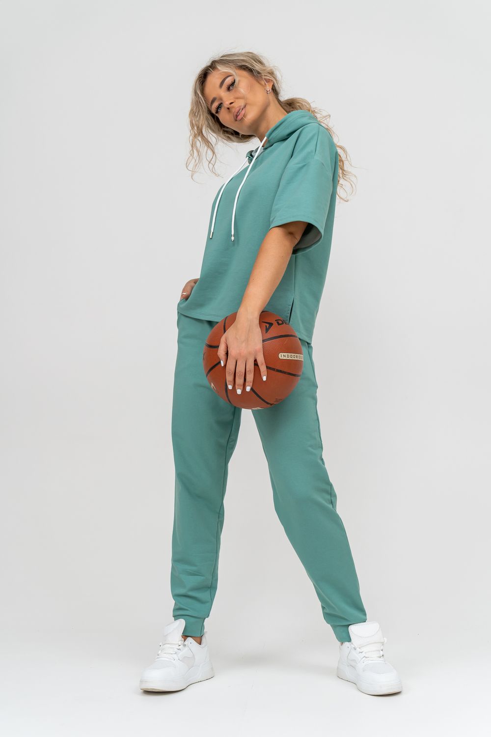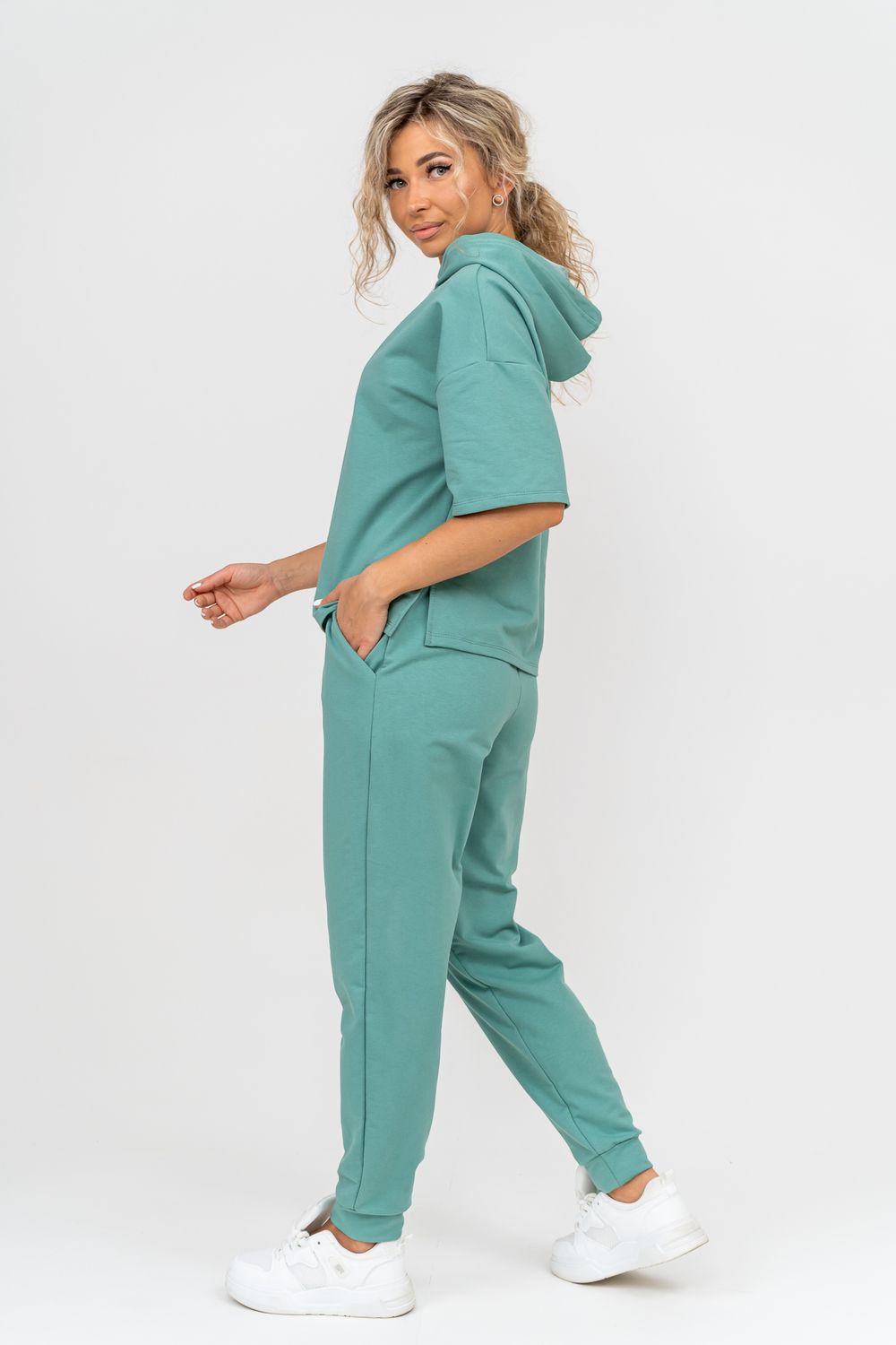 Женский костюм выполнен из футера высокого качества с хлопком и небольшим добавлением полиэстера и лайкры, что позволяет изделию не скатываться и оставлять идеальный внешний вид на долгое время. Костюм состоит из толстовки и брюк. Толстовка с капюшоном и шнурком. Линия плеча спущена, рукав укороченный, по бокам имеются небольшие разрезы. Брюки представлены с вместительными боковыми карманами. Манжеты брюк выполнены из основного материала, а пояс на специализированной поясной машине, что делает швы ровными и качественными. Свободный крой прекрасно будет смотреться на дамах с любыми формами. Костюм такого плана представлен в широкой размерной сетке, что позволяет выбрать его как девушке, так и женщине. Однотонный костюм модных расцветок будет удачным выбором для поездок в отпуск, на пикник, для школы, для активного отдыха и прогулок по городу. Будет гармонично сочетаться как с кроссовками, так и с туфлями, балетками или босоножками. Используя эту модель в качестве домашнего костюма, Вы поймёте, что это именно тот самый идеальный вариант, в котором будете себя чувствовать удобно, комфортно и современно. Костюм с брюками - это настоящая находка для тех, кто ценит свою индивидуальность!