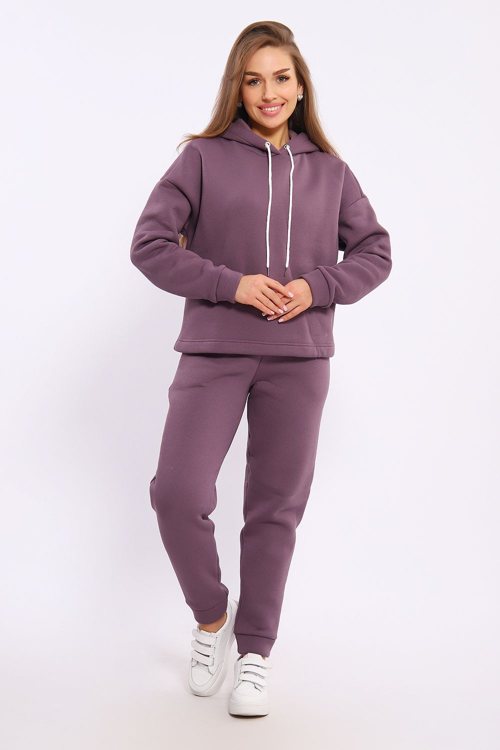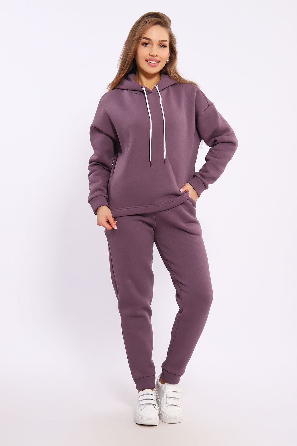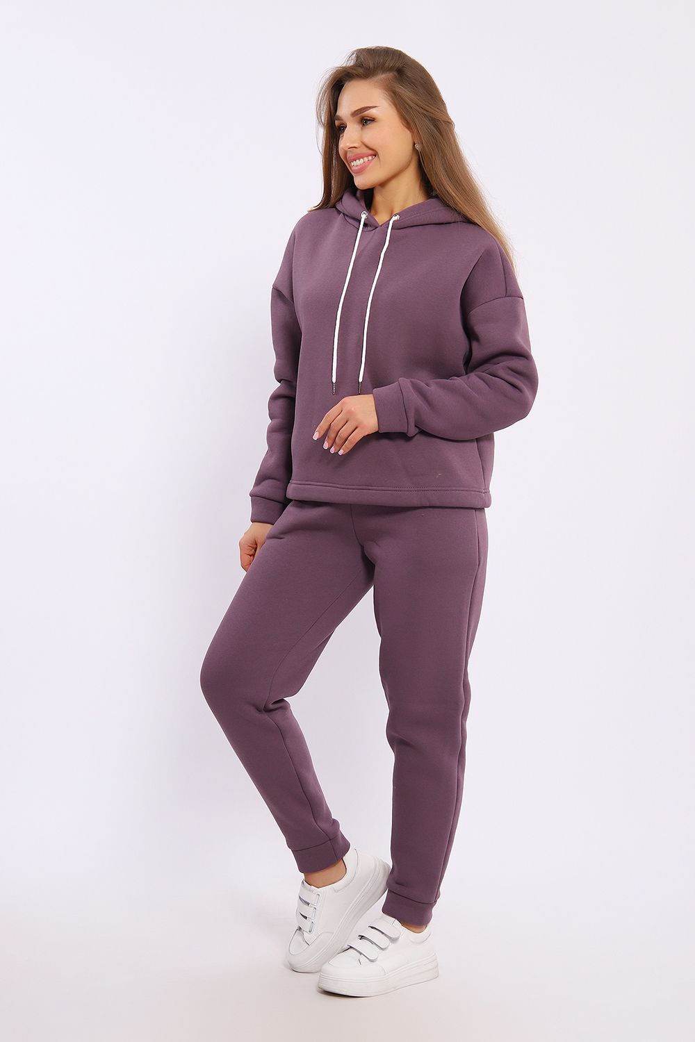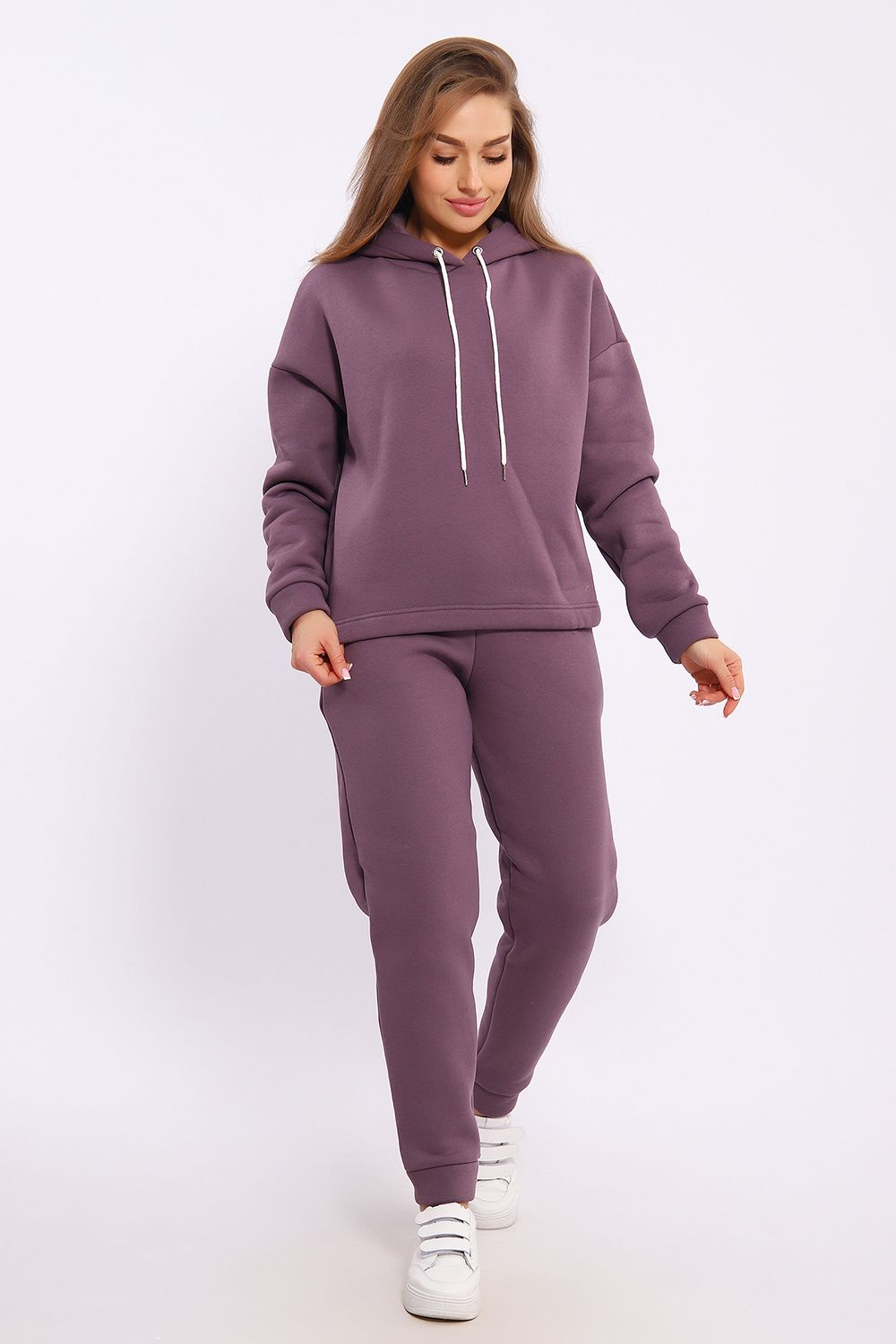 Женский модный костюм выполнен из футера 3-х нитки с начёсом - это самый толстый, плотный и тёплый вид трикотажа в своей группе. Данный вид футера имеет множество достоинств: натуральный состав, теплорегуляция, гипоаллергенность, прочность, формоустойчивость (при правильном уходе и стирке 30 - 40 °С). Костюм состоит из толстовки и брюк. Толстовка с капюшоном и шнурком. Линия плеча спущена, длинный рукав. По низу толстовки имеется резинка с фиксатором, с помощью которой Вы можете собрать изделие как вам хочется и нравится. Брюки представлены с вместительными боковыми карманами. Манжеты брюк выполнены из основного материала, а пояс на специализированной поясной машине, что делает швы ровными и качественными. Свободный крой прекрасно будет смотреться на дамах с любыми формами. Костюм такого плана представлен в широкой размерной сетке, что позволяет выбрать его как девушке, так и женщине. Однотонный костюм модных расцветок будет удачным выбором для поездок в отпуск, на пикник, для школы, для активного отдыха и прогулок по городу. Будет гармонично сочетаться как с кроссовками, так и с ботинками. Используя эту модель в качестве домашнего костюма, Вы поймёте, что это именно тот самый идеальный вариант, в котором будете себя чувствовать удобно, комфортно и современно. Костюм с брюками - это настоящая находка для тех, кто ценит свою индивидуальность!