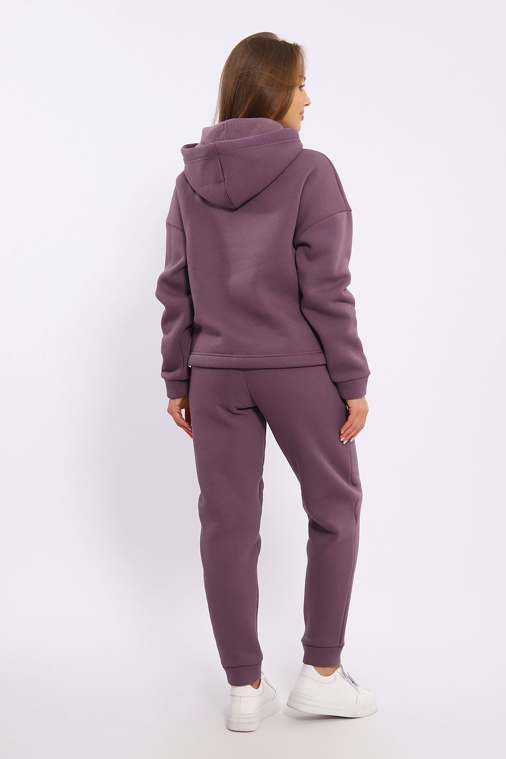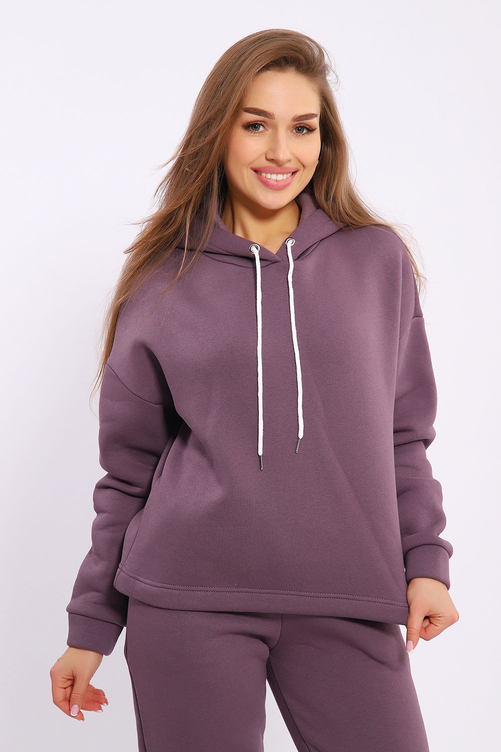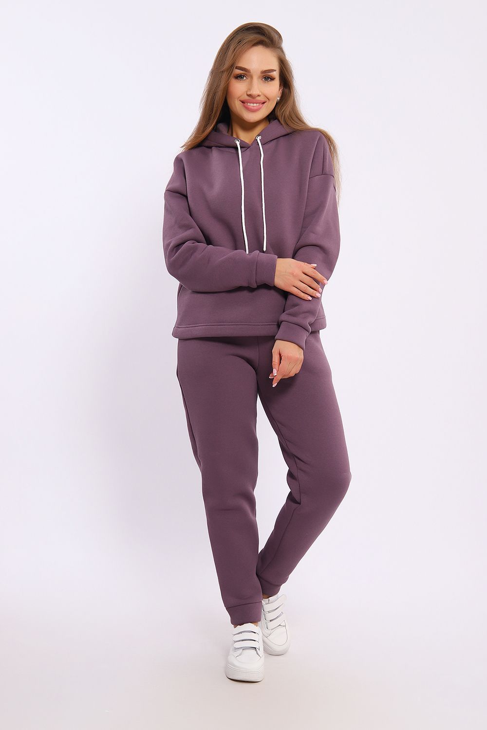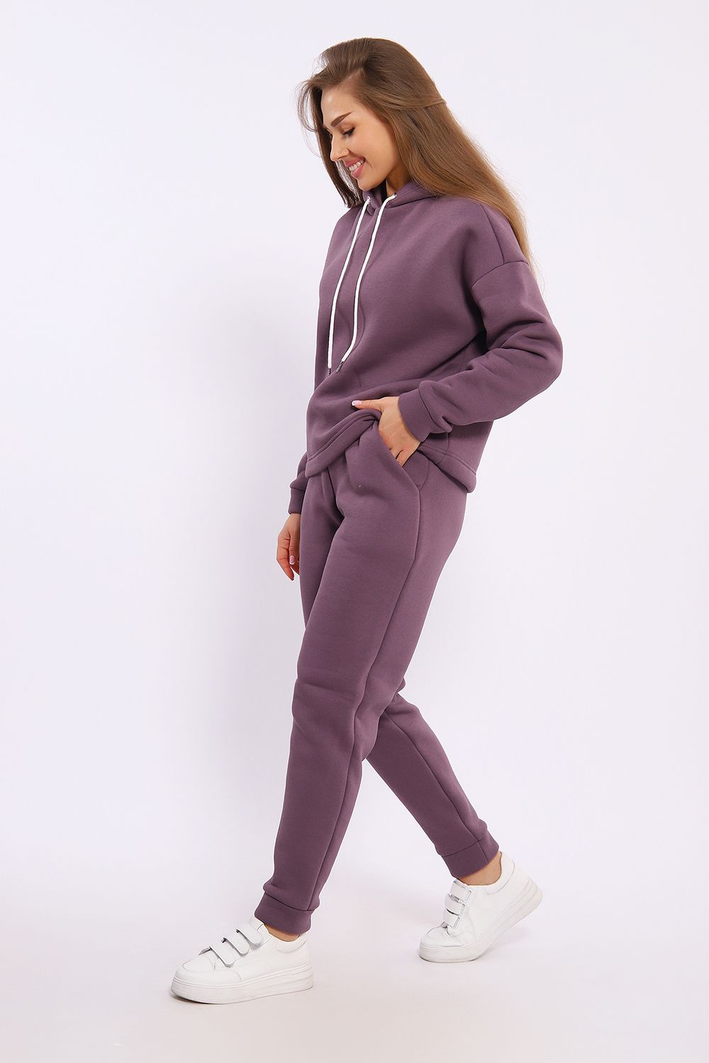 Женский модный костюм выполнен из футера 3-х нитки с начёсом - это самый толстый, плотный и тёплый вид трикотажа в своей группе. Данный вид футера имеет множество достоинств: натуральный состав, теплорегуляция, гипоаллергенность, прочность, формоустойчивость (при правильном уходе и стирке 30 - 40 °С). Костюм состоит из толстовки и брюк. Толстовка с капюшоном и шнурком. Линия плеча спущена, длинный рукав. По низу толстовки имеется резинка с фиксатором, с помощью которой Вы можете собрать изделие как вам хочется и нравится. Брюки представлены с вместительными боковыми карманами. Манжеты брюк выполнены из основного материала, а пояс на специализированной поясной машине, что делает швы ровными и качественными. Свободный крой прекрасно будет смотреться на дамах с любыми формами. Костюм такого плана представлен в широкой размерной сетке, что позволяет выбрать его как девушке, так и женщине. Однотонный костюм модных расцветок будет удачным выбором для поездок в отпуск, на пикник, для школы, для активного отдыха и прогулок по городу. Будет гармонично сочетаться как с кроссовками, так и с ботинками. Используя эту модель в качестве домашнего костюма, Вы поймёте, что это именно тот самый идеальный вариант, в котором будете себя чувствовать удобно, комфортно и современно. Костюм с брюками - это настоящая находка для тех, кто ценит свою индивидуальность!