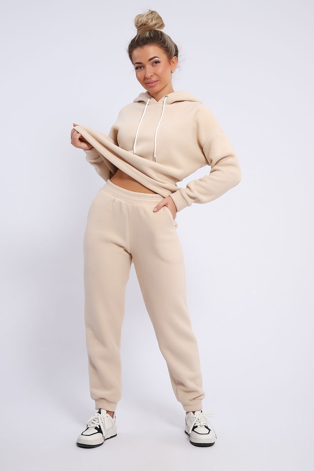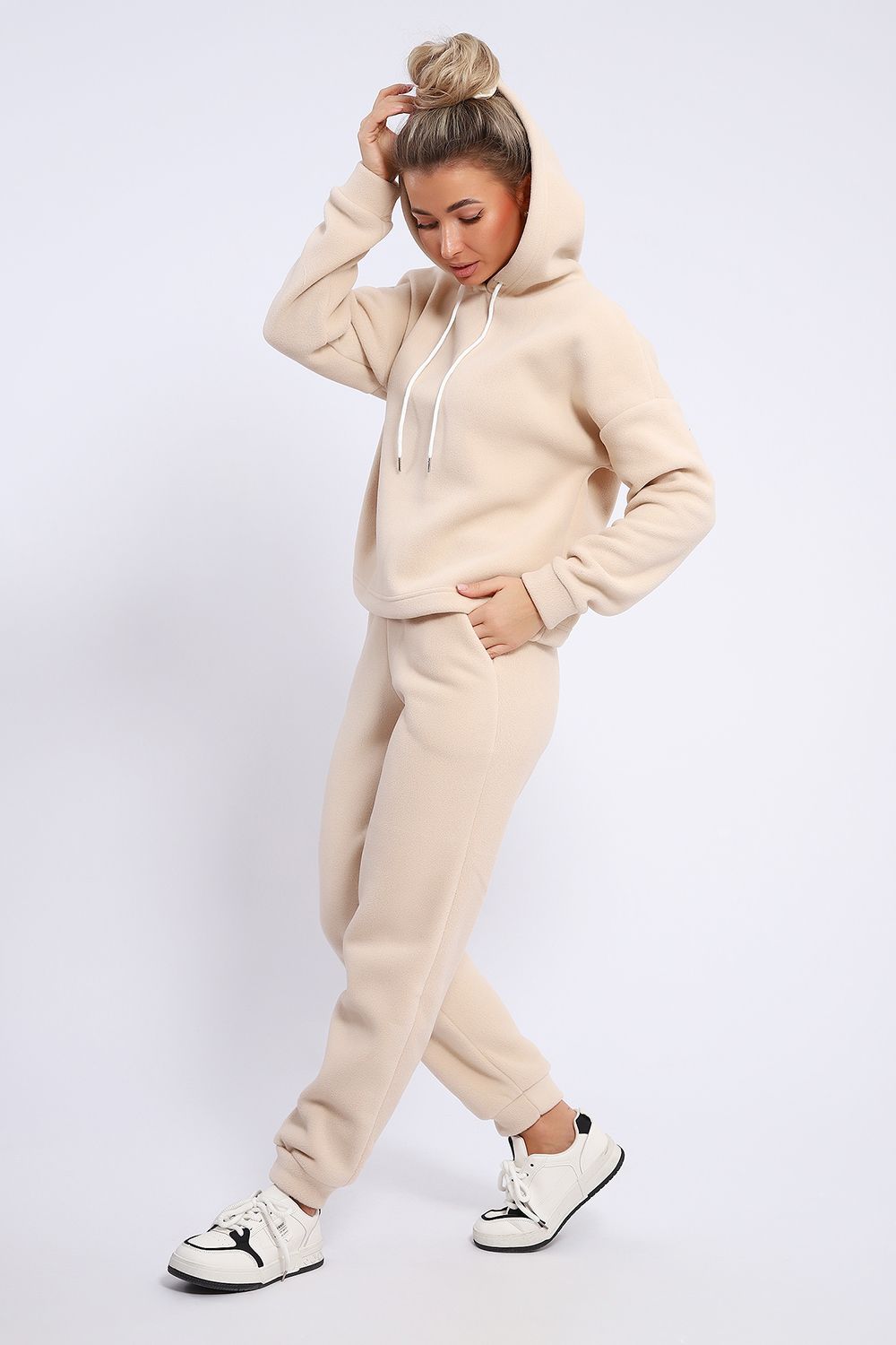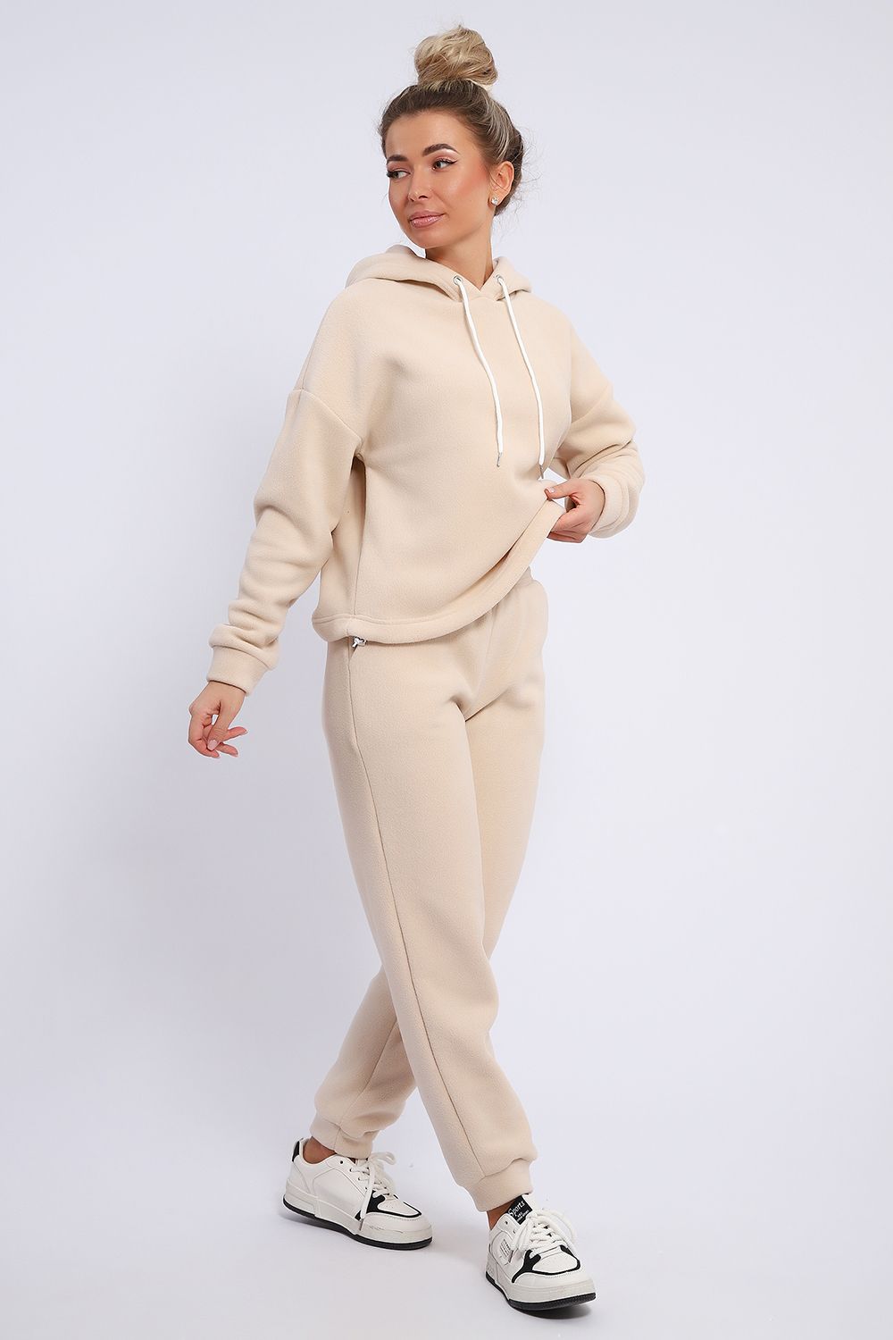Женский костюм выполнен из флиса высокого качества. Флис - ткань с ворсистой поверхностью, что позволяет эффективно сохранять тепло. Материал прочный, эластичный, влагостойкий. Хорошо пропускает влагу, при этом не впитывает ее. По теплостойкости превосходит шерсть, но намного легче. Воздухопроницаемая гигроскопичная ткань создает для тела комфортный микроклимат. Материал гипоаллергенный, подходит для изготовления одежды детям, в том числе новорожденным. Изделия из флиса легкие, не мнутся, не деформируются, не вытягиваются.В такой одежде удобно и комфортно. Эластичность материала позволяет легко двигаться. Костюм состоит из толстовки и брюк. Толстовка с капюшоном и шнурком. Линия плеча спущена, длинный рукав. По низу толстовки имеется резинка с фиксатором, с помощью которой Вы можете собрать изделие как вам хочется и нравится. Брюки представлены с вместительными боковыми карманами. Манжеты брюк выполнены из основного материала, а пояс на специализированной поясной машине, что делает швы ровными и качественными. Свободный крой прекрасно будет смотреться на дамах с любыми формами. Костюм такого плана представлен в широкой размерной сетке, что позволяет выбрать его как девушке, так и женщине. Однотонный костюм модных расцветок будет удачным выбором для поездок в отпуск, на пикник, для школы, для активного отдыха и прогулок по городу. Будет гармонично сочетаться как с кроссовками, так и с ботинками. Используя эту модель в качестве домашнего костюма, Вы поймёте, что это именно тот самый идеальный вариант, в котором будете себя чувствовать удобно, комфортно и современно. Костюм с брюками - это настоящая находка для тех, кто ценит свою индивидуальность!