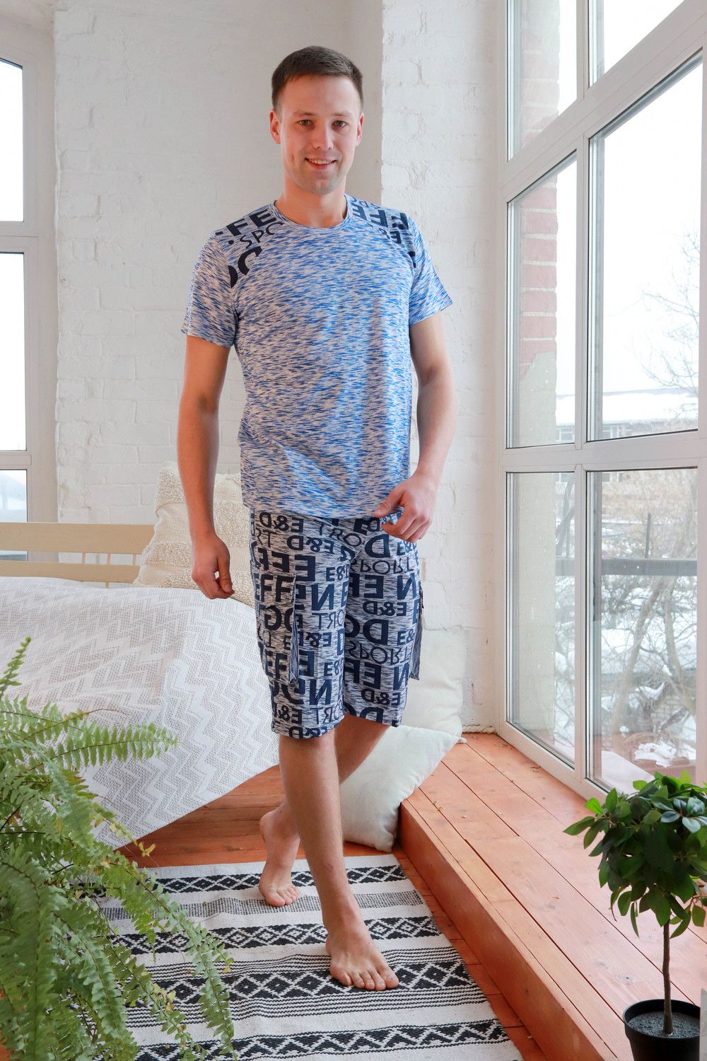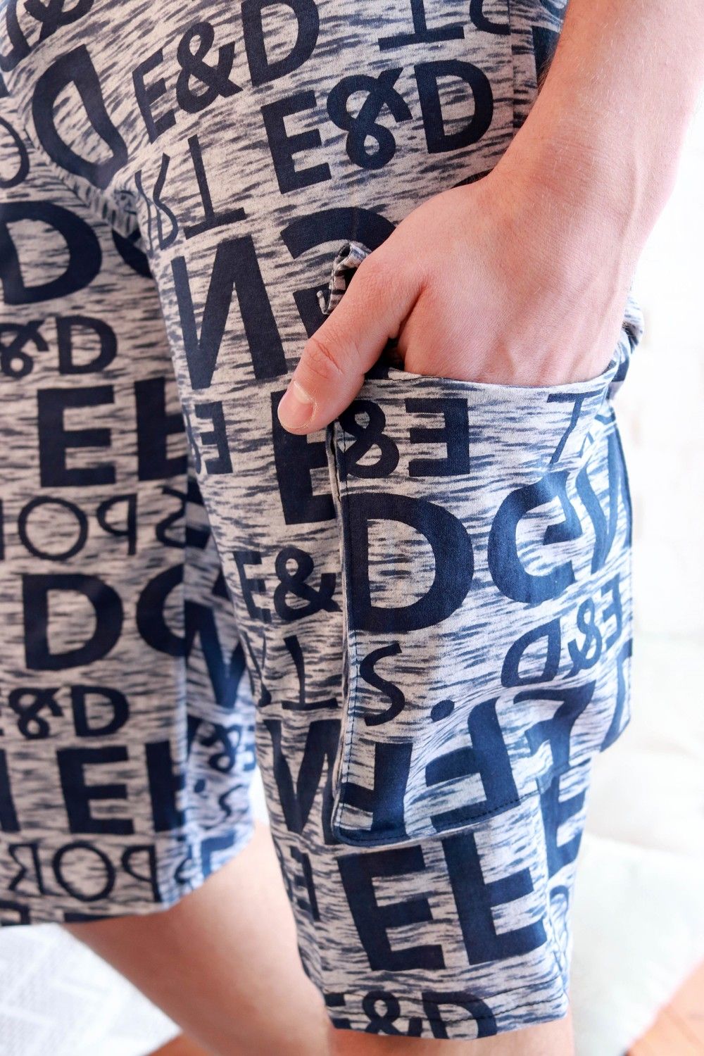 Мужской костюм. В комплекте футболка классического кроя с коротким рукавом. Яркие шорты с карманами, длина чуть ниже колена.